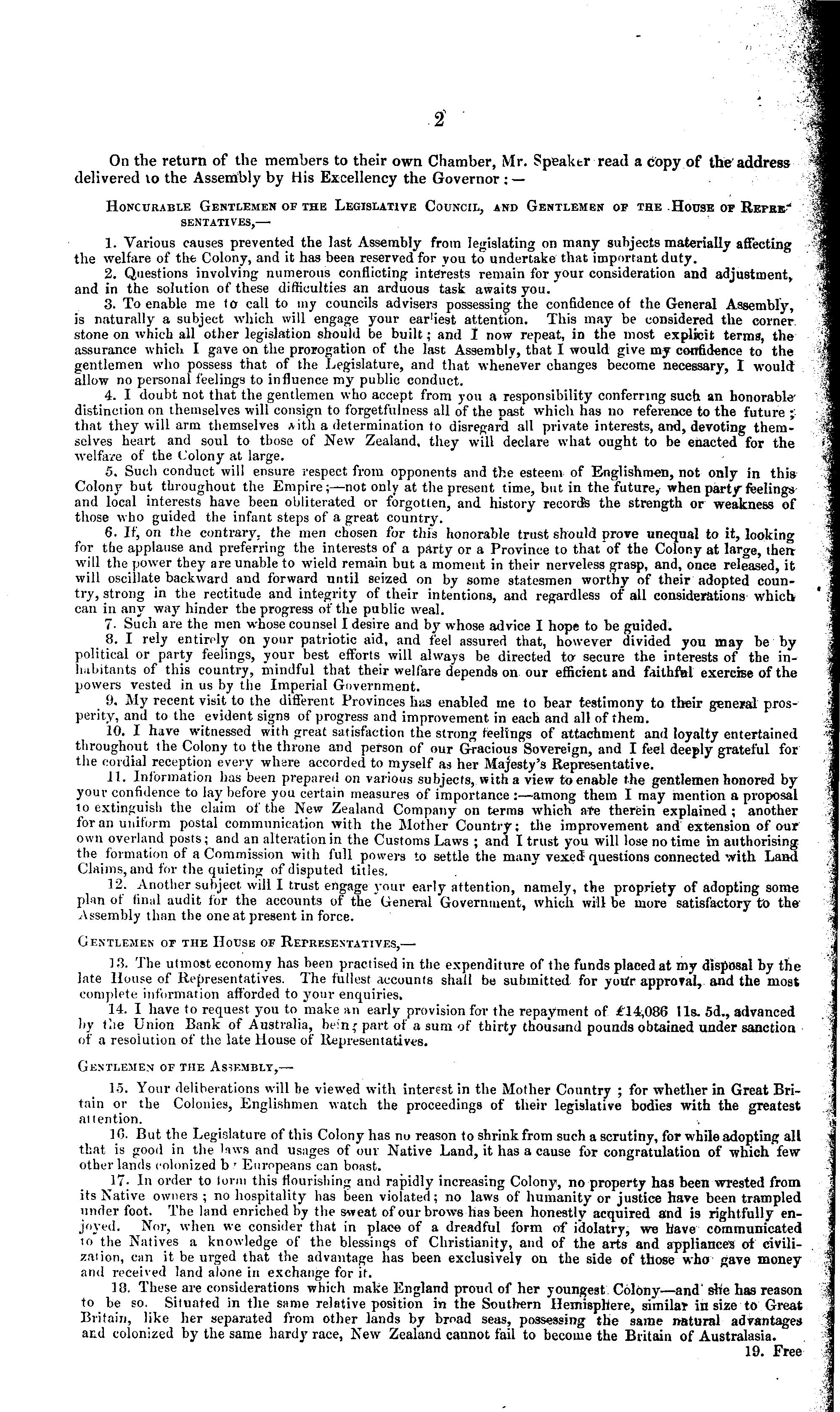 On tlie return of the members to their own Chamber, Mr. Speaker reail a copy of the address delivered 10 the Assembly by His Excellency the Governor : — Honourable Gentlemen of the Legislative Council, and Gentlemen of the House of Refee" SENT ATI VES 3 1. Various causes prevented the last Assembly from legislating on many subjects materially affecting tlie welfare of the Colony, and it has been reserved for vou to undertake that important duty. 2. Questions involving numerous conflicting interests remain for your consideration and adjustment, and in the solution of these difficulties an arduous task awaits you. 3. To enable me tcr call to my councils advisers possessing the confidence of the General Assembly, is naturally a subject which will engage your ear'iest attention. This may be considered the corner stone on which all other legislation should be built; and I now repeat, in the most explicit terms, the assurance which I gave on the prorogation of the last Assembly, that I would give my confidence to tlie gentlemen who possess that of the Legislature, and that whenever changes become necessary, I would allow no personal feelings to influence my public conduct. 4. I doubt not that the gentlemen who accept from you a responsibility conferring such an honorable distinction on themselves will consign to forgetfulness all of the past which has no reference to the future ; that they will arm themselves a ith a determination to disregard all private interests, and, devoting themselves heart and soul to those of New Zealand, they will declare what ought to be enacted for the welfare of the Colony at large. 5. Such conduct will ensure respect from opponents and the esteem of Englishmen, not only in this Colony but throughout the Empirenot only at the present time, but in the future, when part / feelings and local interests have been obliterated or forgotten, and history records the strength or weakness of those who guided the infant steps of a great country. 6. If, on the contrary, the men chosen for this honorable trust should prove unequal to it, looking for the applause and preferring the interests of a party or a Province to that "of the Colony at large, then will the power they are unable to wield remain but a moment in their nerveless grasp, and, once released, it will oscillate backward and forward until seized on by some statesmen worthy of their adopted country, strong in the rectitude and integrity of their intentions, and regardless of all considerations which can in any way hinder the progress of the public weal. 7- Such are the men whose counsel I desire and by whose advice I hope to be guided. 8. I rely entirely on your patriotic aid, and feel assured that, however divided you may be by political or party feelings, your best efforts will always be directed to secure the interests of the inhabitants of this country, mindful that their welfare depends on our efficient and faithful exercise of the powers vested in us by the Imperial Government. 9. My recent visit to the different Provinces has enabled me to bear testimony to their general prosperity, and to the evident signs of progress and improvement in each and all of them. 10. I have witnessed with great satisfaction the strong feelings of attachment and loyalty entertained throughout the Colony to the throne and person of our Gracious Sovereign, and I feel deeply grateful for the cordial reception every where accorded to myself as her Majesty's Representative. 11. Information has been prepared on various subjects, with a view to enable the gentlemen honored by your confidence to lay before you certain measures of importance :—among them I may mention a proposal to extinguish the claim of the New Zealand Company on terms which are therein explained ; another for an uniform postal communication with the Mother Country; the improvement and extension of our own overland posts; and an alteration in the Customs Laws ; and I trust you will lose no time in authorising the formation of a Commission with full powers to settle the many vexed questions connected with Land Claims, and for the quieting of disputed titles. 12. Another subject will I trust engage your early attention, namely, the propriety of adopting some plan of final audit for the accounts of the General Government, which will be more satisfactory to the Assembly than the one at present in force. Gentlemen of the House of Representatives,— ]3. The utmost economy has been practised in the expenditure of the funds placed at my disposal by the late House of Representatives. Ihe fullest accounts shall be submitted for your approval, and the most complete information afforded to your enquiries. 14. I have to request you to make an early provision for the repayment of 114,080 I Is. 5d., advanced by the Union Bank of Australia, beinj part of a sum of thirty thousand pounds obtained under sanction of a resolution of the late House of Representatives. Gentlemen of the Assembly,— 15. Your deliberations will he viewed with interest in the Mother Country ; for whether in Great Britain or the Colonies, Englishmen watch the proceedings of their legislative bodies with the greatest attention. 10. But the Legislature of this Colony has no reason to shrink from such a scrutiny, for while adopting all that is good in the laws and usages of our Native Land, it has a cause for congratulation of which few other lands colonized b ' Europeans can boast. IT- In order to lorm this flourishing and rapidly increasing Colony, no property has been wrested from its Native owners ; no hospitality has been violated; no laws of humanity or justice have been trampled underfoot. The land enriched by the sweat of our brows has been honestly acquired and is rightfully enjoyed. Nor, when we consider that in place of a dreadful form of idolatry, we have communicated 10 the Natives a knowledge of the blessings of Christianity, and of the arts and appliances of civilization, c;in it be urged that the a