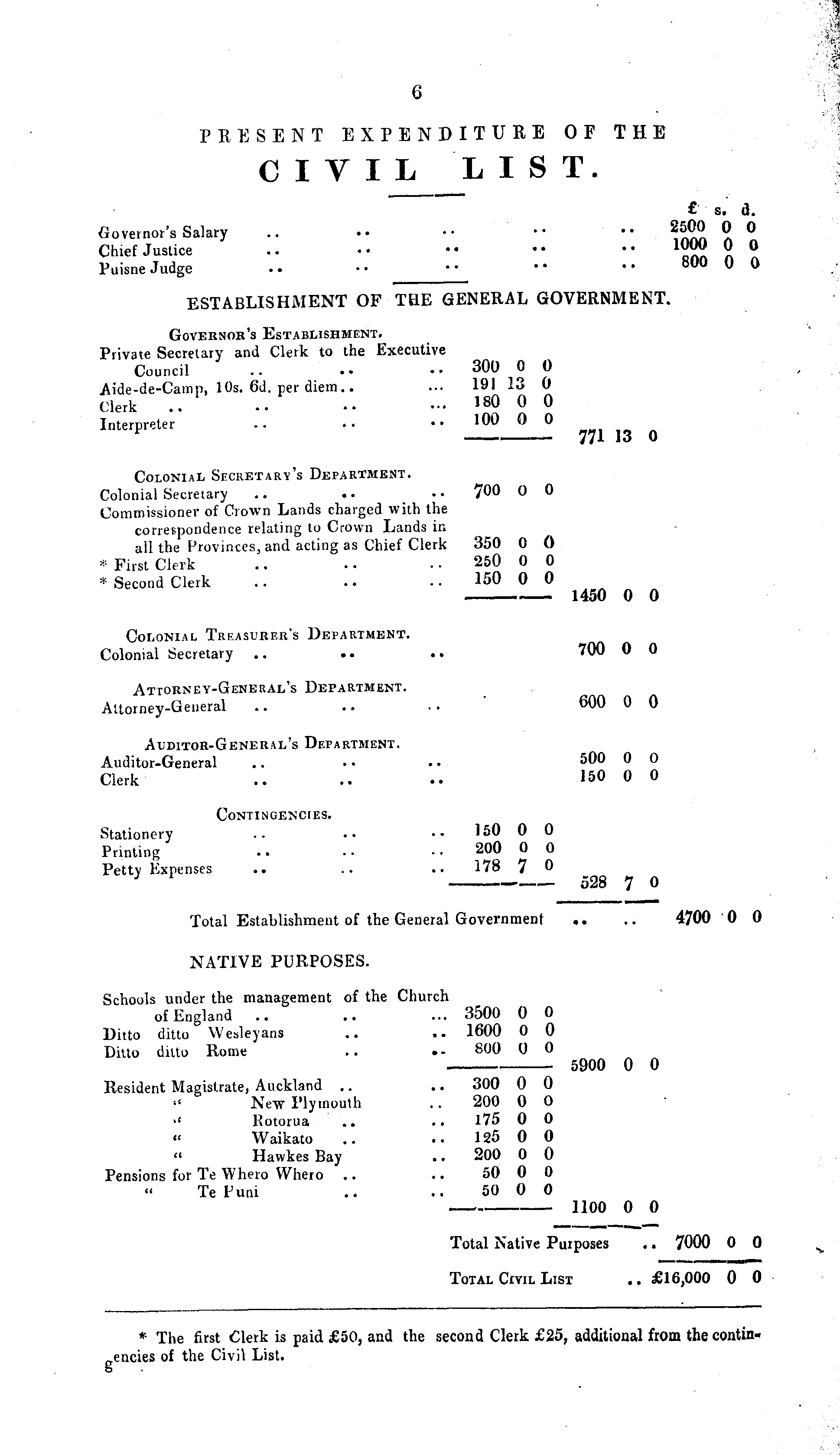PEE SENT EXPENDITURE OE THE CIVIL LIST. £ s. d. Governor's Salary .. •• •• *• •• 9 ® Chief Justice .. • • •• •• 0 0 Puisne Judge .. • • • • • • • • °00 0 ® ESTABLISHMENT OP THE GENERAL GOVERNMENT. Governor's Establishment. Private Secretary and Clerk to the Executive Council .. •• •• 300 0 0 Aide-de-Catnp, 10s. 6d. per diem.. ... 191 13 0 Clerk .. .. .. ... 180 0 0 Interpreter .. .. •• 100 0 0 Q Colonial Secretary's Department. Colonial Secretary .. .. •• /00 0 0 Commissioner of Crown Lands charged with the correspondence relating to Crown Lands in all the Provinces, and acting as Chief Clerk 350 0 O * First Clerk .. .. 250 0 0 * Second Clerk .. . • • • 150 0 0 1450 0 0 Colonial Treasurer's Department. Colonial Secretary .. .. .. 700 0 0 Attorney-General's Department. Attorney-General .. .. .. 600 0 0 Auditor-General's Department. Auditor-General .. • • • • 500 0 O Clerk .. .. .. 150 0 0 Contingencies. Stationery .. • • • • 150 0 0 Printing .. • • • • 200 0 O Petty Expenses .. .. .. 178 7 0 528 7 0 Total Establishment of the General Government .. .. 4700 0 0 NATIVE PURPOSES. Schools under the management of the Church of England .. .. ... 3500 0 0 Ditto ditto Wesleyans .. .. 1600 0 0 Ditto ditto Rome .. • - 800 0 0 5900 0 0 Resident Magistrate, Auckland .. .. 300 0 0 " New Plymouth .. 200 0 O •' Rotorua .. .. 175 0 0 Waikato .. .. 125 0 0 " Hawkes Bay .. 200 0 0 Pensions for Te Whero YVhero .. . • 50 0 0 Te l J uni .. .. 50 0 0 1100 0 0 Total Native Purposes .. 7000 0 0 Total Civil List .. £16,000 0 0
