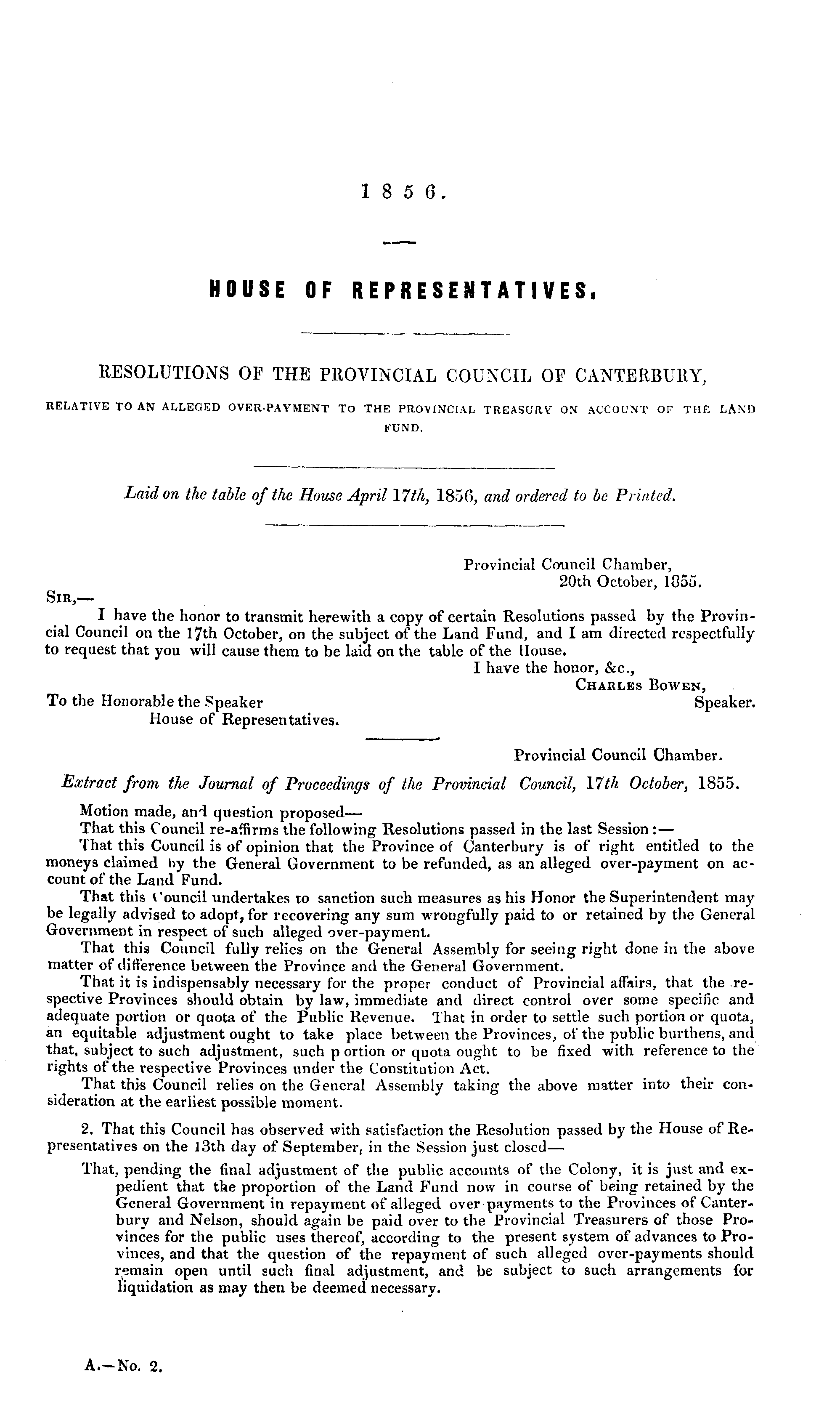 Provincial Council Chamber. Extract from the Journal of Proceedings of the Provincial Council, 17th October, 1855. Motion made, an'l question proposed— That this Council re-affirms the following Resolutions passed in the last Session : — That this Council is of opinion that the Province of Canterbury is of right entitled to the moneys claimed l>y the General Government to be refunded, as an alleged over-payment on account of the Land Fund. That this t'ouncil undertakes to sanction such measures as his Honor the Superintendent may be legally advised to adopt, for recovering any sum wrongfully paid to or retained by the General Government in respect of such alleged over-payment. That this Council fully relies on the General Assembly for seeing right done in the above matter of difference between the Province and the General Government. That it is indispensably necessary for the proper conduct of Provincial affairs, that the respective Provinces should obtain by law, immediate and direct control over some specific and adequate portion or quota of the Public Revenue. That in order to settle such portion or quota, an equitable adjustment ought to take place between the Provinces, of the public burthens, and that, subject to such adjustment, such portion or quota ought to be fixed with reference to the rights of the respective Provinces under the Constitution Act. That this Council relies on the General Assembly taking the above matter into their consideration at the earliest possible moment. 2. That this Council has observed with satisfaction the Resolution passed by the House of Representatives on the 13th day of September, in the Session just closed— That, pending the final adjustment of the public accounts of the Colony, it is just and expedient that the proportion of the Land Fund now in course of being retained by the General Government in repayment of alleged over payments to the Provinces of Canterbury and Nelson, shouid again be paid over to the Provincial Treasurers of those Provinces for the public uses thereof, according to the present system of advances to Provinces, and that the question of the repayment of such alleged over-payments should remain open until such final adjustment, and be subject to such arrangements for liquidation as may then be deemed necessary.