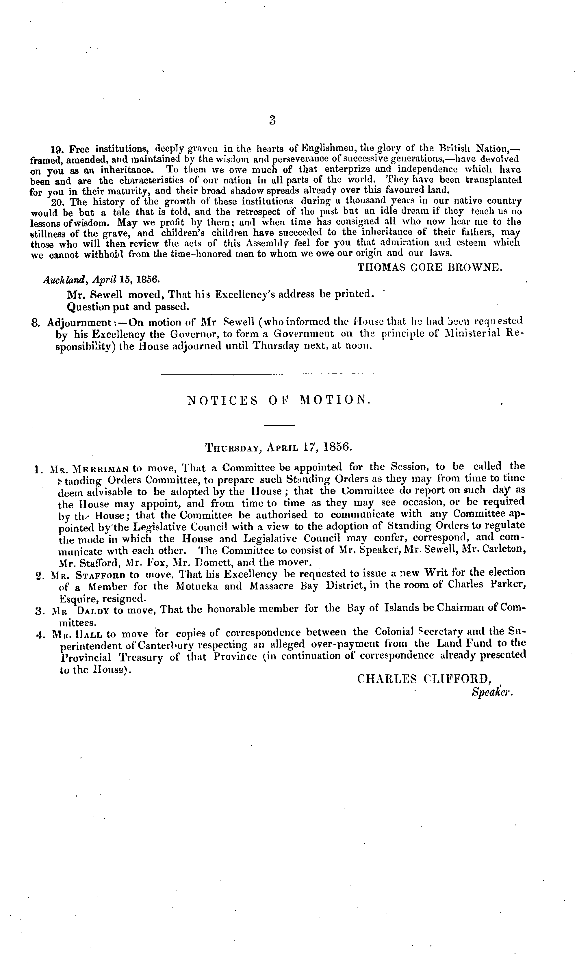 NOTICES OF MOTION. Thursday, April 17, 1856. 1. Mb. Mkrriman to move, That a Committee be appointed for the Session, to be called the t-tanding Orders Committee, to prepare such Standing Orders as they may from time to time deem advisable to be adopted by the House; that the Committee do report on such day as the House may appoint, and from time to time as they may see occasion, or be required by lh. j House; that the Committee be authorised to communicate with any Committee appointed by the Legislative Council with a view to the adoption of Standing Orders to regulate the mode in which the House and Legislative Council may confer, correspond, and communicate with each other. The Committee to consist of Mr. Speaker, Mr. Sevvell, Mr. Carleton, Mr. Stafford, Mr. Fox, Mr. Domett, and the mover. 2. Mr. Stafford to move. That his Excellency be requested to issue a new Writ for the election of a Member for the Motueka and Massacre Bay District, in the room of Charles Parker, Esquire, resigned. 3. Mr Daldy to move, That the honorable member for the Bay of Islands be Chairman ot Committees. 4. Mr. Hall to move for copies of correspondence between the Colonial Secretary and the Superintendent of Canterbury respecting an alleged over-payment from the Land Fund to the Provincial Treasury of that Province (,in continuation of correspondence already presented to the House). CHARLES CLIFFORD, Spcafccr.