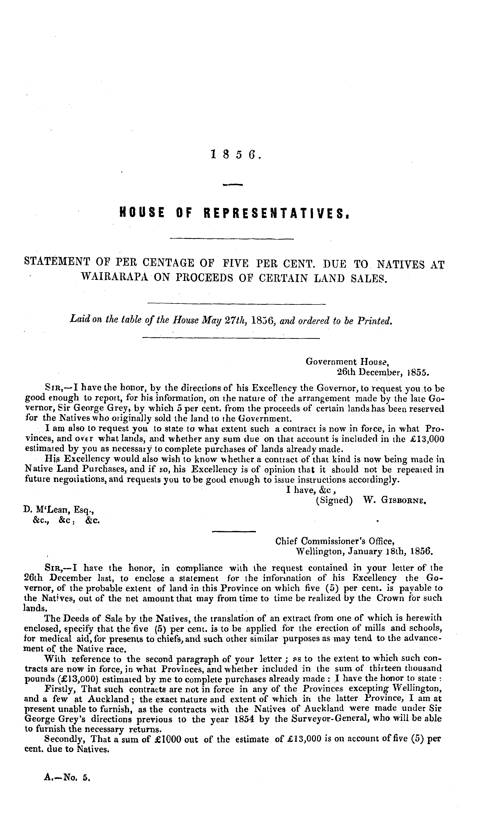 Government House, 26th December, 1855. Sir, —I have the honor, by the directions of his Excellency the Governor, to request you to be good enough to report, for his information, on the nature of the arrangement made by the late Governor, Sir George Grey, by which 5 per cent, from the proceeds of certain lands has been reserved for the Natives who originally sold the land to the Government. I am also to request you to state to what extent such a contract is now in force, in what Provinces, and over what lands, and whether any sum due on that account is included in the £13,000 estimated by you as necessary to complete purchases of lands already made. Hip Excellency would also wish to know whether a contract of that kind is now being made in Native Land Purchases, and if so, his Excellency is of opinion that it should not be repealed in future negotiations, and requests you to be good enough to issue instructions accordingly. I have, &e, (Signed) W. Gisborne, D. M'Lean, Esq., &c., &c ; &c. Chief Commissioner's Office, Wellington, January 18th, 1856. Sir, —I have the honor, in compliance with the request contained in your letter of the 26th December last, to enclose a statement for the information of his Excellency the Governor, of the probable extent of land in this Province on which five (5) per cent, is payable to the Natives, out of the net amount that may from time to time be realized by the Crown for such lands. The Deeds of Sale by the Natives, the translation of an extract from one of which is herewith enclosed, specify that the five (5) per cent, is to be applied for the erection of mills and schools, for medical aid, for presents to chiefs, and such other similar purposes as may tend to the advancement of the Native race. With reference to the second paragraph of your letter ; f>s to the extent to which such contracts are now in force, in what Provinces, and whether included in the sum of thirteen thousand pounds (£13,000) estimated by me to complete purchases already made : I have the honor to state : Firstly, That such contracts are not in force in any of the Provinces excepting Wellington, and a few at Auckland ; the exact nature and extent of which id the latter Province, I am at present unable to furnish, as the contracts with the Natives of Auckland were made under Sir George Grey's directions previous to the year 1854 by the Surveyor-General, who will be able to furnish the necessary returns. Secondly, That a sum of £1000 out of the estimate of £13,000 is on account of five (5) per cent, due to Natives.