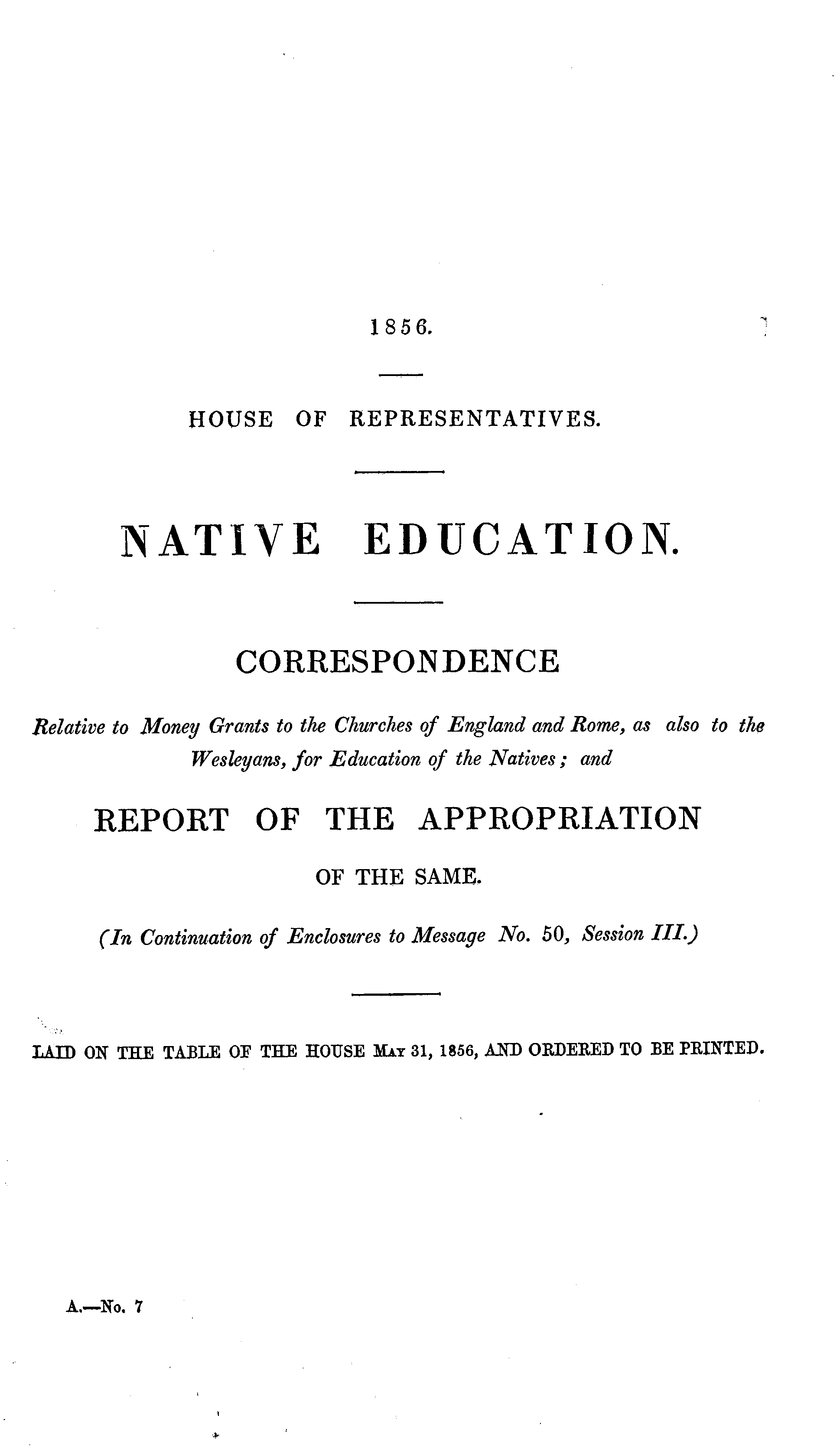 CORRESPONDENCE Relative to Money Grants to the Churches of England and Rome, as also to the Wesleyans, for Education of the Natives; and REPORT OF THE APPROPRIATION OF THE SAME. (In Continuation of Enclosures to Message No. 50, Session III.)