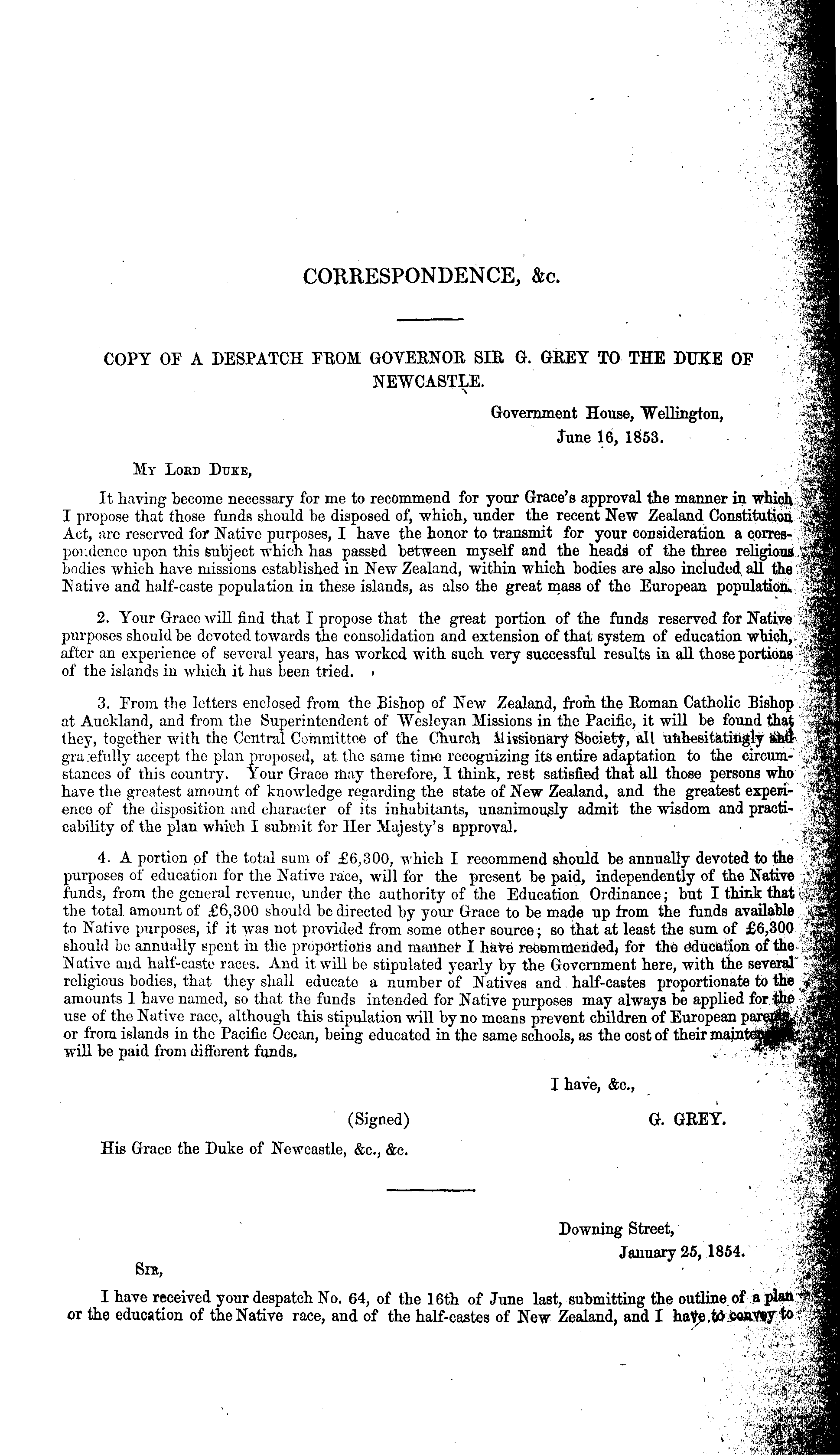 CORRESPONDENCE, &c. COPY OF A DESPATCH FROM GOVERNOR SIR G. GREY TO THE DUKE OE NEWCASTLE. Government House, Wellington, June 16, 1853. My Lord Duke, It having become necessary for me to recommend for your Grace's approval the manner in which I propose that those funds should be disposed of, which, under the recent New Zealand Constitution Act, are reserved for Native purposes, I have the honor to transmit for your consideration a correspondence upon this subject which has passed between myself and the heads of the three religious bodies which have missions established in New Zealand, within which bodies are also included all the Native and half-caste population in these islands, as also the great mass of the European population. 2. Your Grace will find that I propose that the great portion of the funds reserved for Native purposes should be devoted towards the consolidation and extension of that system of education which, after an experience of several years, has worked with such very successful results in all those portions of the islands in which it has been tried. ■ 3. Erom the letters enclosed from the Bishop of New Zealand, from the Roman Catholic Bishop at Auckland, and from the Superintendent of "Wesleyan Missions in the Pacific, it will be found that they, together with the Central Committee of the Church Missionary Society, all unhesitatingly and gra:efully accept <he plan proposed, at the same time recognizing its entire adaptation to the circumstances of this country. Your Grace may therefore, I think, rest satisfied that all those persons who have the greatest amount of knowledge regarding the state of New Zealand, and the greatest experience of the disposition and character of its inhabitants, unanimously admit the wisdom and practicability of the plan which I submit for Her Majesty's approval. 4. A portion of the total sum of £6,300, which I reoommend should be annually devoted to the purposes of education for the Native race, will for the present be paid, independently of the Native funds, from the general revenue, under the authority of the Education Ordinance; but I think that the total amount of £6,300 should be directed by your Grace to be made up from the funds available to Native purposes, if it was not provided from some other source; so that at least the sum of £6,300 should be annually spent in the proportions and mannef I have recommended, for the education of the Native and half-caste races. And it will be stipulated yearly by the Government here, with the several religious bodies, that they shall educate a number of Natives and half-castes proportionate to the amounts I have named, so that the funds intended for Native purposes may always be applied for the use of the Native race, although this stipulation will by no means prevent children of European parents, or from islands in the Pacific Ocean, being educated in the same schools, as the cost of their maintenance will be paid from different funds. I have, &c., (Signed) G. GREY. His Grace the Duke of Newcastle, &c., &c. Downing Street, January 25, 1854. Sir, I have received your despatch No. 64, of the 16th of June last, submitting the outline of a plan or the education of the Native race, and of the half-castes of New Zealand, and I hare.to convey to