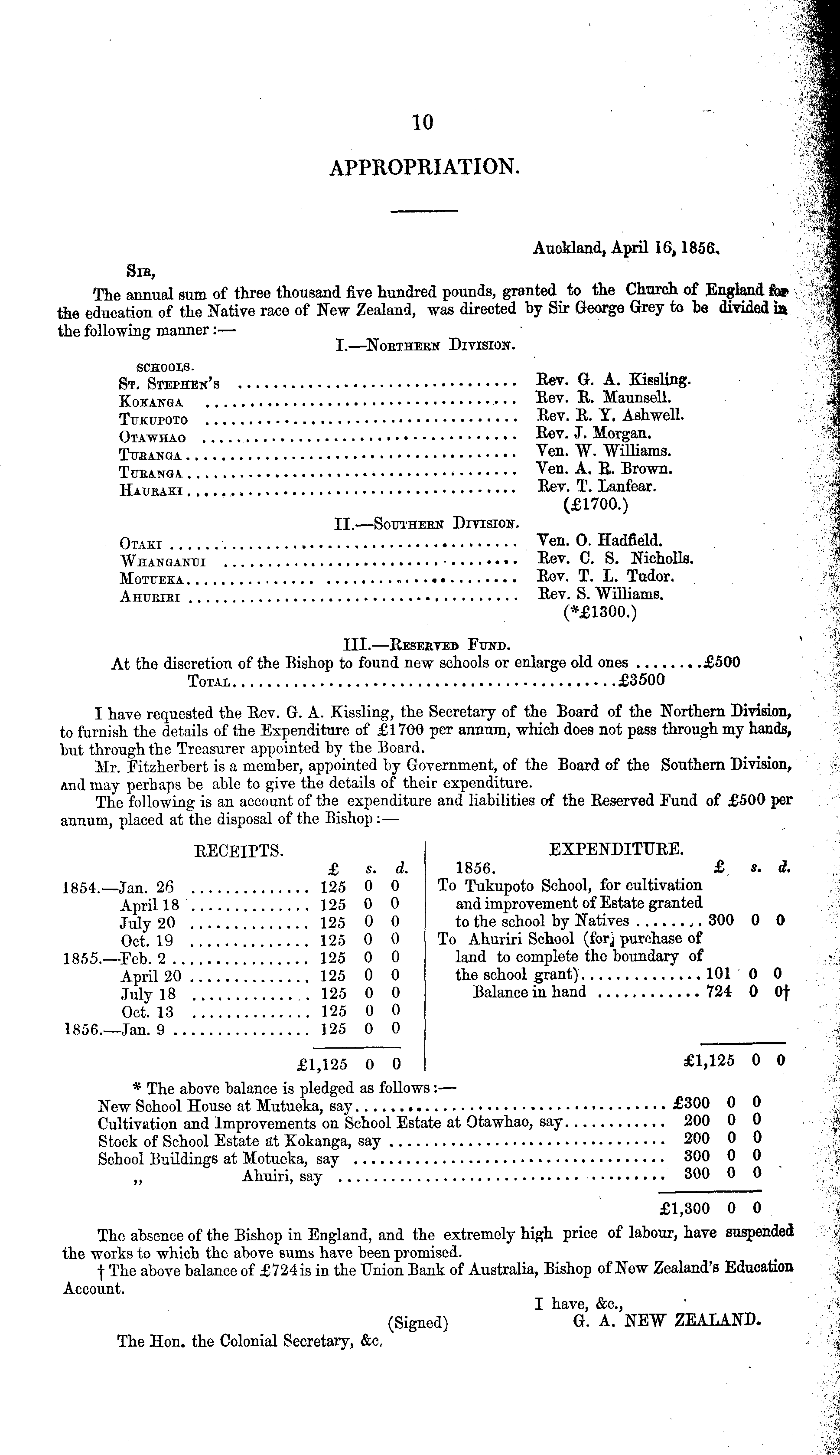 APPROPRIATION. Auckland, April 16, 1856. Sir, The annual sum of three thousand five hundred pounds, granted to the Church of England for the education of the Native race of New Zealand, was directed by Sir George Grey to be divided ia the following manner:— I.—Nobthern Division. schools. St. Stephen's Rev. G. A. Kissling. Kokanga R ev - Maunsell. Tukupoto ® ev - R- Y. Ashwell. Otawhao Ee v. J• Morgan. Turanga Ve n. W. Williams. Turanga Ven. A - R- Brown. Hauraki Rev- T - Lanfear. (£1700.) ll.—Southern Division. - Otaki Ven. O- Hadfield. Whanganui • Rev. C. S. Nicholls. Motueka Rev. T. L. Tudor. Ahuribi ....... Rev. S. "Williams. (*£1300.) lll.—Reserved Fund. At the discretion of the Bishop to found new schools or enlarge old ones £500 Total £3500 I have requested the Rev. G. A. Kissling, the Secretary of the Board of the Northern Division, to furnish the details of the Expenditure of £1700 per annum, which does not pass through my hands, but through the Treasurer appointed by the Board. Mr. Fitzherbert is a member, appointed by Government, of the Board of the Southern Division, And may perhaps be able to give the details of their expenditure. The following is an account of the expenditure and liabilities of the Reserved Fund of £500 per annum, placed at the disposal of the Bishop :— RECEIPTS. EXPENDITURE. £ s. d. 1856. £ s. d. 1854. —Jan. 26 125 0 0 To Tukupoto School, for cultivation April 18 125 0 0 and improvement of Estate granted July 20 125 0 0 to the school by Natives 300 0 0 Oct. 19 125 0 0 To Ahuriri School (forj purchase of 1855.—Feb. 2 125 0 0 land to complete the boundary of April 20 125 0 0 the school grant) 101 0 0 July 18 125 0 0 Balance in hand 724 0 Of Oct. 13 125 0 0 1856.—Jan. 9 125 0 0 £1,125 0 0 £1,125 0 0 * The above balance is pledged as follows: — New School House at Mutueka, say £300 0 0 Cultivation and Improvements on School Estate at Otawhao, say 200 0 0 Stock of School Estate at Kokanga, say 200 0 0 School Buildings at Motueka, say 300 0 0 „ Ahuiri, say 300 0 0 £1,300 0 0 The absence of the Bishop in England, and the extremely high price of labour, have suspended the works to which the above sums have been promised. | The above balance of £724 is in the Union Bank of Australia, Bishop of New Zealand's Education Account. I have, &c., (Signed) G. A. NEW ZEALAND. The Hon. the Colonial Secretary, &c.