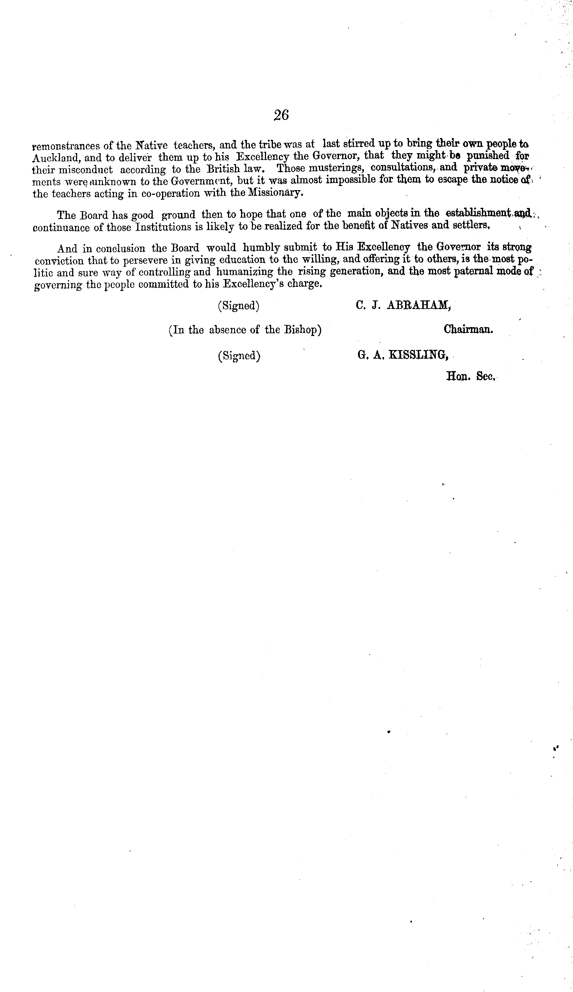 remonstrances of the Native teachers, and the tribe was at last stirred up to bring their own people to Auckland, and to deliver them up to his Excellency the Governor, that they might be punished for their misconduct according to the British law. Those musterings, consultations, and private movements were (unknown to the Government, but it was almost impossible for them to escape the notice of the teachers acting in co-operation with the Missionary. The Board has good ground then to hope that one of the main objects in the establishment and continuance of those Institutions is likely to be realized for the benefit of Natives and settlers. And in conclusion the Board would humbly submit to His Excellency the Governor its strong conviction that to persevere in giving education to the willing, and offering it to others, is the most politic and sure way of controlling and humanizing the rising generation, and the most paternal mode of governing the people committed to his Excellency's charge, (Signed) C. J. ABRAHAM, (In the absence of the Bishop) Chairman. (Signed) G. A. KISSLING, Hon. Sec,
