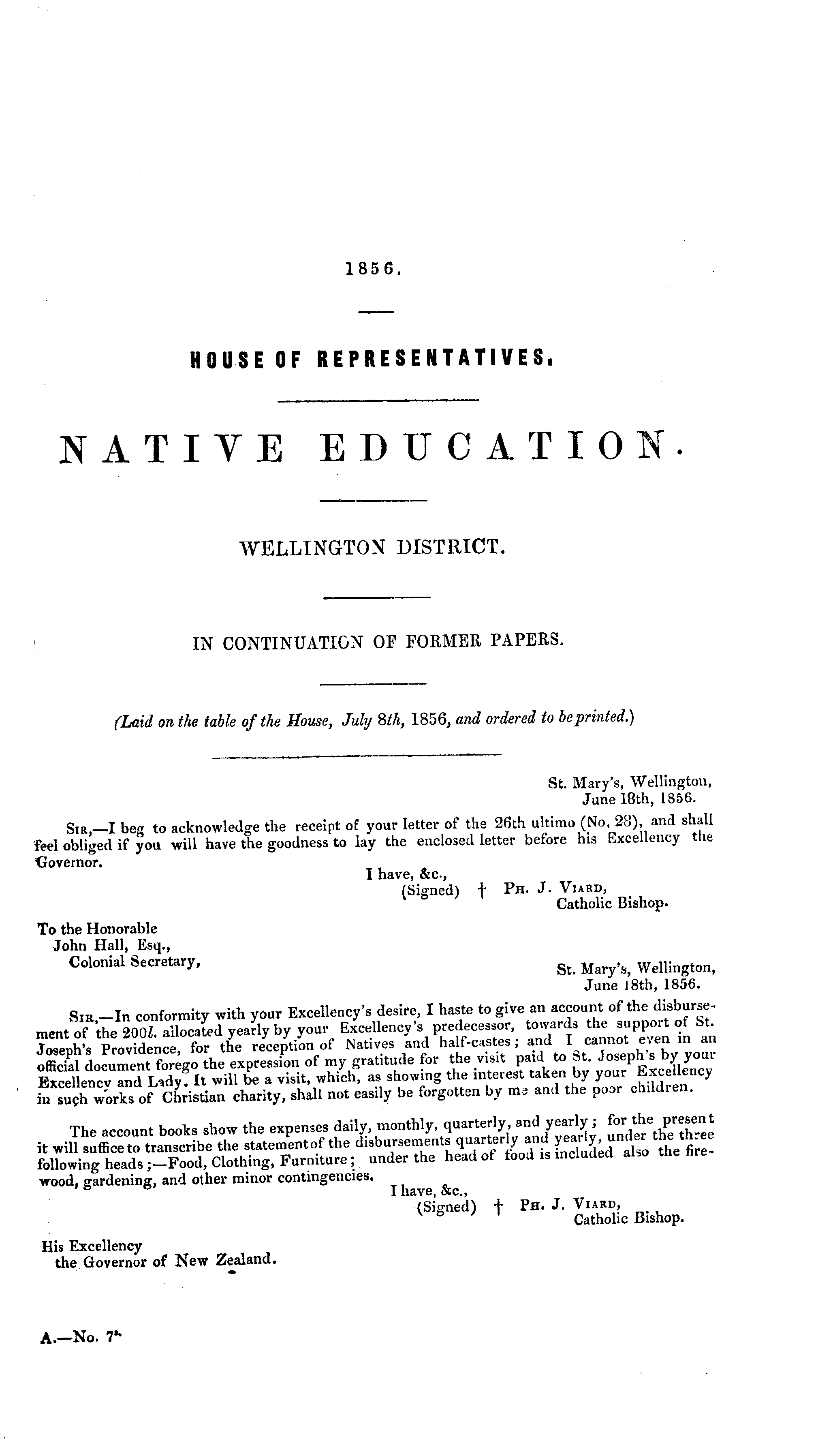 St. Mary's, Wellington, June 18th, 1856. Sir,—l beg to acknowledge the receipt of your letter of the 26th ultimo (No. 28), and shall feel obliged if you will have the goodness to lay the enclosed letter before his Excellency tlie Governor. I have, &c., (Signed) + Ph. J. Viard, Catholic Bishop. To the Honorable John Hall, Esq., Colonial Secretary, gt Mary > S) Wellington, June 18th, 1856. Sir -In conformity with your Excellency's desire, I haste to give an account of the disbursement of 'the 200/. allocated yearly by your Excellency's predecessor, towards the support of St. Joseph's Providence, for the reception of Natives and half-castes, and I cannot e\en in an official document forego the expression of my gratitude for the visit paid to at. Joseph s by youi Excellencv and Lady. It will be a visit, which, as showing the interest taken by your Excellency in such works of Christian charity, shall not easily be forgotten by ma and the poor children. The account books show the expenses daily, monthly, quarterly and yearly; f ' or the P re^" t it will suffice to transcribe the statement of the disbursements quarterly and following heads;-Food, Clothing, Furniture; under the head ot tood is included ai,o wood, gardening, and other minor contingencies. ' & ° I have, &c„ (Signed) + Ph. J. Viard, Catholic Bishop. His Excellency the Governor of New Zealand.