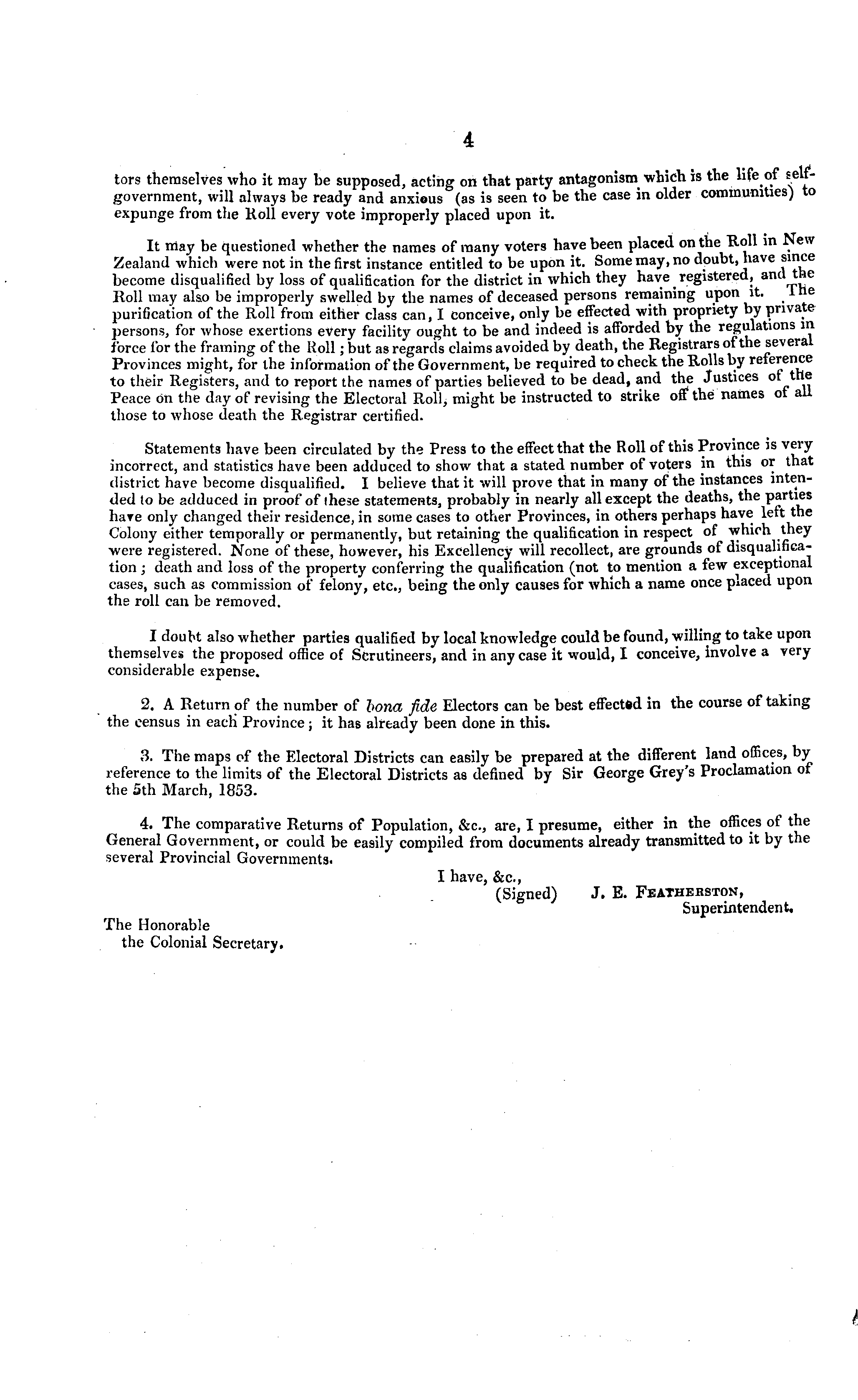 tors themselves who it may be supposed, acting on that party antagonism which is the life of selfgovernment, will always be ready and anxious (as is seen to be the case in older communities) o expunge from the Roll every vote improperly placed upon it. It may be questioned whether the names of many voters have been placed on the Roll in New Zealand which were not in the first instance entitled to be upon it. Some may, no doubt, have ® in £ e become disqualified by loss of qualification for the district in which they have registered, ant t e Roll may also be improperly swelled by the names of deceased persons remaining upon it. 1 e purification of the Roll from either class can, I conceive, only be effected with propriety by pnvate persons, for whose exertions every facility ought to be and indeed is afforded by the regulations in force lor the framing of the Roll; but as regards claims avoided by death, the Registrars of the se\ era Provinces might, for the information of the Government, be required to check the Rolls by reference to their Registers, and to report the names of parties believed to be dead, and the Justices of t e Peace on the day of revising the Electoral Roll, might be instructed to strike off the names of a those to whose death the Registrar certified. Statements have been circulated by the Press to the effect that the Roll of this Province is very incorrect, and statistics have been adduced to show that a stated number of voters in this or that district have become disqualified. I believe that it will prove that in many of the instances intended to be adduced in proof of these statements, probably in nearly all except the deaths, the parties have only changed their residence, in some cases to other Provinces, in others perhaps have left the Colony either temporally or permanently, but retaining the qualification in respect of which they were registered. None of these, however, his Excellency will recollect, are grounds of disqualification ; death and loss of the property conferring the qualification (not to mention a few exceptional cases, such as commission of felony, etc., being the only causes for which a name once placed upon the roll can be removed. I doubt also whether parties qualified by local knowledge could be found, willing to take upon themselves the proposed office of Scrutineers, and in any case it would, I conceive, involve a very considerable expense. 2. A Return of the number of bona fide Electors can he best effected in the course of taking the census in each Province; it has already been done in this. 3. The maps of the Electoral Districts can easily be prepared at the different land offices, by reference to the limits of the Electoral Districts as defined by Sir George Grey's Proclamation of the sth March, 1853. 4. The comparative Returns of Population, &c., are, I presume, either in the offices ot the General Government, or could be easily compiled from documents already transmitted to it by the several Provincial Governments. I have, &c., (Signed) J. E. Featherston, Superintendent, The Honorable the Colonial Secretary.