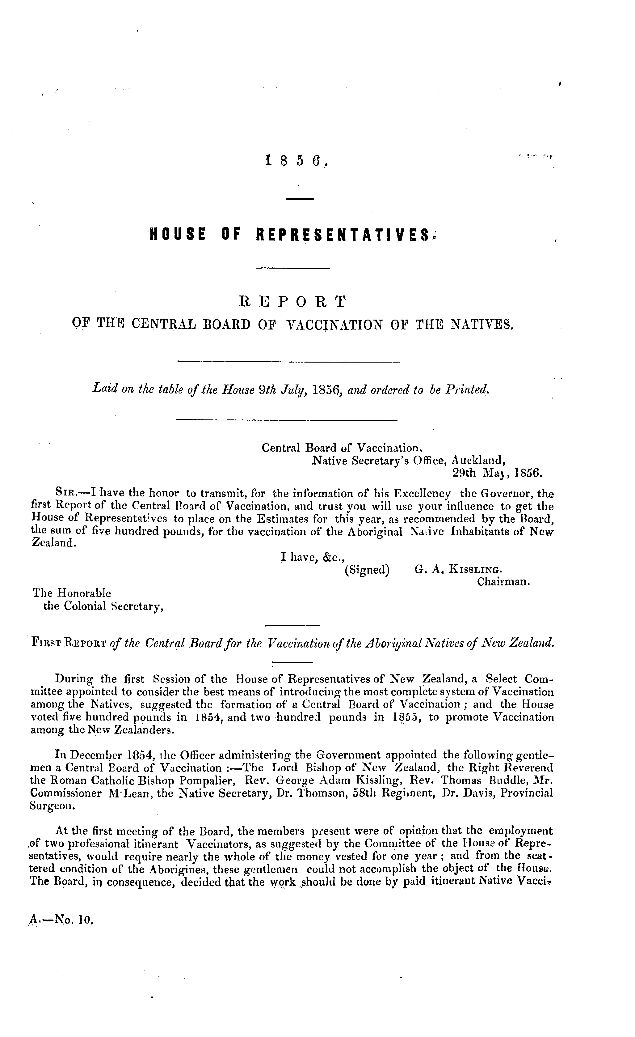 Central Board of Vaccination. Native Secretary's Office, Auckland, 29th May, 1856. Sir.—I have the honor to transmit, for the information of his Excellency the Governor, the first Report of the Central Board of Vaccination, and trust you will use your influence to get the House of Representatives to place on the Estimates for this year, as recommended by the Board, the sum of five hundred pounds, for the vaccination of the Aboriginal Native Inhabitants of New Zealand. I have, &c., (Signed) G. A, Kissling. Chairman. The Honorable the Colonial Secretary,