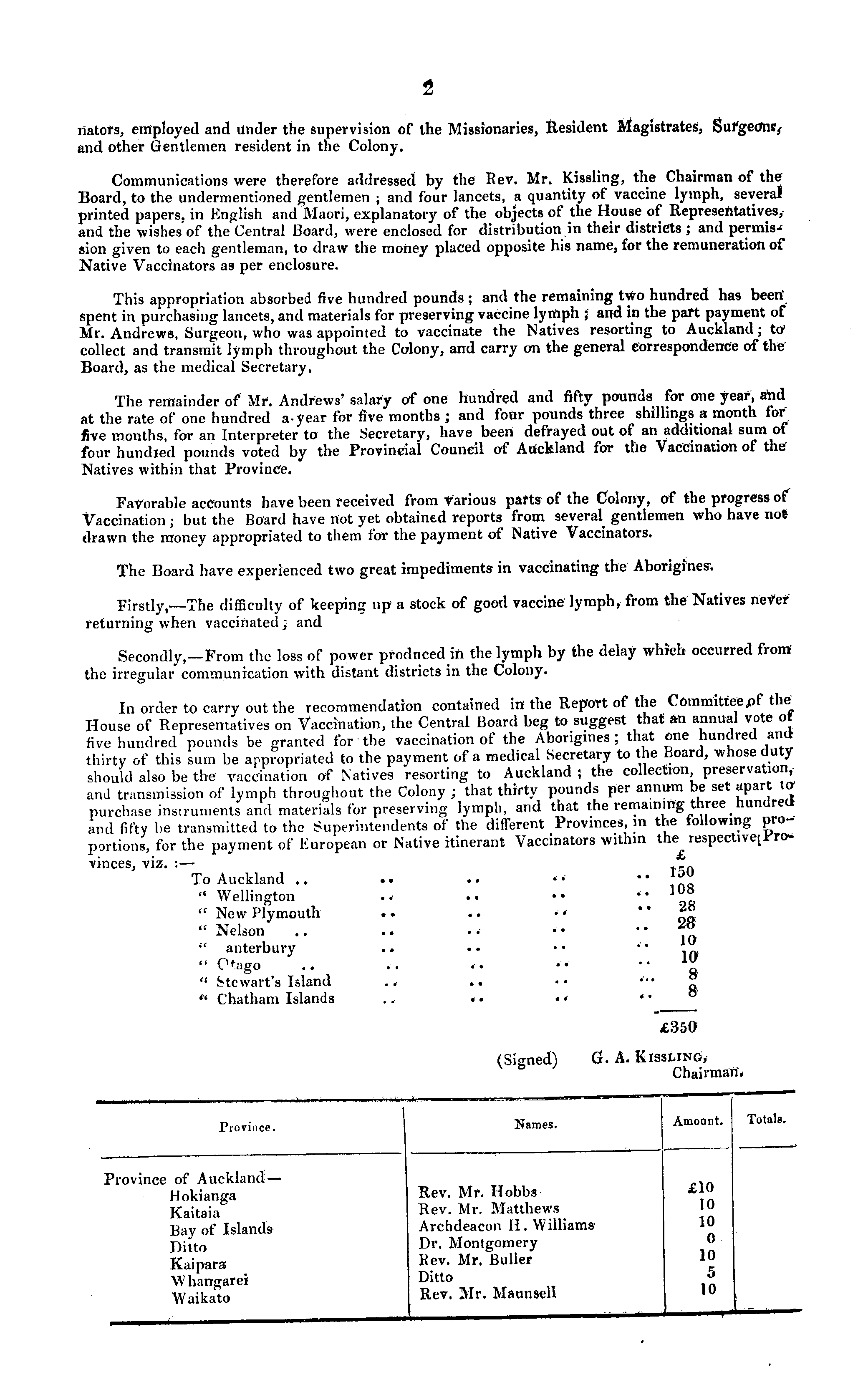 iiators, employed and Under the supervision of the Missionaries, Resident Magistrates, Surgeons,and other Gentlemen resident in the Colony. Communications were therefore addressed by the Rev. Mr. Kissling, the Chairman of the Board, to the undermentioned gentlemen ; and four lancets, a quantity of vaccine lymph, several printed papers, in English and Maori, explanatory of the objects of the House of Representatives, and the wishes of the Central Board, were enclosed for distribution in their districts ; and permission given to each gentleman, to draw the money placed opposite his name, for the remuneration of Native Vaccinators as per enclosure. This appropriation absorbed five hundred pounds ; and the remaining two hundred has been spent in purchasing lancets, and materials for preserving vaccine lymph ; and in the part payment of Mr. Andrews, Surgeon, who was appointed to vaccinate the Natives resorting to Auckland; ttf collect and transmit lymph throughout the Colony, and carry on the general correspondence of the Board, as the medical Secretary. The remainder of Mr. Andrews' salary of one hundred and fifty pounds for one year, and at the rate of one hundred a-year for five months ; and four pounds three shillings a month five months, for an Interpreter to the Secretary, have been defrayed out of an additional sum ot four hundied pounds voted by the Provincial Council of Auckland for tile Vaccination ot the Natives within that Province. Favorable accounts have been received from Various parts of the Colony, of the progress of Vaccination ; but the Board have not yet obtained reports from several gentlemen who have not drawn the money appropriated to them for the payment of Native Vaccinators. The Board have experienced two great impediments in vaccinating the Aborigines. Firstly,—The difficulty of keeping up a stock of good vaccine lymph, from the Natives neVer returning when vaccinated; and Secondly,—From the loss of power produced in the lymph by the delay which occurred fiom the irregular communication with distant districts in the Colony. In order to carry out the recommendation contained in the Report of the Committee pf the House of Representatives on Vaccination, the Central Board beg to suggest that an annual vote o five hundred pounds be granted for the vaccination of the Aborigines ; that one hundred ant thirty of this sum be appropriated to the payment of a medical Secretary to the oar , w ose u y should also be the vaccination of Natives resorting to Auckland ; the collection preservation, and transmission of lymph throughout the Colony ; that thirty pounds per annum be set apart to purchase instruments and materials for preserving lymph, and that the remaining three hundre and fifty be transmitted to the Superintendents of the different Provinces, in the following proportions, for the payment of European or Native itinerant Vaccinators within respective^rovinces, viz. :— rn To Auckland .. .. <• " " Wellington .. .• •• " ok " New Plymouth . • «. " "Nelson .. .. .. •• •• " anterbury .. • • • • ' • ln » O'ago .. .. •• •• ™ " Stewart's Island .< " Chatham Islands ~ «« •« " £350 (Signed) Gr« A. Kissling,Chairman'j