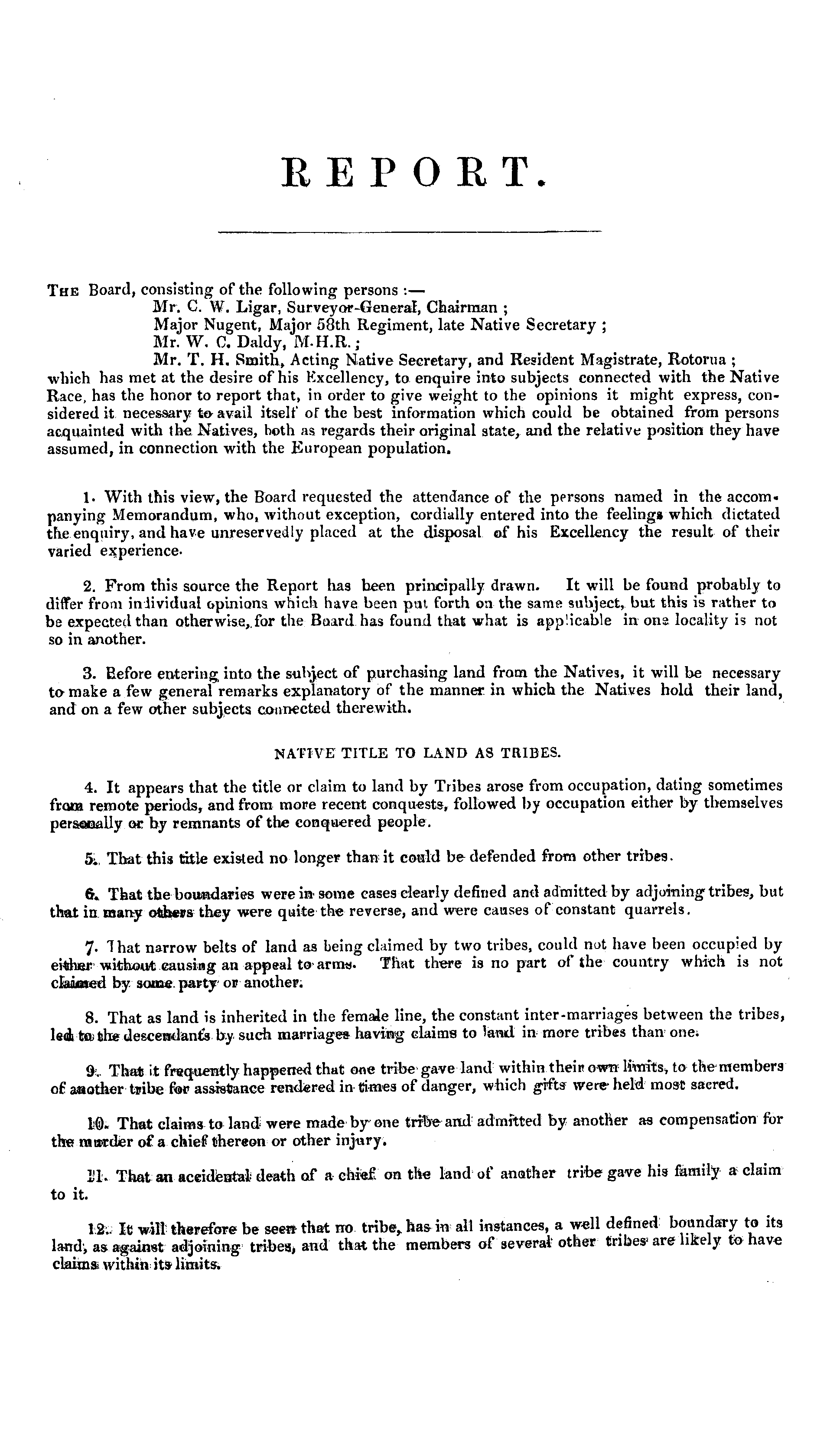 The Board, consisting of the following persons :— Mr. C. W. Ligar, Surveyor-General, Chairman ; Major Nugent, Major 58th Regiment, late Native Secretary ; Mr. W. C. Daldy, M-H.R.; Mr. T. H. Smith, Acting Native Secretary, and Resident Magistrate, Rotorua ; which has met at the desire of his Excellency, to enquire into subjects connected with the Native Race, has the honor to report that, in order to give weight to the opinions it might express, considered it necessary to avail itself of the best information which could be obtained from persons acquainted with the Natives, both as regards their original state, and the relative position they have assumed, in connection with the European population. 1. With this view, the Board requested the attendance of the persons named in the accompanying Memorandum, who, without exception, cordially entered into the feelings which dictated the enquiry, and have unreservedly placed at the disposal of his Excellency the result of their varied experience. 2. From this source the Report has been principally drawn. It will be found probably to differ from individual opinions which have been put forth on the same subject, but this is rather to be expected than otherwise,, for the Board has found that what is applicable in ons locality is not so in another. 3. Before entering into the subject of purchasing land from the Natives, it will be necessary to make a few general remarks explanatory of the manner in which the Natives hold their land, and on a few other subjects connected therewith. NATIVE TITLE TO LAND AS TRIBES. 4. It appears that the title or claim to land by Tribes arose from occupation, dating sometimes from remote periods, and from more recent conquests, followed by occupation either by themselves personally or by remnants of the conquered people . 5. That this title existed no longer than it could be defended from other tribes. 6. That the boundaries were in some cases clearly defined and admitted by adjoining tribes, but that in many others they were quite the reverse, and were causes of constant quarrels. 7. That narrow belts of land as being claimed by two tribes, could not have been occupied by either without causing an appeal to arms. That there is no part of the country which is not claimed by some party or another. 8. That as land is inherited in the femaie line, the constant inter-marriages between the tribes, led to, the descendants by such marriages having claims to land in more tribes than one. 9. That it frequently happened that one tribe gave land within their own limits, to the members of another tribe for assistance rendered in times of danger, which gifts were held most sacred. 10. That claims to land were made by one tribe and admitted by another as compensation for the murder of a chief thereon or other injury. 11. That an accidental death of a chief on the land of another tribe gave his family a claim to it. 12. It will therefore be seen that no tribe, has in all instances, a well defined boundary to its land, as against adjoining tribes, and that the members of several other tribes- are likely to have claims within its limits.