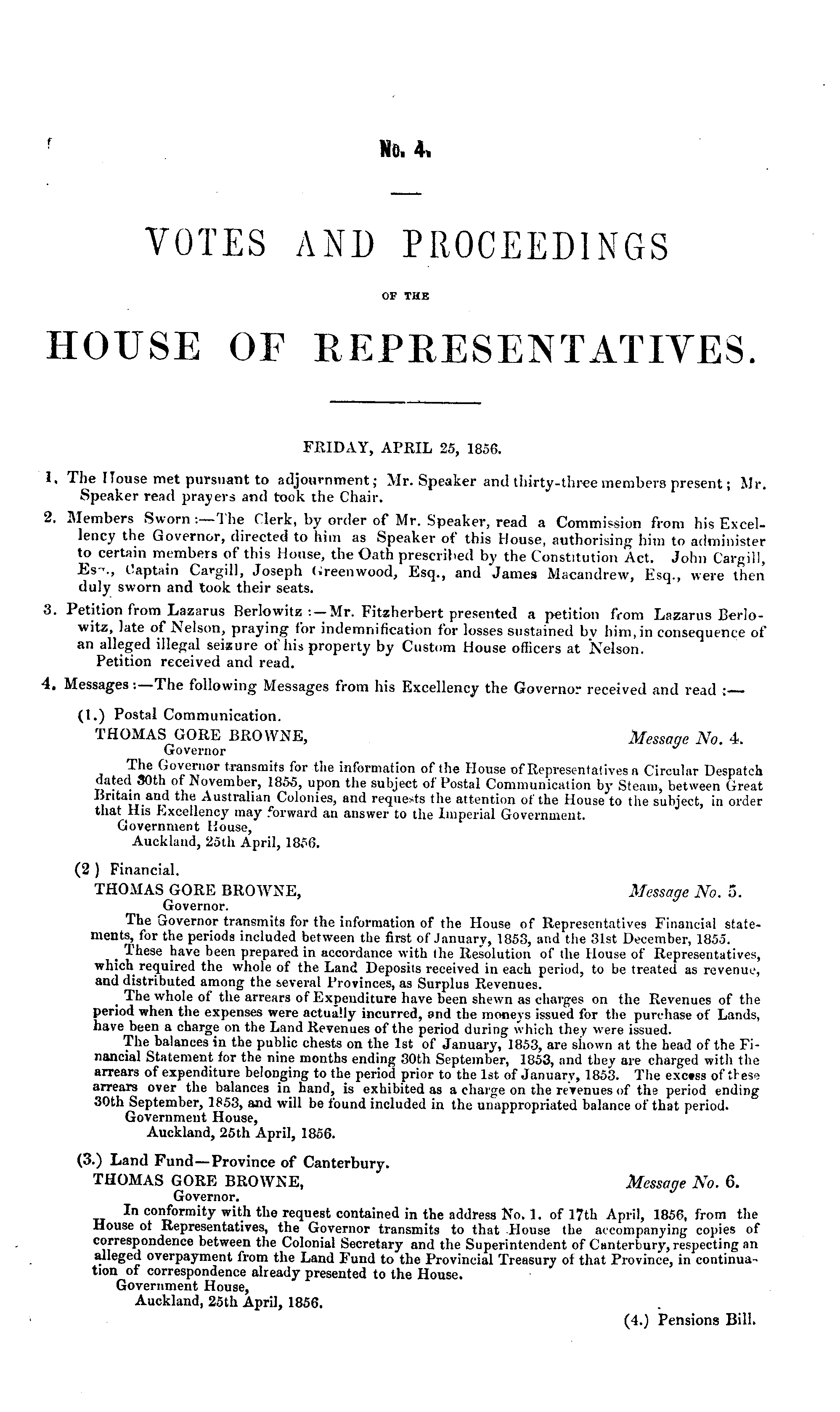 FRIDAY, APRIL 25, 1856. 1. The House met pursuant to adjournment; Mr. Speaker and thirty-three members present; Mr. Speaker read prayers and took the Chair. 2. Members Sworn The Clerk, by order of Mr. Speaker, read a Commission from his Excellency the Governor, directed to him as Speaker of this House, authorising him to administer to certain members of this House, the Oath prescribed by the Constitution Act. John Cargill, Es-., Captain Cargill, Joseph Greenwood, Esq., and James Macandrew, Esq., were then duly sworn and took their seats. 3. Petition from Lazarus Berlowitz -. — Mr. Fitzherbert presented a petition from Lazarus Berlowitz, late of Nelson, praying for indemnification for losses sustained bv him, in consequence of an alleged illegal seizure of his property by Custom House officers at "Nelson. Petition received and read. 4. Messages -.—The following Messages from his Excellency the Governor received and read • (1.) Postal Communication. THOMAS GORE BROWNE, Message No. 4. Governor The Governor transmits for the information of the House of Representatives n Circular Despatch dated 30th of November, 1855, upon the subject of Postal Communication by Steam, between Great Bntain and the Australian Colonies, and requests the attention of the House to the subject, in order that His Excellency may forward an answer to the Imperial Government. Government House, Auckland, 25th April, 1856. (2 ) Financial. THOMAS GORE BROWNE, Message No. 5. Governor. The Governor transmits for the information of the House of Representatives Financial statements, for the periods included between the first of January, 1853, and the 31st December, 1855. Ihese have been prepared in accordance with the Resolution of the House of Representatives, which required the whole of the Land Deposits received in each period, to be treated as revenue, and distributed among the several Provinces, as Surplus Revenues. _ The whole of the arrears of Expenditure have been shewn as charges on the Revenues of the period when the expenses were actually incurred, and the moneys issued for the purchase of Lands, have been a charge on the Land Revenues of the period during which they were issued. The balances in the public chests on the Ist of January, 1853, are shown at the bead of the Financial Statement for the nine months ending 30th September, 1853, and they are charged with the arrears of expenditure belonging to the period prior to the Ist of January, 1853. The exctss of these arrears over the balances in hand, is exhibited as a charge on the revenues of the period ending 30th September, 1853, and will be found included in the unappropriated balance of that period. Government House, Auckland, 25th April, 1856. (3.) Land Fund—Province of Canterbury. THOMAS GORE BROWNE, Message No. 6. Governor. In conformity with the request contained in the address No. 1. of 17th April, 1856, from the House of Representatives, the Governor transmits to that House the accompanying copies of correspondence between the Colonial Secretary and the Superintendent of Canterbury, respecting an alleged overpayment from the Land Fund to the Provincial Treasury of that Province, in continuation of correspondence already presented to the House. Government House, Auckland, 25th April, 1856. (4.) Pensions Bill.