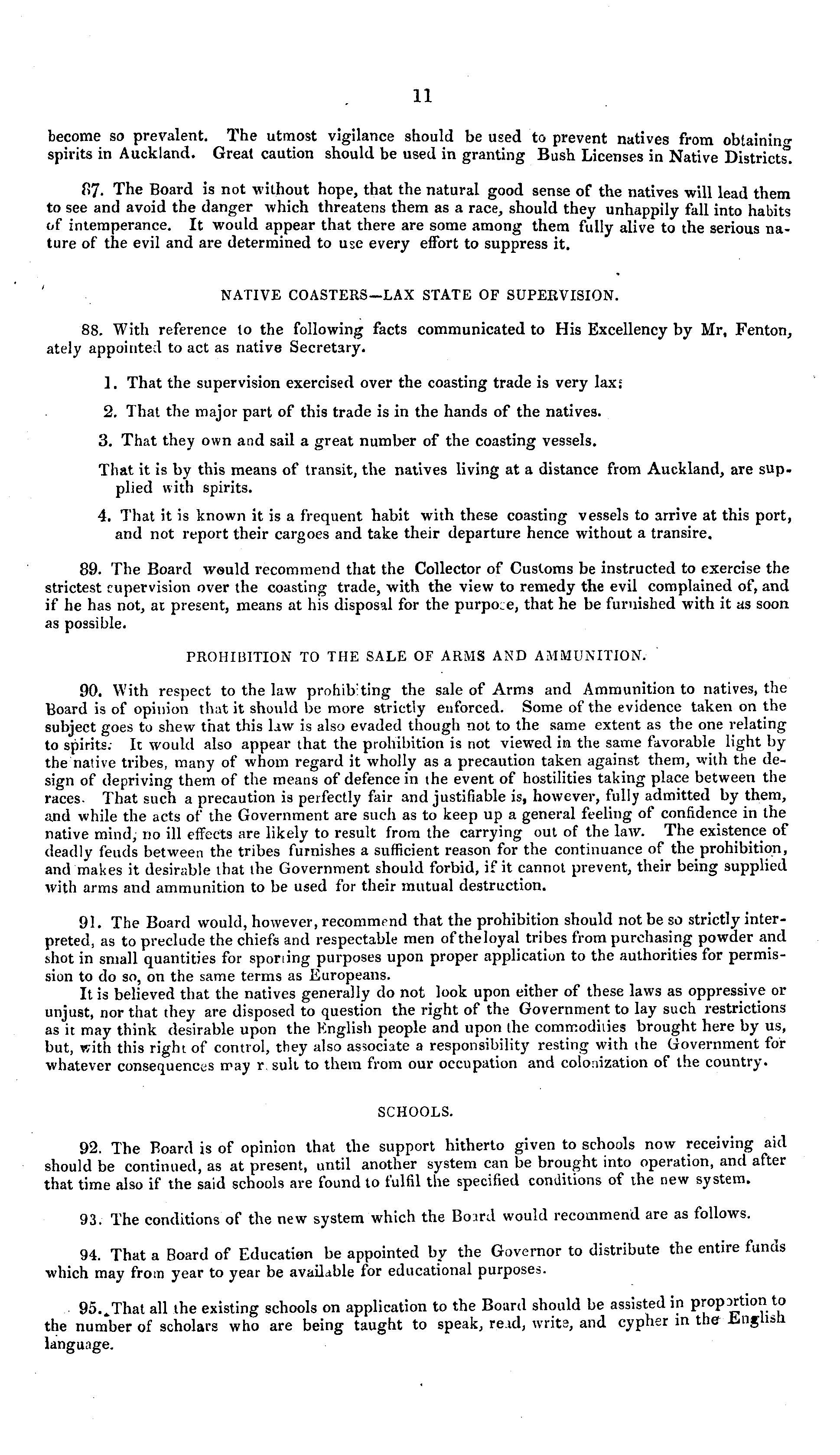 become so prevalent. The utmost vigilance should be used to prevent natives from obtaining spirits in Auckland. Great caution should be used in granting Bush Licenses in Native District?. 87- The Board is not without hope, that the natural good sense of the natives will lead them to see and avoid the danger which threatens them as a race, should they unhappily fall into habits of intemperance. It would appear that there are some among them fully alive to the serious nature of the evil and are determined to use every effort to suppress it. NATIVE COASTERS-LAX STATE OF SUPERVISION. 88. With reference to the following facts communicated to His Excellency by Mr, Fenton, ately appointed to act as native Secretary. ]. That the supervision exercised over the coasting trade is very lax: 2. That the major part of this trade is in the hands of the natives. 3. That they own and sail a great number of the coasting vessels. That it is by this means of transit, the natives living at a distance from Auckland, are sup. plied with spirits. 4. That it is known it is a frequent habit with these coasting vessels to arrive at this port, and not report their cargoes and take their departure hence without a transire. 89. The Board would recommend that the Collector of Customs be instructed to exercise the strictest eupervision over the coasting trade, with the view to remedy the evil complained of, and if he has not, at present, means at his disposal for the purpo.e, that he be furnished with it as soon as possible. PROHIBITION TO THE SALE OF ARMS AND AMMUNITION. 90. With respect to the law prohibiting the sale of Arms and Ammunition to natives, the Board is of opinion that it should be more strictly enforced. Some of the evidence taken on the subject goes to shew that this law is also evaded though not to the same extent as the one relating to spirits. It would also appear that the prohibition is not viewed in the same favorable light by the native tribes, many of whom regard it wholly as a precaution taken against them, with the design of depriving them of the means of defence in the event of hostilities taking place between the races- That such a precaution is perfectly fair and justifiable is, however, fully admitted by them, and while the acts of the Government are such as to keep up a general feeling of confidence in native mind, no ill effects are likely to result from the carrying out of the law. The existence of deadly feuds between the tribes furnishes a sufficient reason for the continuance of the prohibition, and makes it desirable that ihe Government should forbid, if it cannot prevent, their being supplied with arms and ammunition to be used for their mutual destruction. 91. The Board would, however, recommend that the prohibition should not be so strictly interpreted, as to preclude the chiefs and respectable men of theloyal tribes from purchasing powder and shot in small quantities for sporting purposes upon proper application to the authorities for permission to do so, on the same terms as Europeans. It is believed that the natives generally do not look upon either of these laws as oppressive or unjust, nor that they are disposed to question the right of the Government to lay such restrictions as it may think desirable upon the English people and upon the commodities brought here by us, but, with this right of control, they also associate a responsibility resting with the Government for whatever consequences may r. suit to them from our occupation and colonization of the country. SCHOOLS. 92. The Board is of opinion that the support hitherto given to schools now receiving aid should be continued, as at present, until another system can be brought into operation, and afteL that time also if the said schools are found to fulfil the specified conditions of the new system. 93. The conditions of the new system which the Board would recommend are as follows. 94. That a Board of Education be appointed by the Governor to distribute the entire funds which may from year to year be available tor educational purposes. 95..That all the existing schools on application to the Board should be assisted in proportion to the number of scholars who are being taught to speak, read, write, and cypher in tie ng is 1 language.