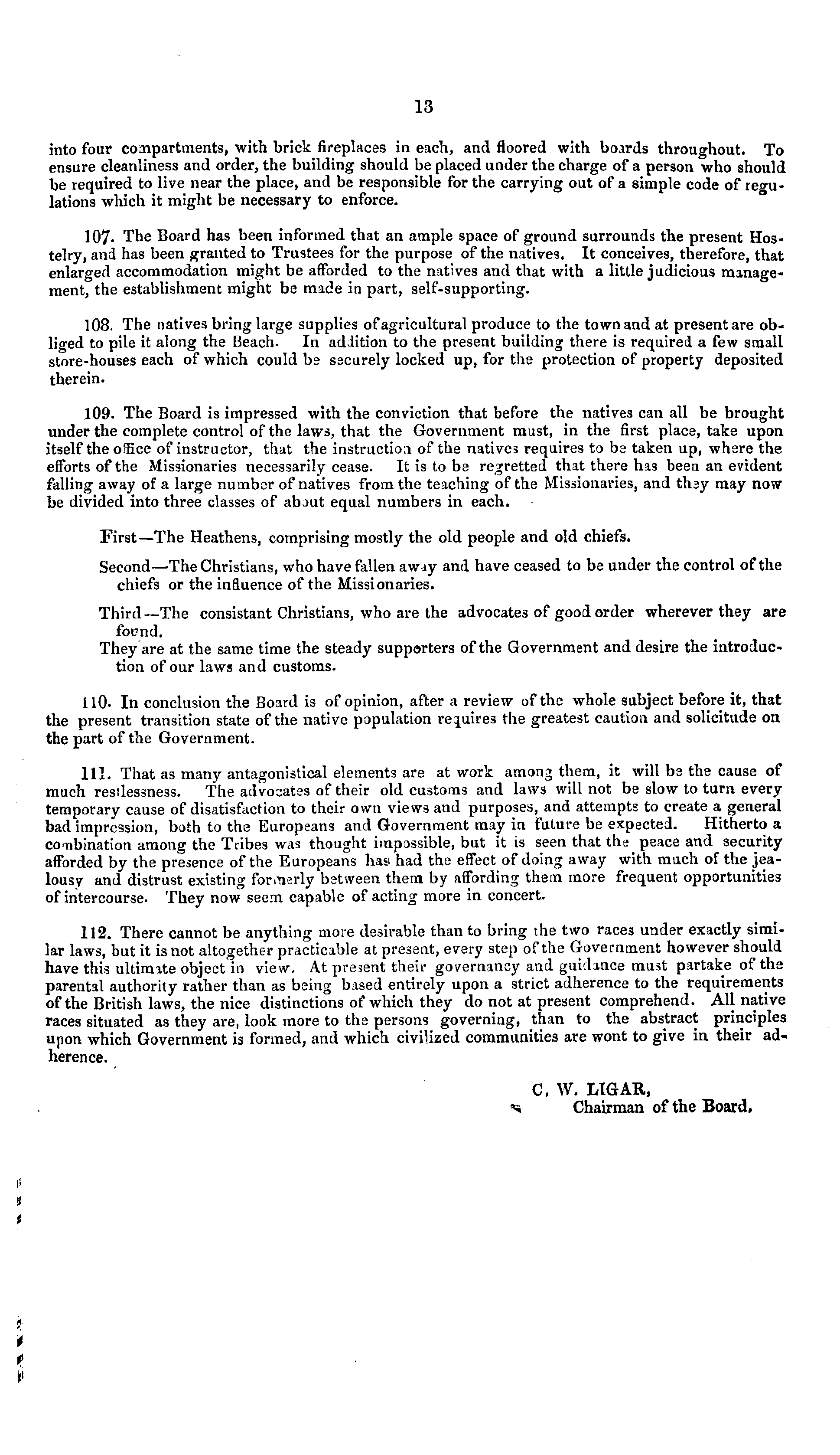 into four compartments, with brick fireplaces in each, and floored with boards throughout. To ensure cleanliness and order, the building should be placed under the charge of a person who should be required to live near the place, and be responsible for the carrying out of a simple code of regulations which it might be necessary to enforce. 107- The Board has been informed that an ample space of ground surrounds the present Hostelry, and has been granted to Trustees for the purpose of the natives. It conceives, therefore, that enlarged accommodation might be afforded to the natives and that with a little judicious management, the establishment might be made in part, self-supporting. 108. The natives bring large supplies of agricultural produce to the town and at present are obliged to pile it along the Beach. In addition to the present building there is required a few small store-houses each of which could be securely locked up, for the protection of property deposited therein. 109. The Board is impressed with the conviction that before the natives can all be brought under the complete control of the laws, that the Government must, in the first place, take upon itself the office of instructor, that the instruction of the natives requires to be taken up, where the efforts of the Missionaries necessarily cease. It is to be regretted that there has been an evident falling away of a large number of natives from the teaching of the Missionaries, and they may now be divided into three classes of abjut equal numbers in each. First—The Heathens, comprising mostly the old people and old chiefs. Second —The Christians, who have fallen away and have ceased to be under the control of the chiefs or the influence of the Missionaries. Third—The consistant Christians, who are the advocates of good order wherever they are found. They are at the same time the steady supporters of the Government and desire the introduction of our laws and customs. 110. In conclusion the Board is of opinion, after a review of the whole subject before it, that the present transition state of the native population requires the greatest caution and solicitude on the part of the Government. 111. That as many antagonistical elements are at work among them, it will be the cause of much restlessness. The advocates of their old customs and laws will not be slow to turn every temporary cause of disatisfaction to their own views and purposes, and attempts to create a general bad impression, both to the Europeans and Government may in future be expected. Hitherto a combination among the Tribes was thought impossible, but it is seen that ths; peace and security afforded by the presence of the Europeans has had the effect of doing away with much of the jealousy and distrust existing formerly between them by affording them more frequent opportunities of intercourse. They now seem capable of acting more in concert. 112. There cannot be anything more desirable than to bring the two races under exactly similar laws, but it is not altogether practicable at present, every step of the Government however should have this ultimate object in view. At present their governancy and guidance must partake of the parental authority rather than as being based entirely upon a strict adherence to the requirements of the British laws, the nice distinctions of which they do not at present comprehend. All native races situated as they are, look more to the persons governing, than to the abstract principles upon which Government is formed, and which civilized communities are wont to give in their adherence. C. W. LIGAR, % Chairman of the Board.
