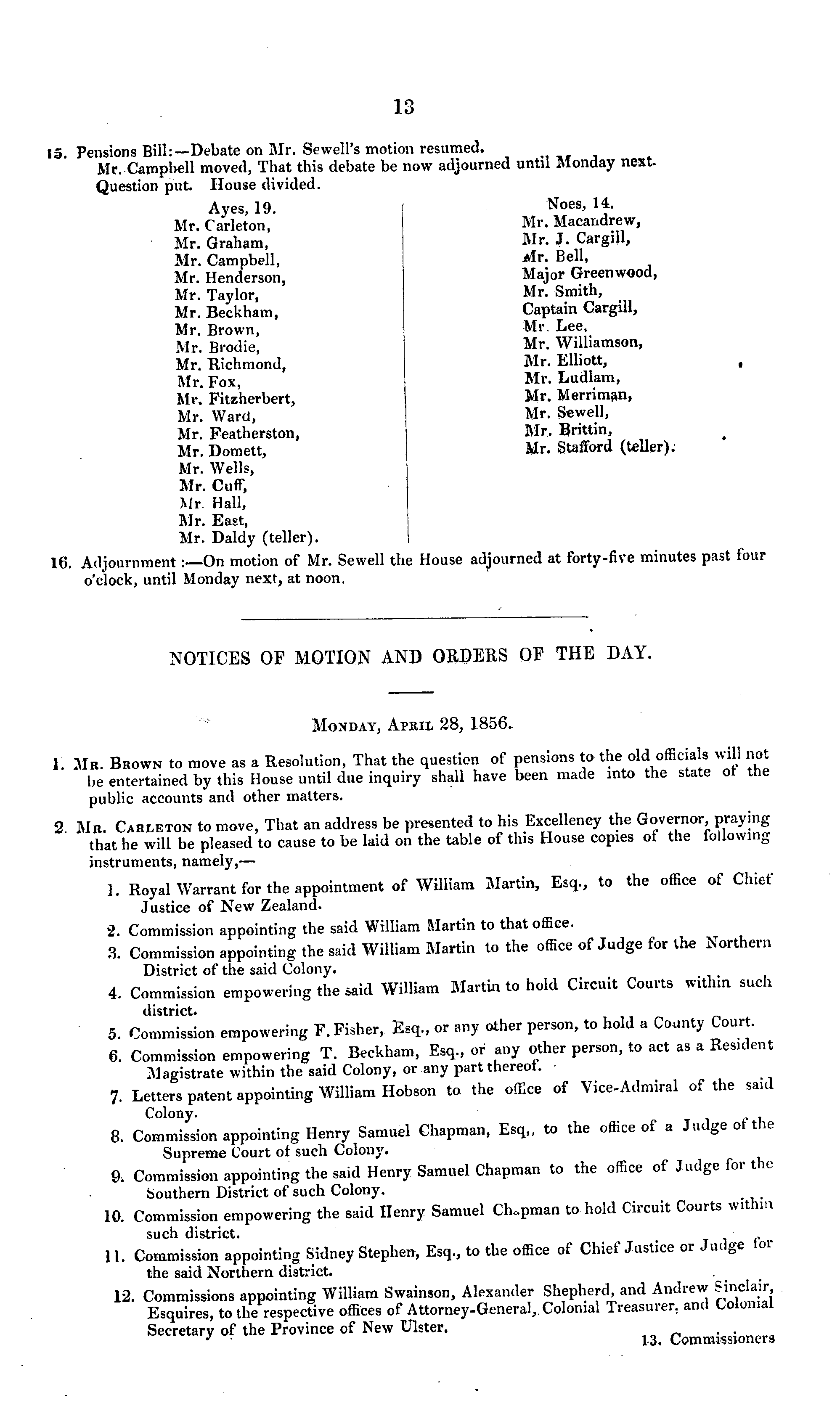 NOTICES OE MOTION AND ORDERS OE THE DAY. Monday, April 28, 1856. 1. Mr. Brown to move as a Resolution, That the question of pensions to the old officials will not be entertained by this House until due inquiry shall have been made into the state o t e public accounts and other matters. 2 Mr. Cableton to move, That an address be presented to his Excellency the Governor praying that he will be pleased to cause to be laid on the table of this House copies of the following instruments, namely,— ]. Royal Warrant for the appointment of William Martin, Esq., to the office ot Chiet Justice of New Zealand. 2. Commission appointing the said William Martin to that office. 3. Commission appointing the said William Martin to the office of Judge for the Northern District of the said Colony. 4. Commission empowering the said William Martin to hold Circuit Courts within such district. 5. Commission empowering F.Fisher, Esq., or any other person, to hold a County Court. 6. Commission empowering T. Beckham, Esq., or any other person, to act as a Resident Magistrate within the said Colony, or any partthereot. 7. Letters patent appointing William Hobson to the office of Vice-Admiral of the said Colony. 8. Commission appointing Henry Samuel Chapman, Esq,, to the office of a Judge ot tie Supreme Court ot such Colony. 9. Commission appointing the said Henry Samuel Chapman to the office of Judge for the Southern District of such Colony. 10. Commission empowering the said Ilenry Samuel Ch.pman to hold Circuit Courts within such district. _ . 11. Commission appointing Sidney Stephen, Esq., to the office of Ciiiet Justice oi Jui 0 e the said Northern district. 12. Commissions appointing William Swainson, Alexander Shepherd, and Andrew ? incla . ir > Esquires, to the respective offices of Attorney-General, Colonial Treasurer, and Goloma Secretary of the Province of New Ulster.