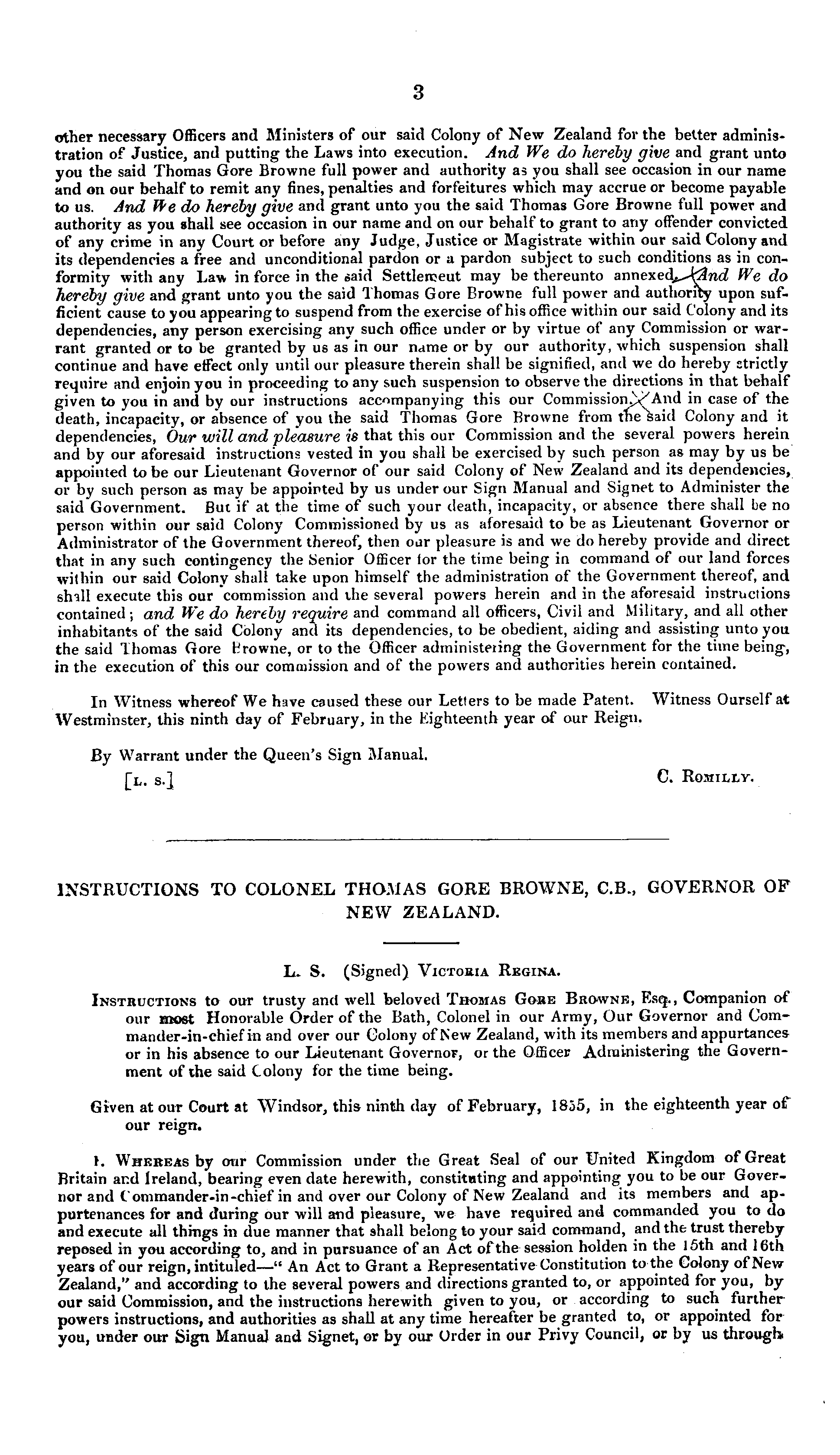 INSTRUCTIONS TO COLONEL THOMAS GORE BROWNE, C.8., GOVERNOR OF NEW ZEALAND. L. S. (Signed) Victoria Regina. Instructions to our trusty and well beloved Thomas Gore Browne, Esq., Companion of our most Honorable Order of the Bath, Colonel in our Army, Our Governor and Com-mander-in-chief in and over our Colony of New Zealand, with its members and appurtances or in his absence to our Lieutenant Governor, or the Officer Administering the Government of the said Colony for the time being. Given at our Court at Windsor, this ninth day of February, 1855, in the eighteenth year of our reign. f. Whereas by our Commission under the Great Seal of our United Kingdom of Great Britain and Ireland, bearing even date herewith, constituting and appointing you to be our Governor and Commander-in-chief in and over our Colony of New Zealand and its members and appurtenances for and during our will and pleasure, we have required and commanded you to do and execute all things ill due manner that shall belong to your said command, and the trust thereby reposed in you according to, and in pursuance of an Act of the session holden in the 15th and 16th years of our reign, intituled—" An Act to Grant a Representative Constitution to the Colony of New Zealand," and according to the several powers and directions granted to, or appointed for you, by our said Commission, and the instructions herewith given to you, or according to such further powers instructions, and authorities as shall at any time hereafter be granted to, or appointed for you, under our Sign Manual and Signet, or by our Order in our Privy Council, or by us through