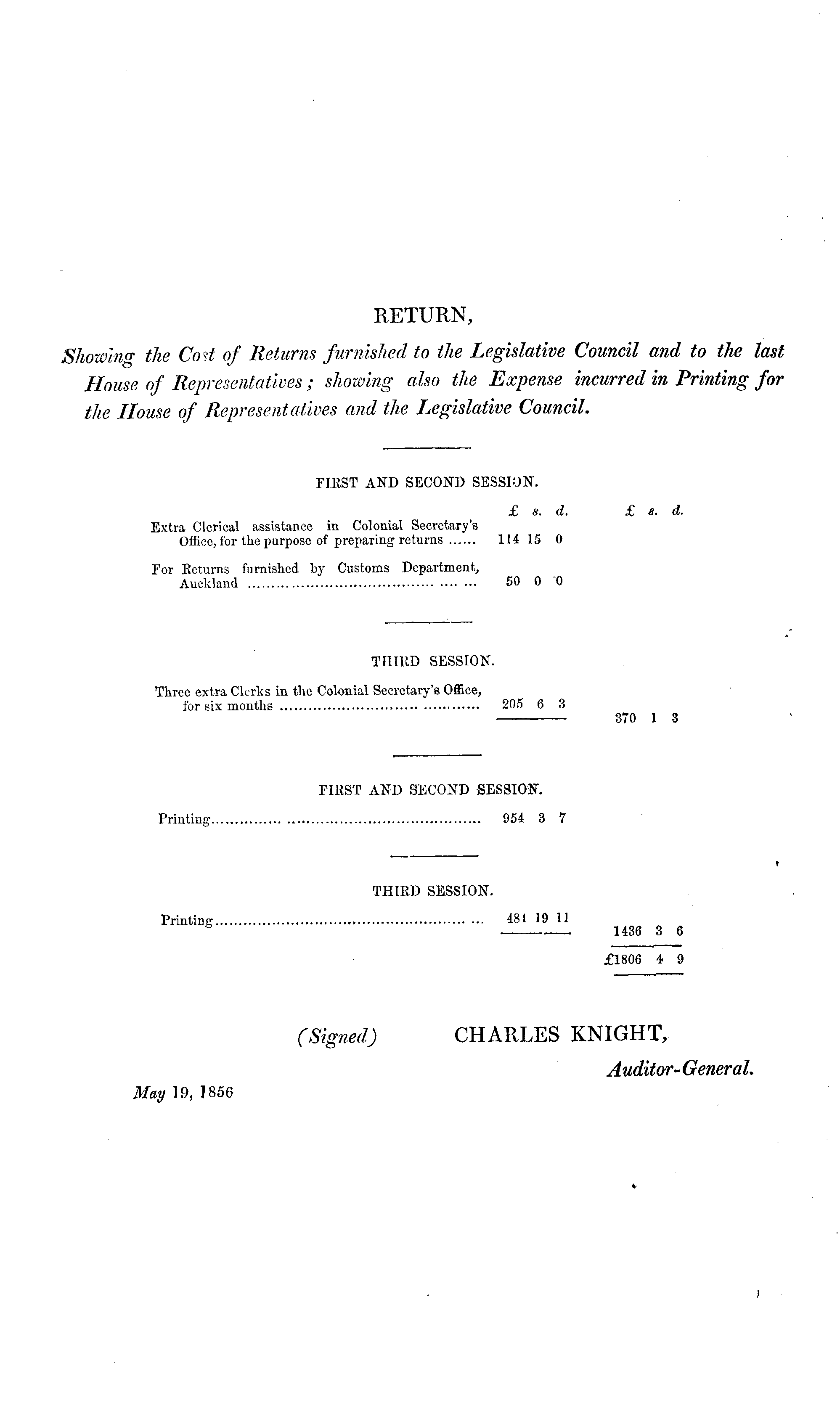 FIRST AND SECOND SESSION. £ s. d. £ a. d. Extra Clerical assistance in Colonial Secretary's Office, for the purpose of preparing returns 114 15 0 For Returns furnished by Customs Department, Auckland 50 0 0 THIRD SESSION. Three extra Clerks in the Colonial Secretary's Office, for six months 205 6 3 370 1 3 FIRST AND SECOND SESSION. Printing 954 3 7 t THIRD SESSION. Printing 481 19 11 b 1436 3 6 £1806 4 9 (Signed) CHARLES KNIGHT, Auditor-General. May 19, 1856 %■ t