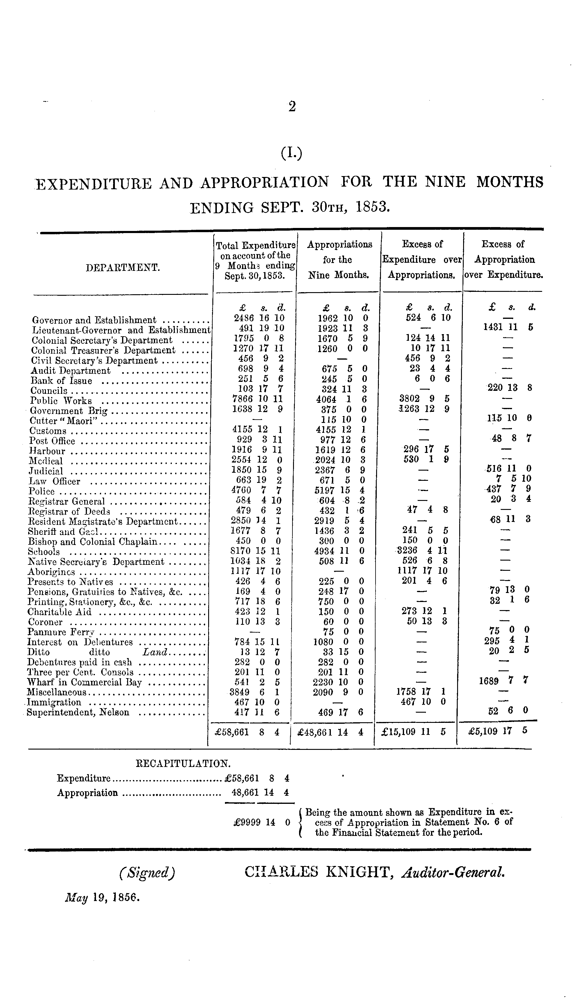 RECAPITULATION. Expenditure £58,661 8 4 Appropriation 48,661 14 4 ( Being the amount shown as Expenditure in ex£9999 14 0 J cess of Appropriation in Statement No. 6of ( the Financial Statement for the period. (Signed) CHARLES KNIGHT, Auditor-General. May 19, 1856.