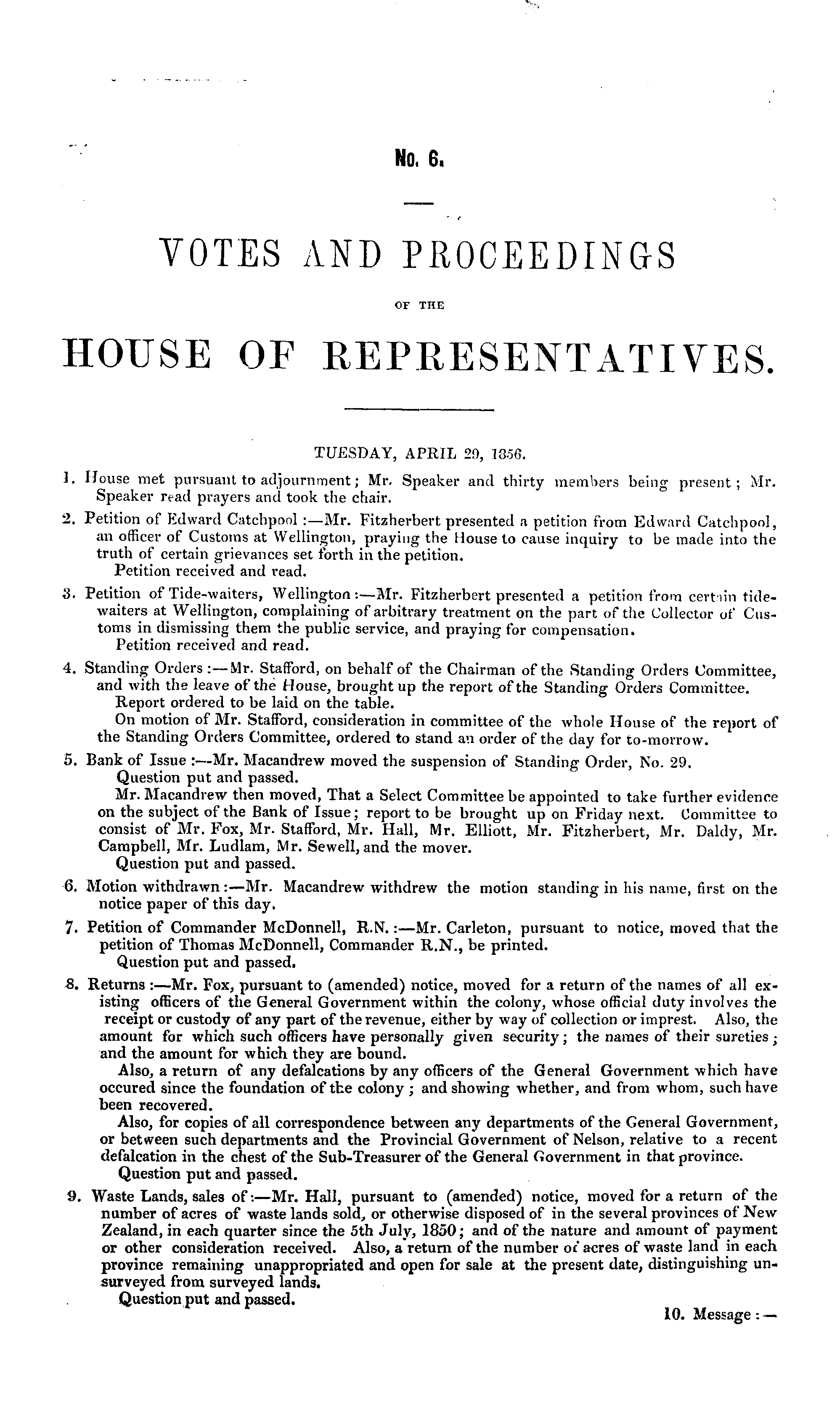TUESDAY, APRIL 29, 1356. 1. House met pursuant to adjournment; Mr. Speaker and thirty members being present; Mr. Speaker read prayers and took the chair. 2. Petition of Edward Catchpool :—Mr. Fitzherbert presented a petition from Edward Catchpool, an officer of Customs at Wellington, praying the House to cause inquiry to be made into the truth of certain grievances set forth in the petition. Petition received and read. 3. Petition of I ide-waiters, Wellington:—Mr. Fitzherbert presented a petition from certain tidewaiters at Wellington, complaining of arbitrary treatment on the part of the Collector of Customs in dismissing them the public service, and praying for compensation. Petition received and read. 4. Standing Orders : —Mr. Stafford, on behalf of the Chairman of the Standing Orders Committee, and with the leave of the House, brought up the report of the Standing Orders Committee. Report ordered to be laid on the table. On motion of Mr. Stafford, consideration in committee of the whole House of the report of the Standing Orders Committee, ordered to stand an order of the day for to-morrow. 5. Bank of Issue :—Mr. Macandrew moved the suspension of Standing Order, No. 29. Question put and passed. Mr. Macandrew then moved, That a Select Committee be appointed to take further evidence on the subject of the Bank of Issue; report to be brought up on Friday next. Committee to consist of Mr. Fox, Mr. Stafford, Mr, Hall, Mr. Elliott, Mr. Fitzherbert, Mr. Daldy, Mr. Campbell, Mr. Ludlam, Mr. Sewell, and the mover. Question put and passed. 6. Motion withdrawn :—Mr. Macandrew withdrew the motion standing in his name, first on the notice paper of this day. 7. Petition of Commander McDonnell, R.N.:—Mr. Carleton, pursuant to notice, moved that the petition of Thomas McDonnell, Commander R.N., be printed. Question put and passed. 8. Returns :—Mr. Fox, pursuant to (amended) notice, moved for a return of the names of all existing officers of the General Government within the colony, whose official duty involves the receipt or custody of any part of the revenue, either by way of collection or imprest. Also, the amount for which such officers have personally given security; the names of their sureties ; and the amount for which they are bound. Also, a return of any defalcations by any officers of the General Government which have occured since the foundation of the colony ; and showing whether, and from whom, such have been recovered. Also, for copies of all correspondence between any departments of the General Government, or between such departments and the Provincial Government of Nelson, relative to a recent defalcation in the chest of the Sub-Treasurer of the General Government in that province. Question put and passed. 9. Waste Lands, sales of:—Mr. Hall, pursuant to (amended) notice, moved for a return of the number of acres of waste lands sold, or otherwise disposed of in the several provinces of New Zealand, in each quarter since the sth July, 1850; and of the nature and amount of payment or other consideration received. Also, a return of the number of acres of waste land in each province remaining unappropriated and open for sale at the present date, distinguishing unsurveyed from surveyed lands. Question put and passed. 10. Message: —