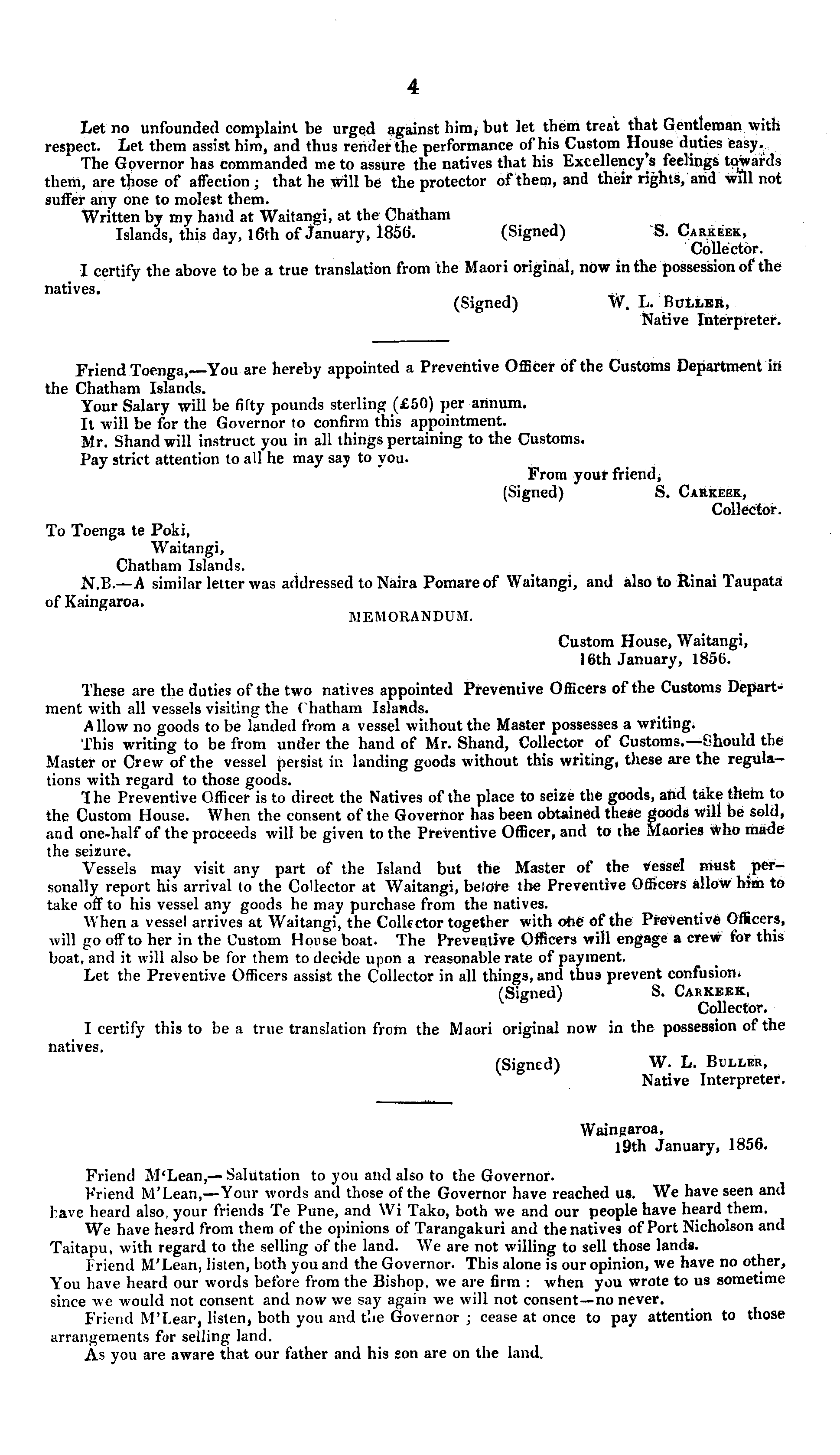Let no unfounded complain! be urged against him, but let them treat that Gentleman with respect. Let them assist him, and thus render the performance of his Custom House duties easy. The Governor has commanded me to assure the natives that his Excellency's feelings towards them, are those of affection ; that he will be the protector of them, and their rights, and will not suffer any one to molest them. Written by my hand at Waitangi, at the Chatham Islands, this day, 16th of January, 1856. (Signed) S. Carkeek, Collector. I certify the above to be a true translation from the Maori original, now in the possession of the natives. (Signed) W. L. Buli-er, Native Interpreter.
