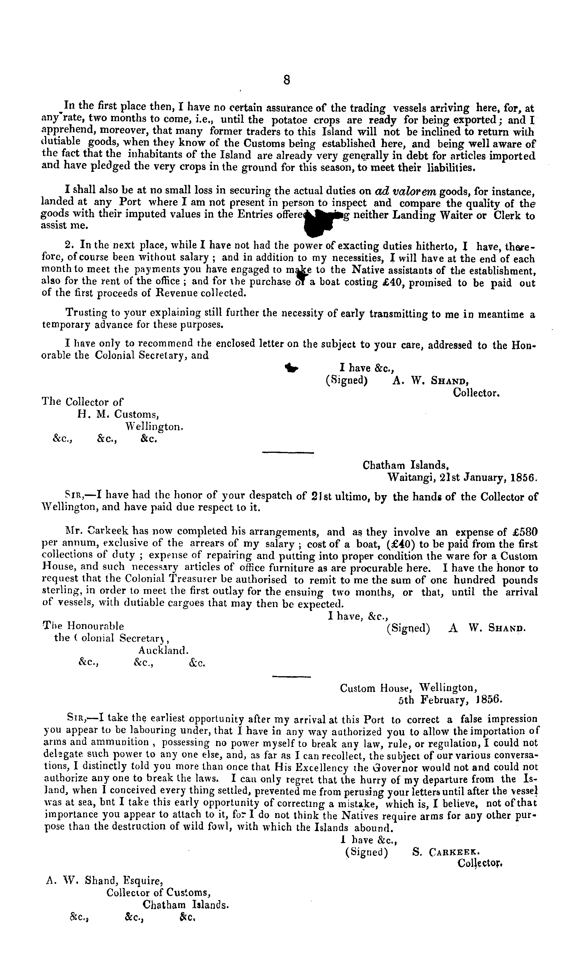 Custom House, Wellington, sth February, J 856. Sir,—I take th? earliest opportunity after my arrival at this Port to correct a false impression you appear to be labouring under, that I have in any way authorized you to allow the importation of arms and ammunition , possessing no power myself to break any law, rule, or regulation, I could not delegate such power to any one else, and, as far as I can recollect, the subject of our various conversations, I distinctly told you more than once that His Excellency the Governor would not and could not authorize any one to break the laws. I can only regret that the hurry of my departure from the Island, when I conceived every thing settled, prevented me from perusing your letters until after the vessel was at sea, bnt I take this early opportunity of correcting a mistake, which is, I believe, not of that importance you appear to attach to it, for I do not think the Natives require arms for any other purpose than the destruction of wild fowl, with which the Islands abound. I have &c., (Signed) S. Carkeek. Collector. A. W. Shand, Esquire, Collector of Customs, Chatham Islands. &c., &c., &c.