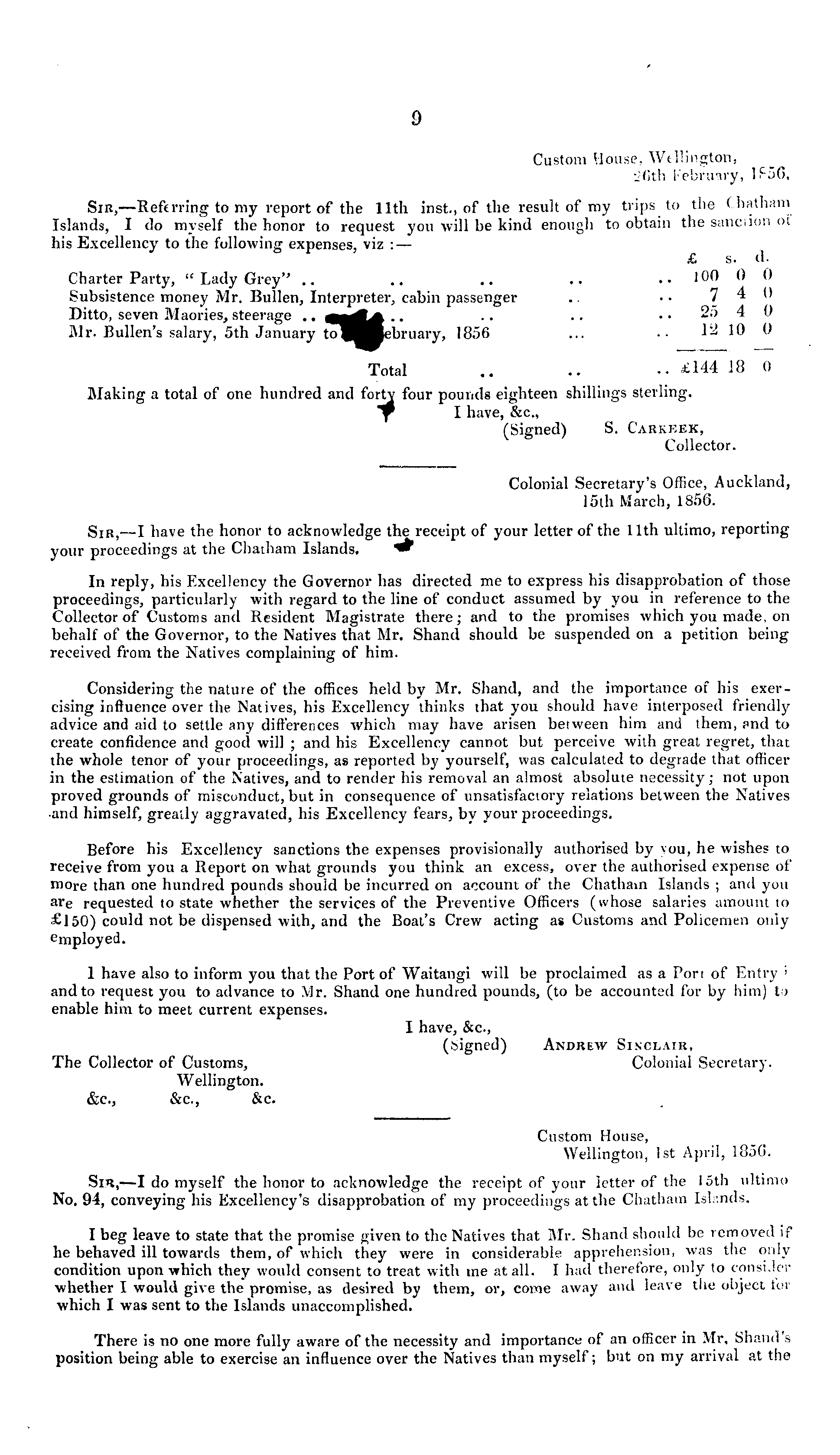 Custom House, Wellington, Ist April, 1856. Sin,—I do myself the honor to acknowledge the receipt of your letter of the loth ultimo No. 94, conveying his Excellency's disapprobation of my proceedings at the Chatham Islands. I beg leave to state that the promise given to the Natives that Mr. Shand should be removed if he behaved ill towards them, of which they were in considerable apprehension, was the only condition upon which they would consent to treat with me at all. I had therefore, only to consider whether I would give the promise, as desireel by them, or, come away and leave the object tor which I was sent to the Islands unaccomplished. There is no one more fully aware of the necessity and importance of an officer in Mr, Shand's position being able to exercise an influence over the Natives than myself; but on my arrival at the