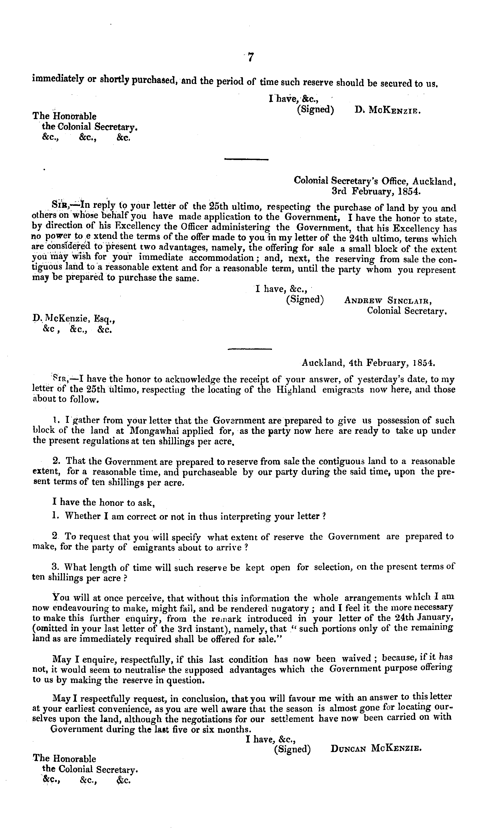 immediately or shortly purchased, and the period of time such reserve should be secured to us. I have, &c., The Honorable (Sig " ed) D> McKenziethe Colonial Secretary. &c., &c., &c. Colonial Secretary's Office, Auckland, 3rd February, 1854. ® IR » —I' 1 reply to your letter of the 25th ultimo, respecting the purchase of land by you and others on whose behalf you have made application to the Government, I have the honor to state, by direction of his Excellency the Officer administering the Government, that his Excellency has no power to extend the terms of the offer made to you in my letter of the 24th ultimo, terms which are considered to present two advantages, namely, the offering for sale a small block of the extent you may wish for your immediate accommodation; and, next, the reserving from sale the contiguous land to a reasonable extent and for a reasonable term, until the party whom you represent may be prepared to purchase the same. I have, &c., (Signed) Andrew Sinclair, . Colonial Secretary. D. McKenzie, Esq., &c, &c., &c. Auckland, 4th February, 1854. PfR, —I have the honor to acknowledge the receipt of your answer, of yesterday's date, to my letter of the 25th ultimo, respecting the locating of the Highland emigrants now here, and those about to follow. 1. I gather from your letter that the Government are prepared to give us possession of such block of the land at Mongawhai applied for, as the party now here are ready to take up under the present regulations at ten shillings per acre. 2. That the Government are prepared to reserve from sale the contiguous land to a reasonable extent, for a reasonable time, and purchaseable by our party during the said time, upon the present terms of ten shillings per acre. 1 have the honor to ask, 1. Whether I am correct or not in thus interpreting your letter ? 2 To request that you will specify what extent of reserve the Government are prepared to make, for the party of emigrants about to arrive ? 3. What length of time will such reserve be kept open for selection, on the present terms of ten shillings per acre ? You will at once perceive, that without this information the whole arrangements which I am now endeavouring to make, might fail, and be rendered nugatory ; and I feel it the more necessary to make this further enquiry, from the remark introduced in your letter of the 24th January, (omitted in your last letter of the 3rd instant), namely, that " such portions only of the remaining land as are immediately required shall be offered for sale." May I enquire, respectfully, if this last condition has now been waived; because, if it has not, it would seem to neutralise the supposed advantages which the Government purpose offering to us by making the reserve in question. May I respectfully request, in conclusion, that you will favour me with an answer to this letter at your earliest convenience, as you are well aware that the season is almost gone for locating ourselves upon the land, although the negotiations for our settlement have now been carried on with Government during the last five or six months. I have, &e., (Signed) Duncan McKenzie. The Honorable the Colonial Secretary. &c., &c., &c.