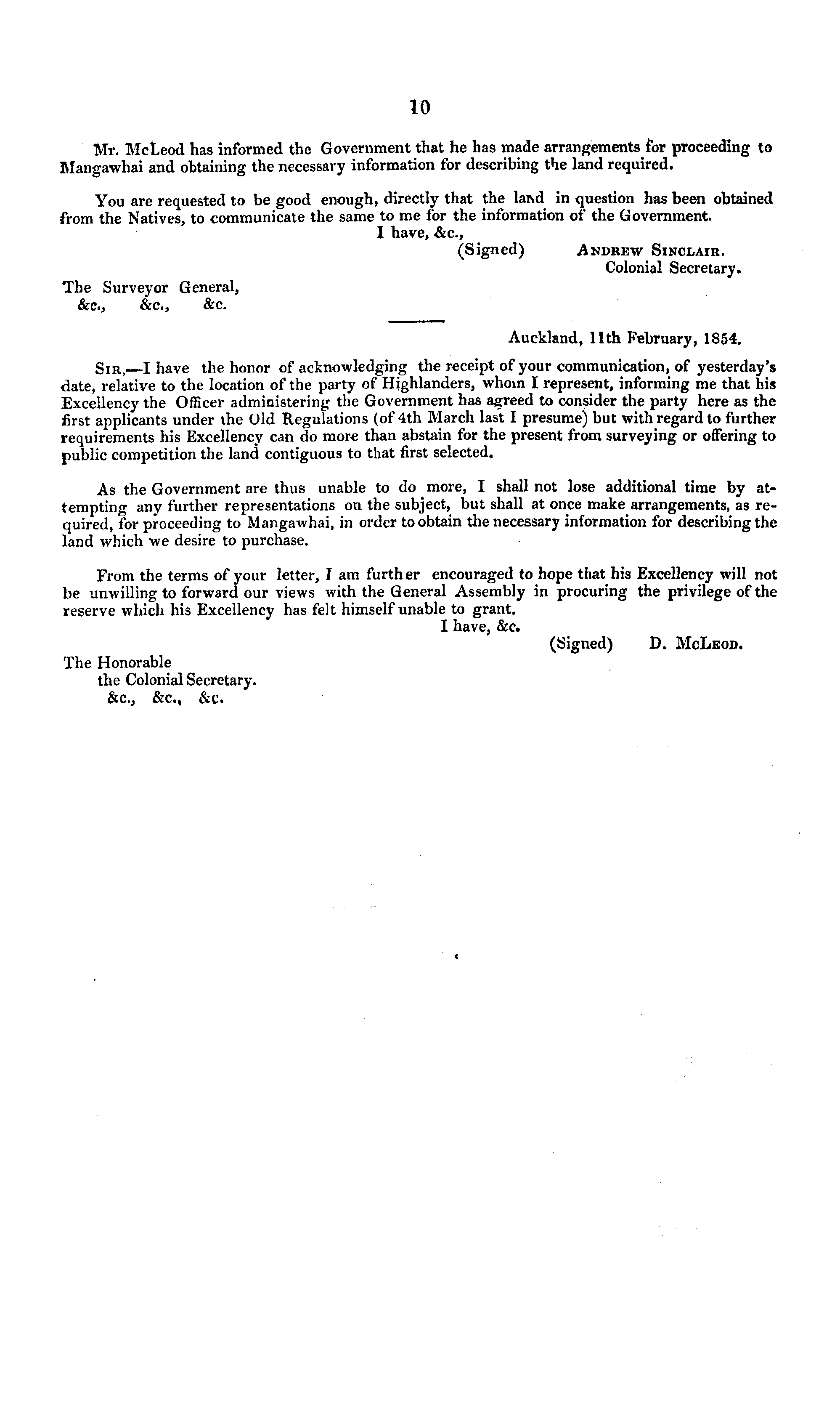Mr. McLeod has informed the Government that he has made arrangements for proceeding to Mangawhai and obtaining the necessary information for describing the land required. You are requested to be good enough, directly that the laisd in question has been obtained from the Natives, to communicate the same to me for the information of the Government. I have, &c., (Signed) Andrew Sinclair. Colonial Secretary. The Surveyor General, &c., &C.j &c. Auckland, 11th February, 1854. Sir, I have the honor of acknowledging the receipt of your communication, of yesterday's date, relative to the location of the party of Highlanders, whom I represent, informing me that his Excellency the Officer administering the Government has agreed to consider the party here as the first applicants under the Old Regulations (of 4th March last I presume) but with regard to further requirements his Excellency can do more than abstain for the present from surveying or offering to public competition the land contiguous to that first selected. As the Government are thus unable to do more, I shall not lose additional time by attempting any further representations on the subject, but shall at once make arrangements, as required, for proceeding to Mangawhai, in order to obtain the necessary information for describing the land which we desire to purchase. From the terms of your letter, I am further encouraged to hope that his Excellency will not be unwilling to forward our views with the General Assembly in procuring the privilege of the reserve which his Excellency has felt himself unable to grant. I have, &c. (Signed) D. McLeod. The Honorable the Colonial Secretary. &c., &c., &c. <