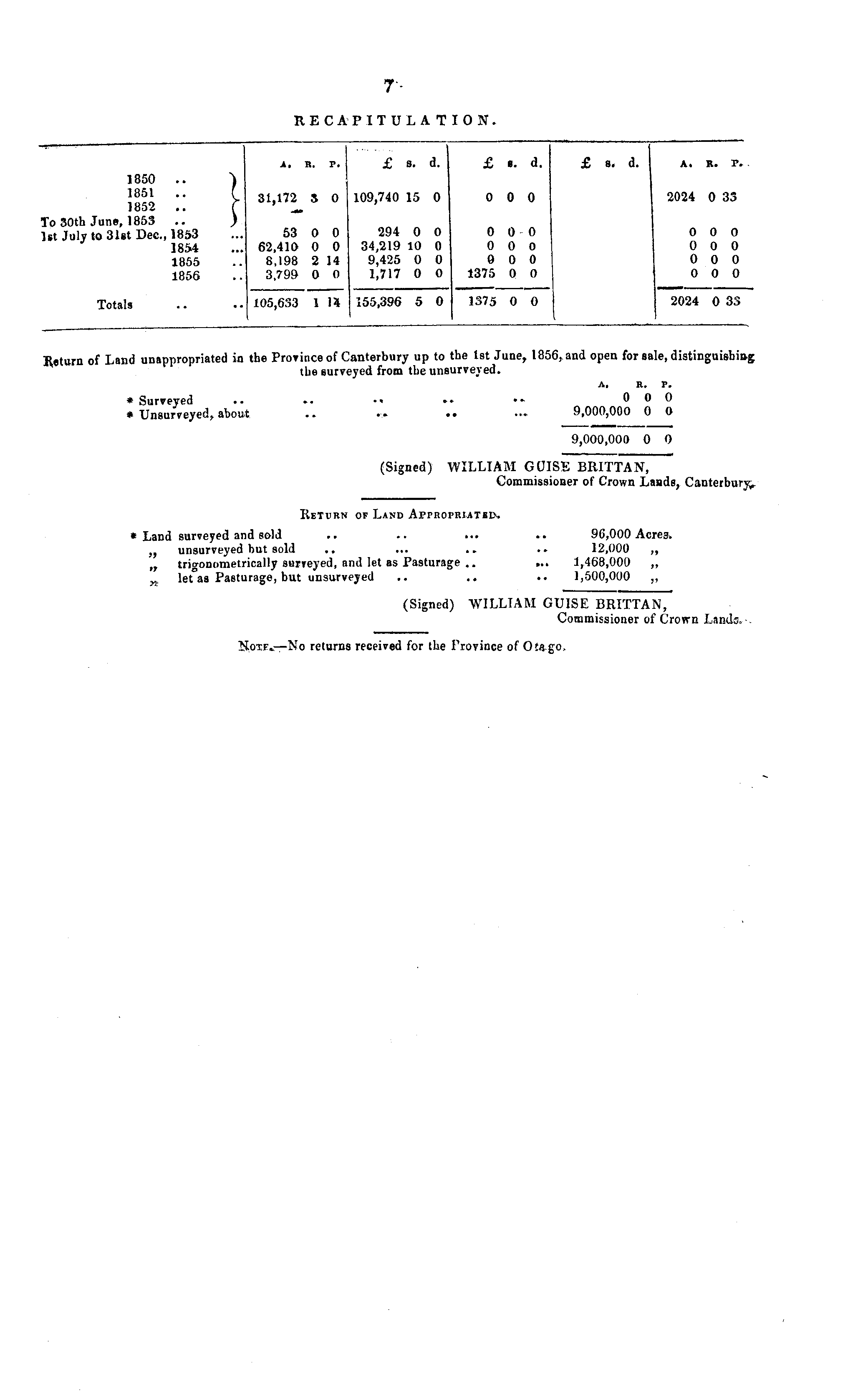 Return of Land unappropriated in the Province of Canterbury up to the Ist June, 1856, and open for sale, distinguishing the surveyed from the unsurveyed. A, R. P. * Surveyed .. ». * * »» • * 000 * Unsurveyed, about • - •• •.» 9,000,000 0 O 9,000,000 0 0 (Signed) WILLIAM GUISE BRITTAN, Commissioner of Crown Lands, Canterbury^ Return of Land Appropriate:*. * Land surveyed and sold .. ... 96,000 Acrea. „ unsurveyed but sold .. ... .» .» 12,000 ~ „ trigonometrically surveyed, and let as Pasturage .. ... 1,468,000 „ let as Pasturage, but unsurveyed .. .. .. 1,500,000 „ (Signed) WILLIAM GUISE BRITTAN, Commissioner of Crown Lands,