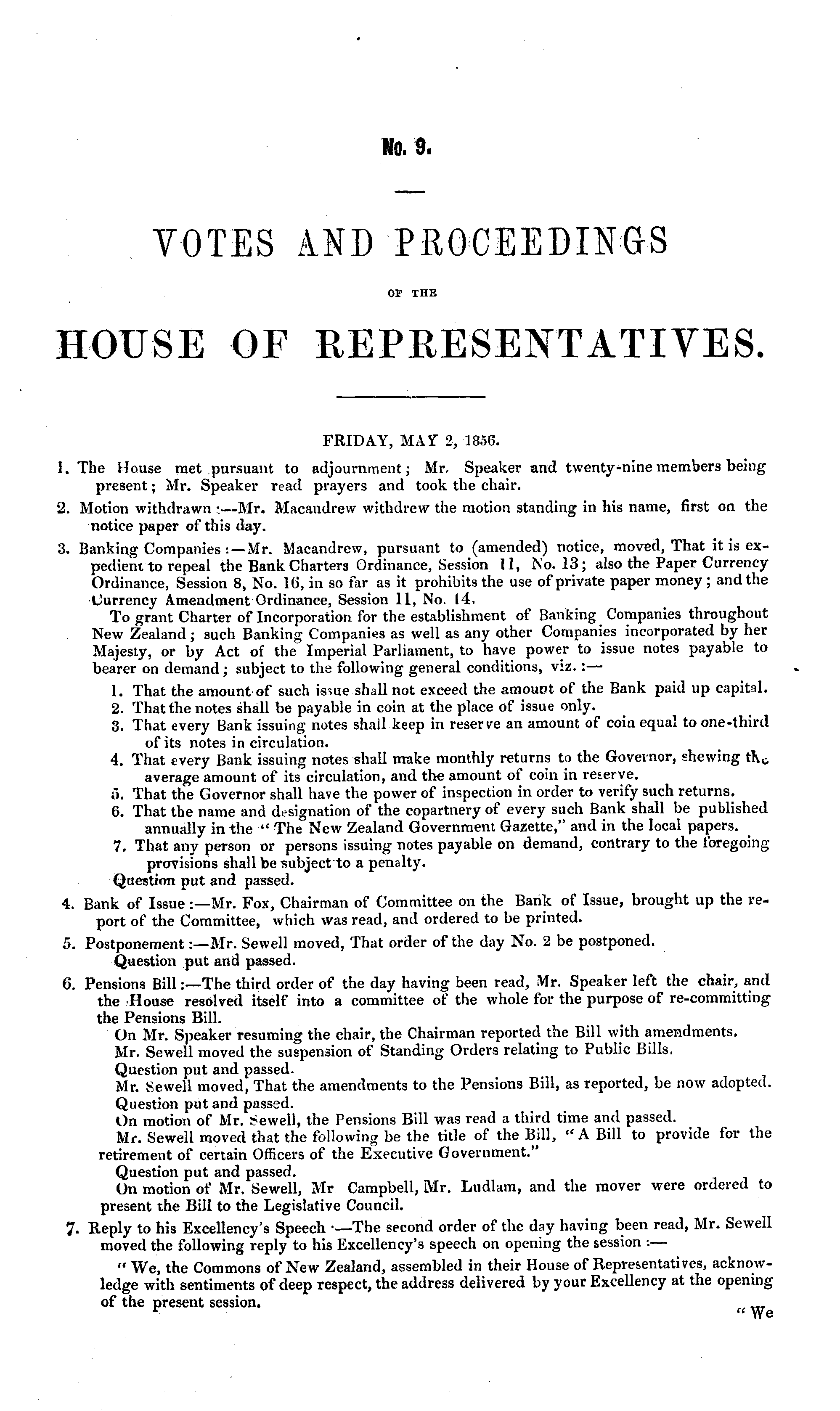 FRIDAY, MA5f 2, 1856. 1. The House met pursuant to adjournment; Mr. Speaker and twenty-nine members being present; Mr. Speaker read prayers and took the chair. 2. Motion withdrawn • —Mr. Macandrew withdrew the motion standing in his name, first on the notice paper of this day. 3. Banking Companies :—Mr. Macandrew, pursuant to (amended) notice, moved, That it is expedient to repeal the Bank Charters Ordinance, Session 11, No. 13; also the Paper Currency Ordinance, Session 8, No. 16, in so far as it prohibits the use of private paper money ; and the Currency Amendment Ordinance, Session 11, No. 14. To grant Charter of Incorporation for the establishment of Banking Companies throughout New Zealand; such Banking Companies as well as any other Companies incorporated by her Majesty, or by Act of the Imperial Parliament, to have power to issue notes payable to bearer on demand; subject to the following general conditions, v:z. : — 1. That the amount of such issue shall not exceed the amount of the Bank paid up capital. 2. That the notes shall be payable in coin at the place of issue only. 3. That every Bank issuing notes shall keep in reserve an amount of coin equal to one-third of its notes in circulation. 4. That every Bank issuing notes shall make monthly returns to the Governor, shewing tK u average amount of its circulation, and the amount ot coin in reserve. That the Governor shall have the power of inspection in order to verity such returns. C. That the name and designation of the copartnery of every such Bank shall be published annually in the " The New Zealand Government Gazette," and in the local papers. 7. That any person or persons issuing notes payable on demand, contrary to the foregoing provisions shall be subject to a penalty. Question put and passed. 4. Bank of Issue Mr. Fox, Chairman of Committee on the Bank of Issue, brought up the report of the Committee, which was read, and ordered to be printed. 5. Postponement:—Mr. Sewell moved, That order of the day No. 2 be postponed. Question put and passed. 6. Pensions Bill: —The third order of the day having been read, Mr. Speaker left the chair, and the House resolved itself into a committee of the whole for the purpose of re-committing the Pensions Bill. On Mr. Speaker resuming the chair, the Chairman reported the Bill with amendments. Mr. Sewell moved the suspension of Standing Orders relating to Public Bills. Question put and passed. Mr. Sewell moved, That the amendments to the Pensions Bill, as reported, be now adopted. Question put and passed. On motion of Mr. Sewell, the Pensions Bill was read a third time and passed. Mr. Sewell moved that the following be the title of the Bill, "A Bill to provide for the retirement of certain Officers of the Executive Government.' Question put and passed. On motion of Mr. Sewell, Mr Campbell, Mr. Ludlam, and the mover were ordered to present the Bill to the Legislative Council. 7. Reply to his Excellency's Speech • —The second order of the day having been read, Mr. Sewell moved the following reply to his Excellency's speech on opening the session ■■ — " We, the Commons of New Zealand, assembled in their House of Representatives, acknowledge with sentiments of deep respect, the address delivered by your Excellency at the opening of the present session.