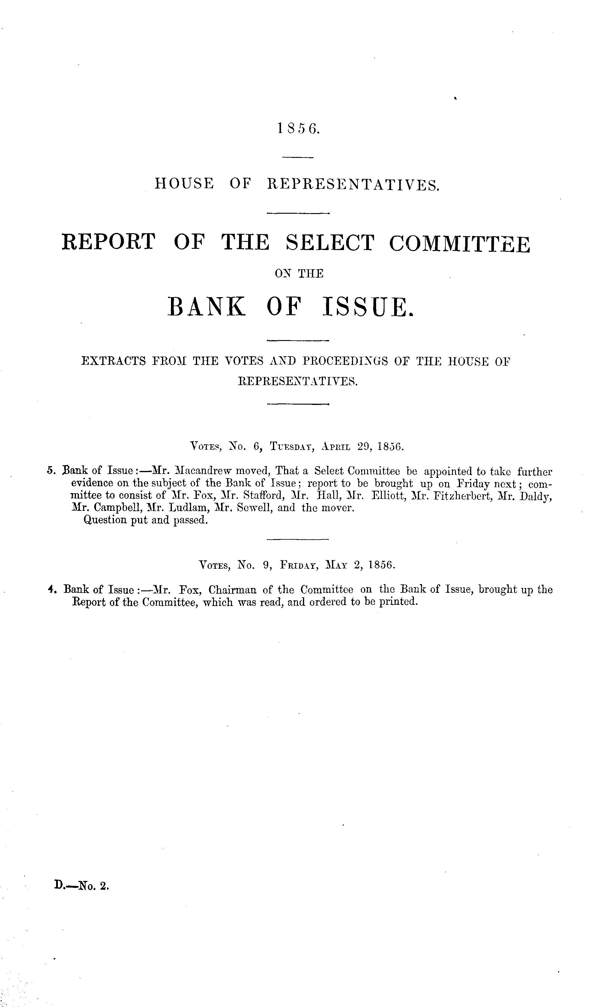 Votes, Xo. 6, Tuesday, April 29, 18-56. 5. Bank of Issue:—Mr. Macandrew moved, That a Select Committee be appointed to take further evidence on the subject of the Bank of Issue; report to be brought up on Friday next; committee to consist of Mr. Fox, Mr. Stafford, Mr. Hall, Mr. Elliott, Mr. Fitzherbert, Mr. Daldy, Mr. Campbell, Mr. Ludlam, Mr. Sewell, and the mover. Question put and passed. Votes, No. 9, Friday, May 2, 1856. 4. Bank of Issue : —Mr. Fox, Chairman of the Committee on the Bank of Issue, brought up the Report of the Committee, which was read, and ordered to be printed.
