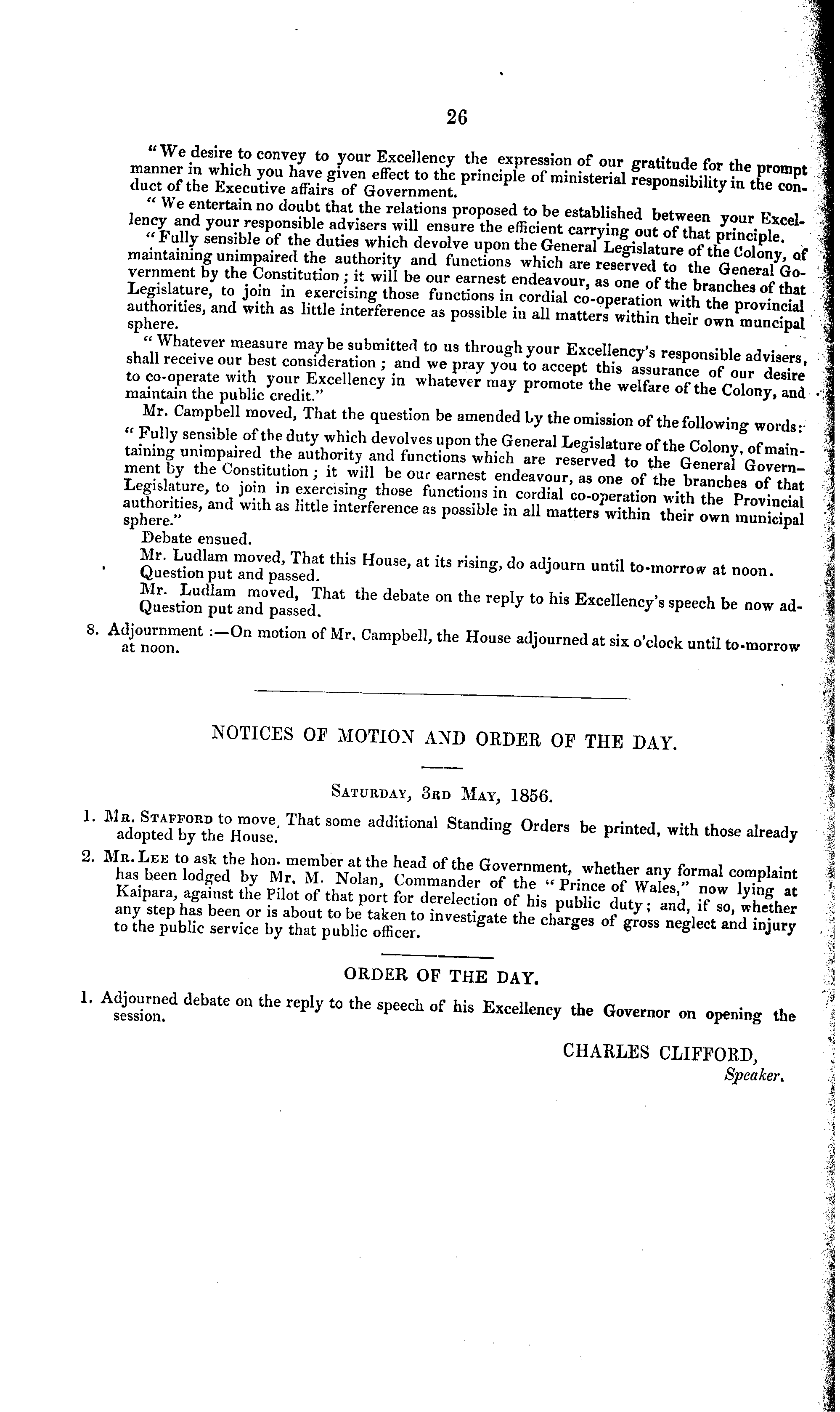 ORDER OF THE DAY. 1. Adjourned debate on the reply to the sneech of Fv™n„™ .-i, n session. 1 ' P S - hxcellen cy the Governor on opening the CHARLES CLIFFORD, Speaker. %