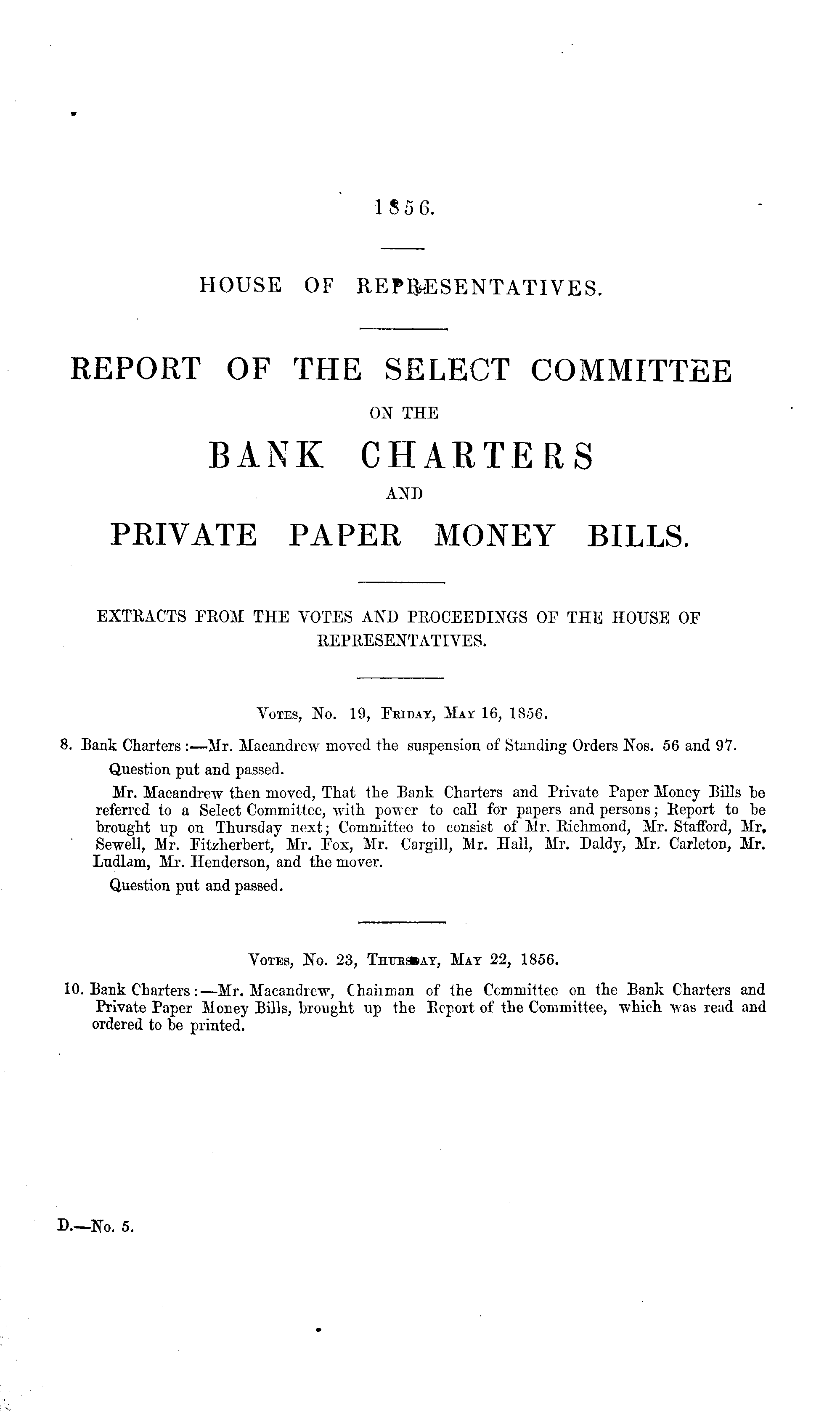 Votes, No. 19, Friday, May 16, 1856. 8. Bank Charters :—Mr. Macandrew moved the suspension of Standing Orders Nos. 56 and 97. Question put and passed. Mr. Macandrew then moved, That the Bank Charters and Private Paper Money Bills he referred to a Select Committee, with power to call for papers and persons; Report to be brought up on Thursday next; Committee to consist of Hr. Richmond, Mr. Stafford, Mr, Sewell, Mr. Pitzherbert, Mr. Pox, Mr. Cargill, Mr. Hall, Mr. Daldy, Mr. Carleton, Mr. Ludlam, Mr. Henderson, and the mover. Question put and passed. Yotes, NO. 23, TmjEf»AY, MAY 22, 1856. 10, Bank Charters:—Mr. Macandrcw, Chaiiman of the Committee on the Bank Charters and Private Paper Honey Bills, brought up the Report of the Committee, which was read and ordered to be printed.