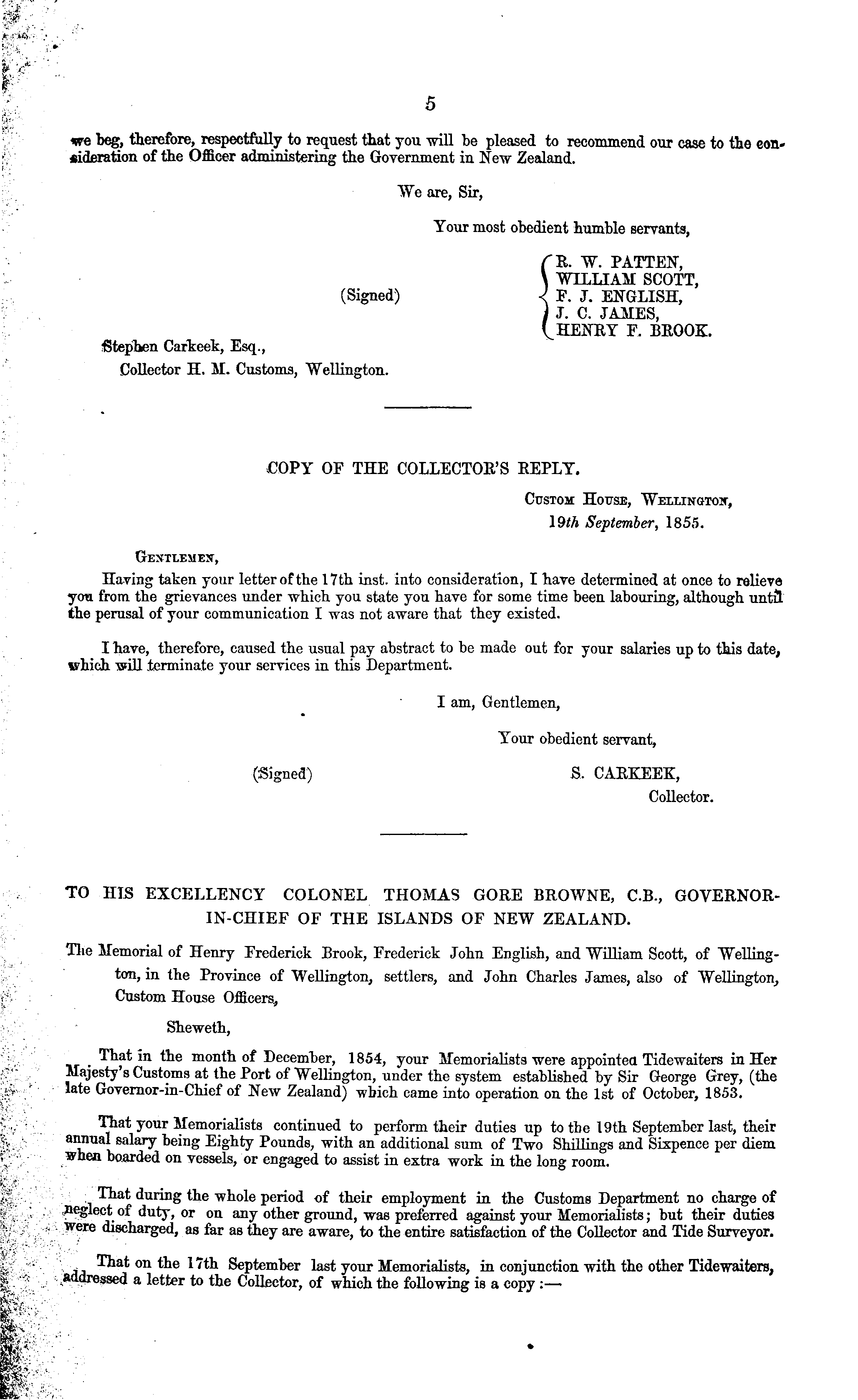 we beg, therefore, respectfully to request that you -will be pleased to recommend our case to the consideration of the Officer administering the Government in New Zealand. We are, Sir, Your most obedient humble servants, (R. W. PATTEN, \ WILLIAM SCOTT, (Signed) 1 F. J. ENGLISH, I J. C. JAMES, V. HENRY F. BROOK. ■Stephen Carkeek, Esq., Collector H. M. Customs, Wellington. COPY OF THE COLLECTOR'S REPLY. Custom House, Wellington, 19th September, 1855. Gentlemen, Having taken your letter of the 17th inst. into consideration, I have determined at once to relieve you from the grievances under which you state you have for some time been labouring, although until the perusal of your communication I was not aware that they existed. I have, therefore, caused the usual pay abstract to be made out for your salaries up to this date, which will terminate your services in this Department. I am, Gentlemen, Your obedient servant, (Signed) S. CARKEEK, Collector. TO HIS EXCELLENCY COLONEL THOMAS GORE BROWNE, C.8., GOVERNOR-IN-CHIEF OF THE ISLANDS OF NEW ZEALAND. The Memorial of Henry Frederick Brook, Frederick John English, and William Scott, of Wellington, in the Province of Wellington, settlers, and John Charles James, also of Wellington, Custom House Officers, Sheweth, 1 hat in the month of December, 1854, your Memorialists were appointed Tidewaiters in Her Majesty s Customs at the Port ot Wellington, under the system established by Sir George Grey, (the late Governor-in-Chief of New Zealand) wbich came into operation on the Ist of October, 1853. That your Memorialists continued to perform their duties up to the 19th September last, their annual salary being Eighty Pounds, with an additional sum of Two Shillings and Sixpence per diem when boarded on vessels, or engaged to assist in extra work in the long room. That during the whole period of their employment in the Customs Department no charge of neglect of duty, or on any other ground, was preferred against your Memorialists; but their duties ere discharged, as far as they are aware, to the entire satisfaction of the Collector and Tide Surveyor. ,ii on ' "th September last your Memorialists, in conjunction with the other Tidewaiters, addressed a letter to the Collector, of which the following is a copy :— ♦