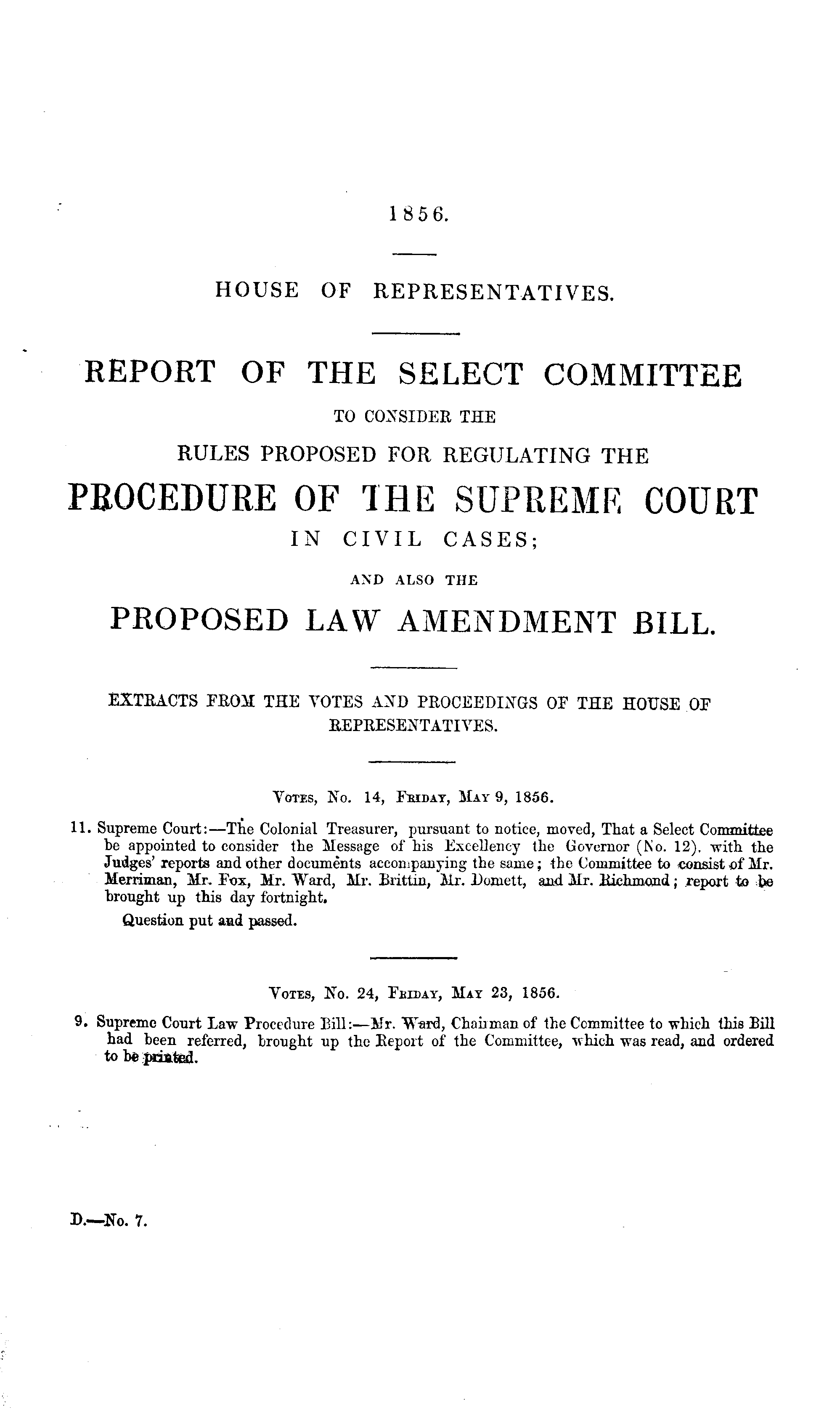 Votes, No. 24, Fmday, May 23, 1856. 9. Supreme Court Law Procedure Bill:—Mr. Ward, Chaiiman of the Committee to which this Bill had been referred, brought up the Report of the Committee, which was read, and ordered to be printed.