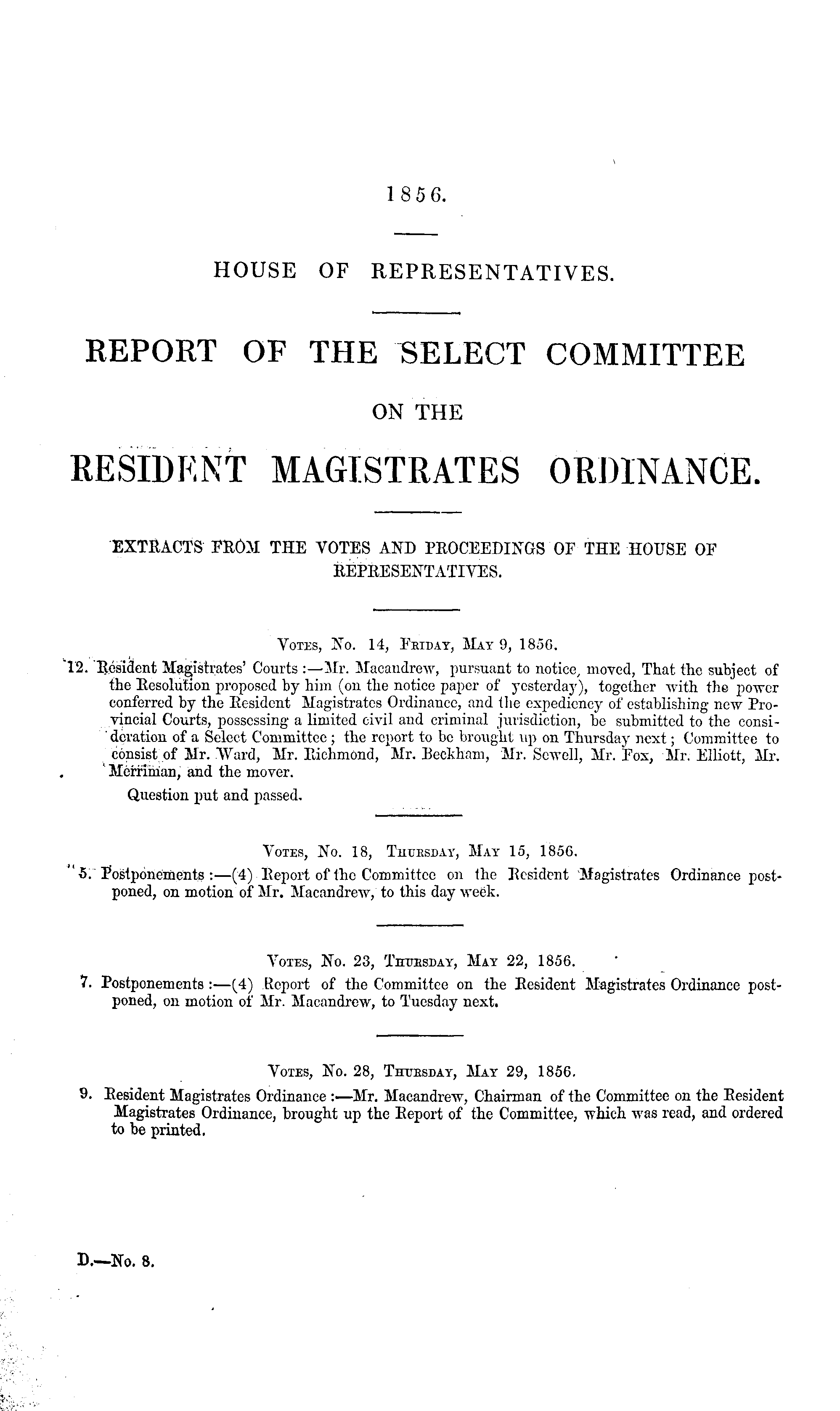 Votes, No. 28, Thursday, May 29, 1856. 9. Resident Magistrates Ordinance :—Mr. Macandrew, Chairman of the Committee on the Resident Magistrates Ordinance, brought up the Report of the Committee, which was read, and ordered to be printed.