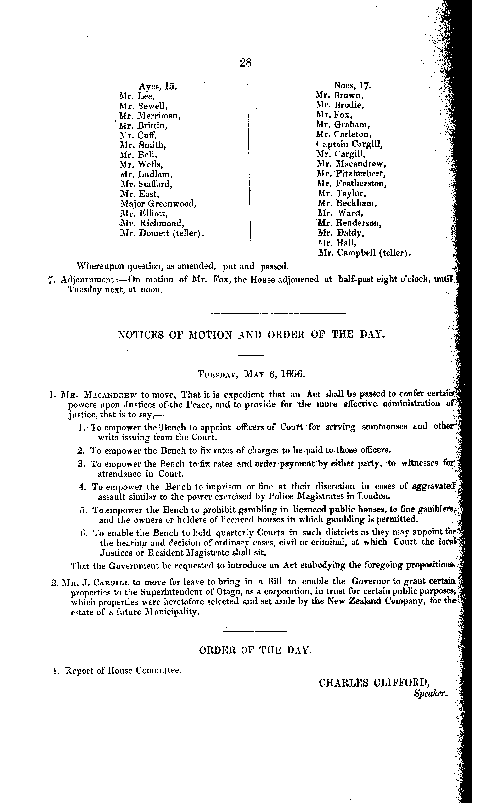 NOTICES OF MOTION AND ORDER OF THE DAY. Tuesday, May 6, 1856. 1. Mr. Macandhew to move, That it is expedient that an Act shall be passed to confer certain powers upon Justices of the Peace, and to provide for the more effective administration of justice, that is to say,— ].- To empower the Bench to appoint officers of Court for serving summonses and other writs issuing from the Court. 2. To empower the Bench to fix rates of charges to be paid to those officers. 3. To empower the.Bench to fix rates and order payment by either party, to witnesses tor attendance in Court. 4. To empower the Bench to imprison or fine at their discretion in cases of aggravated assault similar to the power exercised by Police Magistrates in London. 5. To empower the Bench to prohibit gambling in licenced public houses, to fine gamblers, and the owners or holders of licenced houses in which gambling is permitted. 6. To enable the Bench to hold quarterly Courts in such districts as they may appoint for the hearing and decision of ordinary cases, civil or criminal, at which Court the locai Justices or Resident Magistrate shall sit. That the Government be requested to introduce an Act embodying the foregoing propositions. 2. Mr. J. Cargill to move for leave to bring in a Bill to enable the Governor to grant certain propertbs to the Superintendent of Otago, as a corporation, in trust for certain public purposes, which properties were heretofore selected and set aside by the New Zealand Company, for the estate of a future Municipality.
