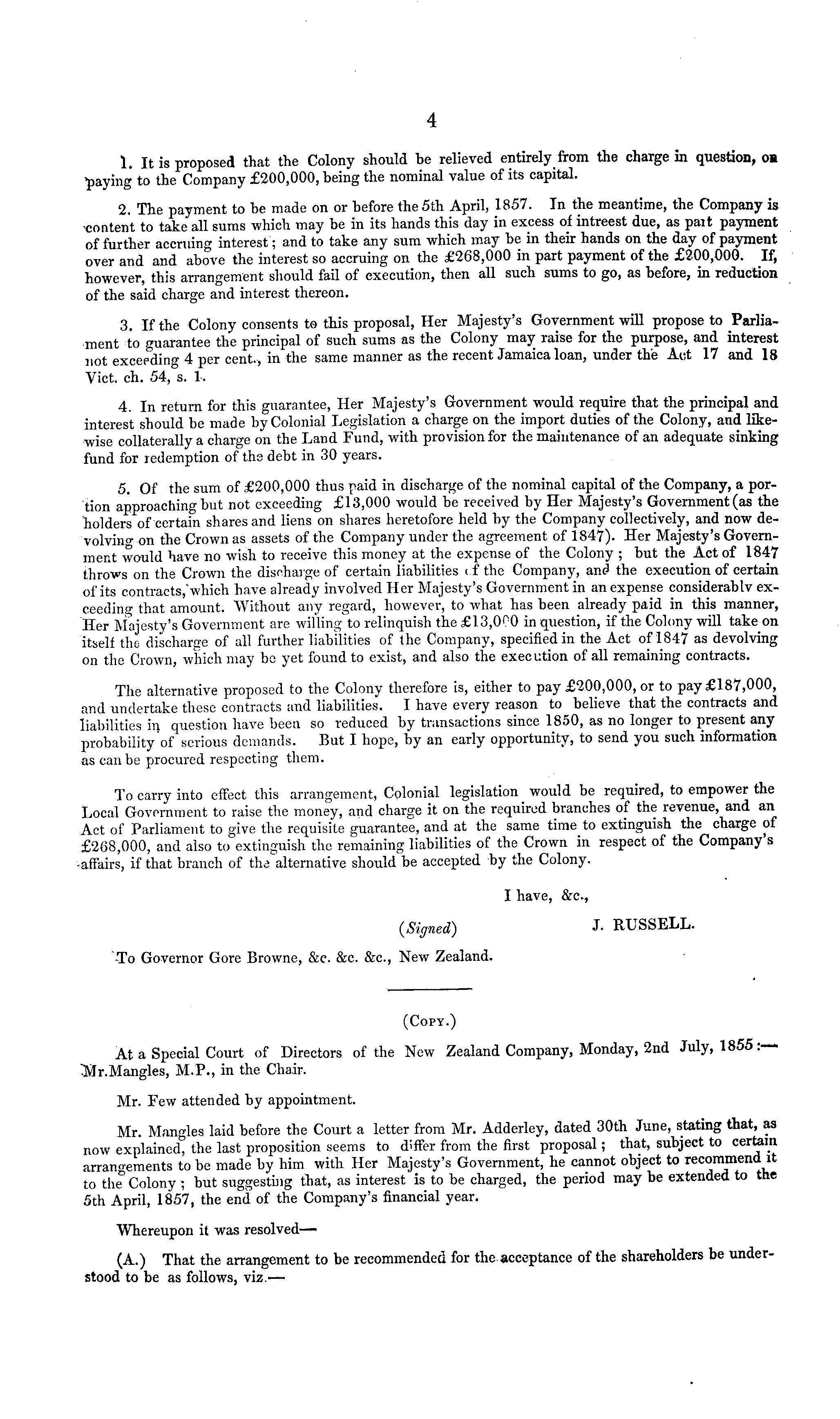 1. It is proposed that the Colony should be relieved entirely from the charge in question, o* paying to the Company £200,000, being the nominal value of its capital. 2. The payment to be made on or before the sth April, 1857. In the meantime, the Company is •content to take all sums which may be in its hands this day in excess of intreest due, as pait payment of further accruing interest; and to take any sum which may be in their hands on the day of payment over and and above the interest so accruing on the £268,000 in part payment of the £200,000. If, however, this arrangement should fail of execution, then all such sums to go, as before, in reduction of the said charge and interest thereon. 3. If the Colony consents to this proposal, Her Majesty's Government will propose to Parliament to guarantee the principal of such sums as the Colony may raise for the purpose, and interest not exceeding 4 per cent., in the same manner as the recent Jamaica loan, under the Act 17 and 18 Vict. ch. 54, s. 1. 4. In return for this guarantee, Her Majesty's Government would require that the principal and interest should be made by Colonial Legislation a charge on the import duties of the Colony, and likewise collaterally a charge on the Land Fund, with provision for the maintenance of an adequate sinking fund for redemption of the debt in 30 years. 5. Of the sum of £200,000 thus paid in discharge of the nominal capital of the Company, a portion approaching but not exceeding £13,000 would be received by Her Majesty's Government (as the holders of certain shares and liens on shares heretofore held by the Company collectively, and now devolving on the Crown as assets of the Company under the agreement of 1847). Her Majesty's Government would have no wish to receive this money at the expense of the Colony ; but the Act of 1847 throws on the Crown the discharge of certain liabilities i f the Company, the execution of certain of its contracts,'which have already involved Her Majesty's Government in an expense considerablv exceeding that amount. Without any regard, however, to what has been already paid in this manner, Her Majesty's Government are willing to relinquish the £13,000 in question, if the Colony will take on itself the discharge of all further liabilities of the Company, specified in the Act of 1847 as devolving on the Crown, which may be yet found to exist, and also the execution of all remaining contracts. The alternative proposed to the Colony therefore is, either to pay £200,000, or to pay £187,000, and undertake these contracts and liabilities. I have every reason to believe that the contracts and liabilities in question have been so reduced by transactions since 1850, as no longer to present any probability of serious demands. But I hope, by an early opportunity, to send you such information as can be procured respecting them. To carry into effect this arrangement, Colonial legislation would be required, to empower the Local Government to raise the money, and charge it on the required branches of the revenue, and an Act of Parliament to give the requisite guarantee, and at the same time to extinguish the charge of £268,000, and also to extinguish the remaining liabilities of the Crown in respect of the Company s •affairs, if that branch of the alternative should be accepted by the Colony. I have, &c., (Signed) J- RUSSELL. To Governor Gore Browne, &c. &c. &c., New Zealand, (Copy.) At a Special Court of Directors of the New Zealand Company, Monday, 2nd July, 1855. M.P., in the Chair. Mr. Few attended by appointment. Mr. Mangles laid before the Court a letter from Mr. Adderley, dated 30th June, stating that, as now explained, the last proposition seems to differ from the first proposal; that, subject to certain arrangements to be made by him with Her Majesty's Government, he cannot object to recommend it to the Colony ; but suggesting that, as interest is to be charged, the period may be extended to the sth April, 1857, the end of the Company's financial year. Whereupon it was resolved — (A.) That the arrangement to be recommended for the acceptance of the shareholders be understood to be as follows, viz.—