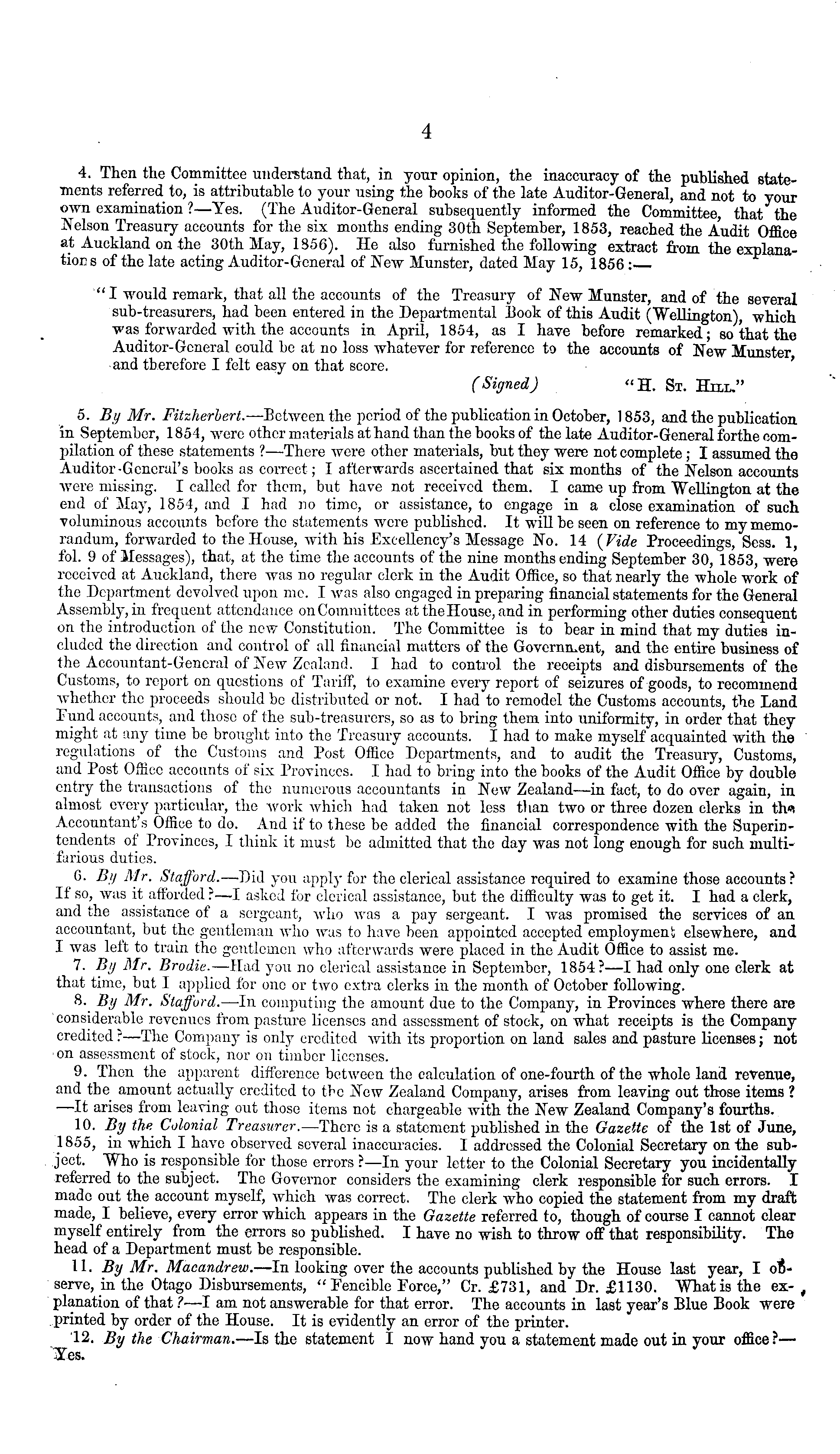 4. Then the Committee understand that, in your opinion, the inaccuracy of the published statements referred to, is attributable to your using the books of the late Auditor-General, and not to your own examination ?—Yes. (The Auditor-General subsequently informed the Committee, that the Nelson Treasury accounts for the six months ending 30th September, 1853, reached the Audit Office at Auckland on the 30th May, 1856). He also furnished the following extract from the explanations of the late acting Auditor-General of New Munster, dated May 15, 1856 :— " I would remark, that all the accounts of the Treasury of New Munster, and of the several sub-treasurers, had been entered in the Departmental Book of this Audit (Wellington), which was forwarded with the accounts in April, 1854, as I have before remarked; so'that the Auditor-General could be at no loss whatever for reference to the accounts of New Munster and therefore I felt easy on that score. (Signed) "H. St. Hell." 5. By Mr. Fitzlierbert. —Between the period of the publication in October, 1853, and the publication in September, 1854, were other materials at hand than the books of the late Auditor-General forthe compilation of these statements ?—There were other materials, but they were not complete ; I assumed the Auditor-General's books as correct; I afterwards ascertained that six months of the Nelson accounts were missing. I called for them, but have not received them. I came up from Wellington at the end of May, 1854, and I had no time, or assistance, to engage in a close examination of such voluminous accounts before the statements were published. It will be seen on reference to my memorandum, forwarded to the House, with his Excellency's Message No. 14 (Vide Proceedings, Sess. 1, fol. 9 of Messages), that, at the time the accounts of the nine months ending September 30, 1853, were received at Auckland, there was no regular clerk in the Audit Office, so that nearly the whole work of the Department devolved upon me. I was also engaged in preparing financial statements for the General Assembly, in frequent attendance on Committees at the House, and in performing other duties consequent on the introduction of the new Constitution. The Committee is to bear in mind that my duties included the direction and control of all financial matters of the Government, and the entire business of the Accountant-General of New Zealand. I had to control the receipts and disbursements of the Customs, to report on questions of Tariff, to examine every report of seizures of goods, to recommend whether the proceeds should be distributed or not. I had to remodel the Customs accounts, the Land Fund accounts, and those of the sub-treasurers, so as to bring them into uniformity, in order that they might at any time be brought into the Treasury accounts. I had to make myself acquainted with the regulations of the Customs and Post Office Departments, and to audit the Treasury, Customs, and Post Office accounts of six Provinces. I had to bring into the books of the Audit Office by double entry the transactions of the numerous accountants in New Zealand—in fact, to do over again, in almost every particular, the work which had taken not less than two or three dozen clerks in thu Accountant's Office to do. And if to those be added the financial correspondence with the Superintendents ot Provinces, I think it must be admitted that the day was not long enough for such multifarious duties. 6. By Mr. Stafford. —Did you apply for the clerical assistance required to examine those accounts? If so, was it afforded ?—I asked for clerical assistance, but the difficulty was to get it. I had a clerk, and the assistance of a sergeant, who was a pay sergeant. I was promised the services of an accountant, but the gentleman who was to have been appointed accepted employment elsewhere, and I was lett to train the gentlemen who afterwards were placed in the Audit Office to assist me. 7. By Mr. Brodie.—Had you no clerical assistance in September, 1854?— I had only one clerk at that time, but I applied for one or two extra clerks in the month of October following. 8. By Mr. Stafford. —In computing the amount due to the Company, in Provinces where there are considerable revenues from pasture licenses and assessment of stock, on what receipts is the Company credited r—The Company is only credited with its proportion on land sales and pasture licenses; not on assessment of stock, nor on timber licenses. 9. Then the apparent difference between the calculation of one-fourth of the whole land revenue, and the amount actually credited to the New Zealand Company, arises from leaving out those items ? —It arises from leaving out those items not chargeable with the New Zealand Company's fourths. 10. By the Colonial Treasurer.—There is a statement published in the Gazette of the Ist of June, 1855, in which I have observed several inaccuracies. I addressed the Colonial Secretary on the subject. Who is responsible for those errors ?—ln your letter to the Colonial Secretary you incidentally referred to the subject. The Governor considers the examining clerk responsible for such errors. I made out the account myself, which was correct. The clerk who copied the statement from my draft made, I believe, every error which appears in the Gazette referred to, though of course I cannot clear myself entirely from the errors so published. I have no wish to throw off that responsibility. The head of a Department must be responsible. 11. By Mr. Macandrew.—ln looking over the accounts published by the House last year, I observe, in the Otago Disbursements, "Feneible Force," Cr. £731, and Dr. £1130. What is the ex- , planation of that ?—I am not answerable for that error. The accounts in last year's Blue Book were printed by order of the House. It is evidently an error of the printer. 12. By the Chairman.—ls the statement I now hand you a statement made out in your office?— 