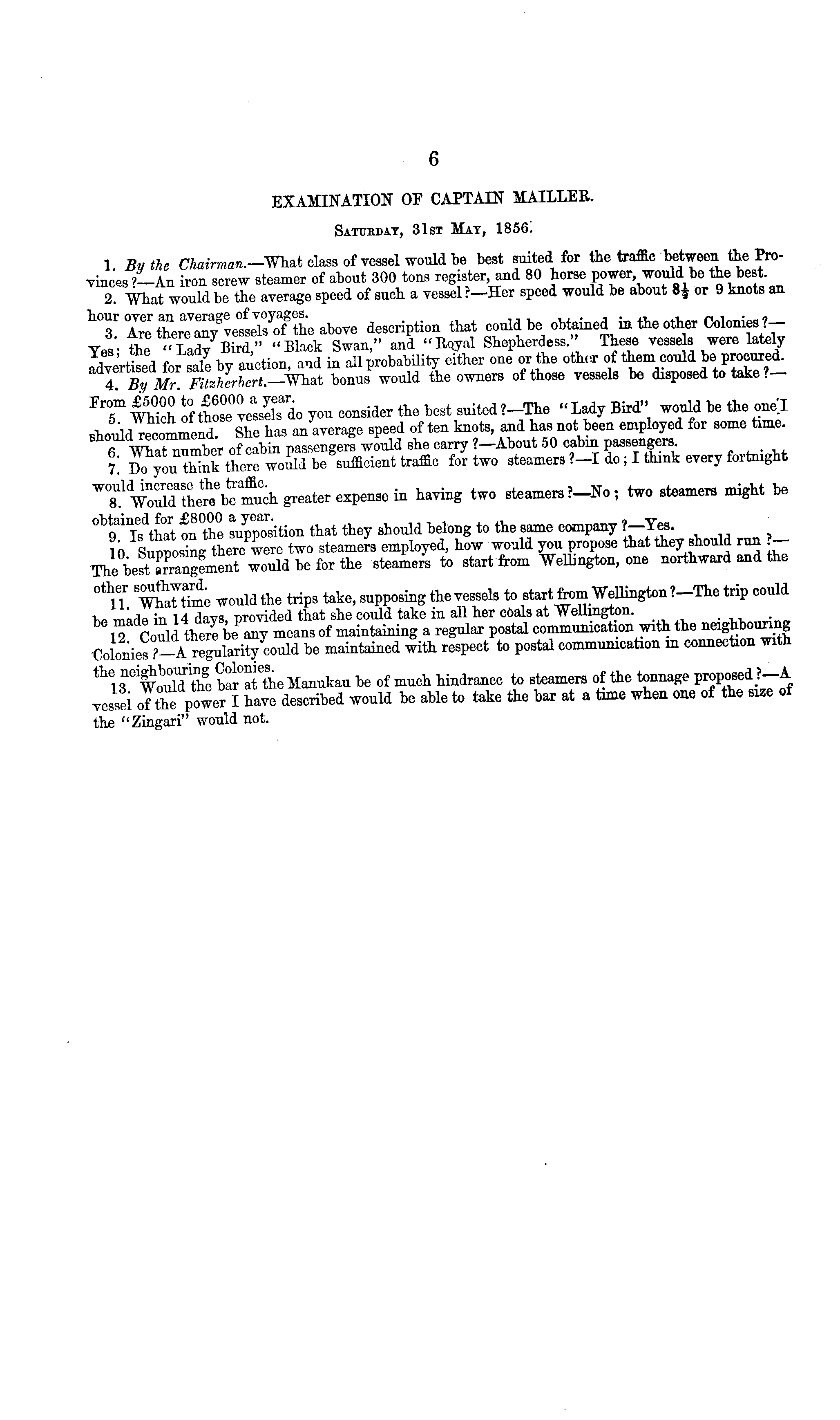 EXAMINATION OP CAPTAIN MAILLER. Saturday, 31st Mat, 1856! IBu the Chairman.—What class of vessel would be best suited for the traffic between the Provinces ?—An iron screw steamer of about 300 tons register and 80 horse power would be the best 2. What would be the average speed of such a vessel ?—Her speed would be about 8} or 9 knots an "T rXrJaTvefsroTthe above description that could be obtained in the other Colonies Yes' the " Lady Bird, Black Swan," and "Royal Shepherdess." These vessels were lately advertised for sale by auction, and in all probability either one or the other of them could Je procuxed. 4. By Mr. Fitzherbert.—What bonus would the owners of those vessels be disposed to take ?— F T Which of those" vesselTdo you consider the best suited ?—The "Lady Bird" would be the one'l should recommend. She has an average speed of ten knots, and has not been employed tor some time. r> Wbat number of cabin passengers would she carry ? —About 50 cabin passengers. 7. Do you think there would be sufficient traffic for two steamers ?— I do; I think every fortnight greater expense in having two steamers ?—No; two steamers might be °1 Ys\h° r it on°the supposition that they should belong to the same company ?—Yes. 10 Sunnosing there were two steamers employed, how would you propose that they should run . The best arrangement would be for the steamers to start from Wellington, one northward and the oth lT mSe would the trips take, supposing the vessels to start from Wellington ?_The trip could hp made in 14 days, provided that she could take in all her coals at Wellington. . . 12 Could there be any means of maintaining a regular postal communication with the neighbouring Colonies ?-A could be maintained with respect to postal communication in connection with the ncighbourin Col t^eMaiiukaii of much hindrance to steamers of the tonnage vessei of the power I have described would be able to take the bar at a time when one of the size of the "Zingari" would not.
