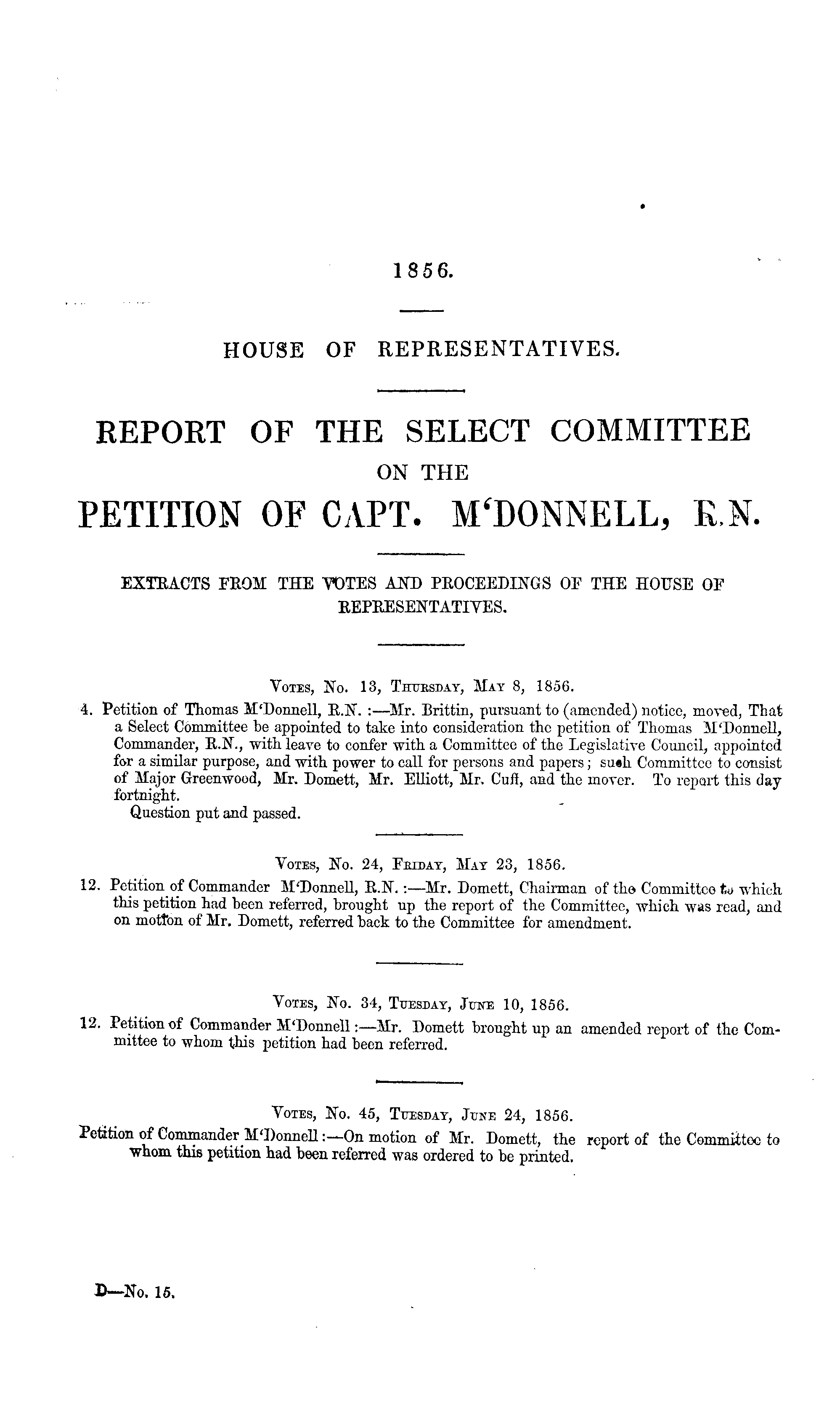 EXTRACTS FROM THE VOTES AND PROCEEDINGS OE THE HOUSE OE REPRESENTATIVES. Votes, No. 13, Thursday, May 8, 1856. 4. Petition of Thomas M'Donnell, R.N. : —Mr. Brittin, pursuant to (amended) notice, moved, That a Select Committee be appointed to take into consideration the petition of Thomas M'Donnell, Commander, R.N., with leave to confer with a Committee of the Legislative Council, appointed for a similar purpose, and with power to call for persons and papers; su«h Committee to consist of Major Greenwood, Mr. Domett, Mr. Elliott, Mr. Cuff, and the mover. To report this day fortnight. Question put and passed. Votes, No. 24, Fill hay, May 23, 1856. 12. Petition of Commander M'Donnell, R.N.:—Mr. Domett, Chairman of the Committee t.u which this petition had been referred, brought up the report of the Committee, which was read, and on motfon of Mr. Domett, referred back to the Committee for amendment. Votes, No. 34, Tuesday, Jtote 10, 1856. 12. Petition of Commander M'Donnell: —Mr. Domett brought up an amended report of the Committee to whom this petition had been referred. Votes, No. 45, Tuesday, June 24, 1856. Petition of Commander M'Donnell:—On motion of Mr. Domett, the report of the Committoe to whom this petition had been referred was ordered to be printed.