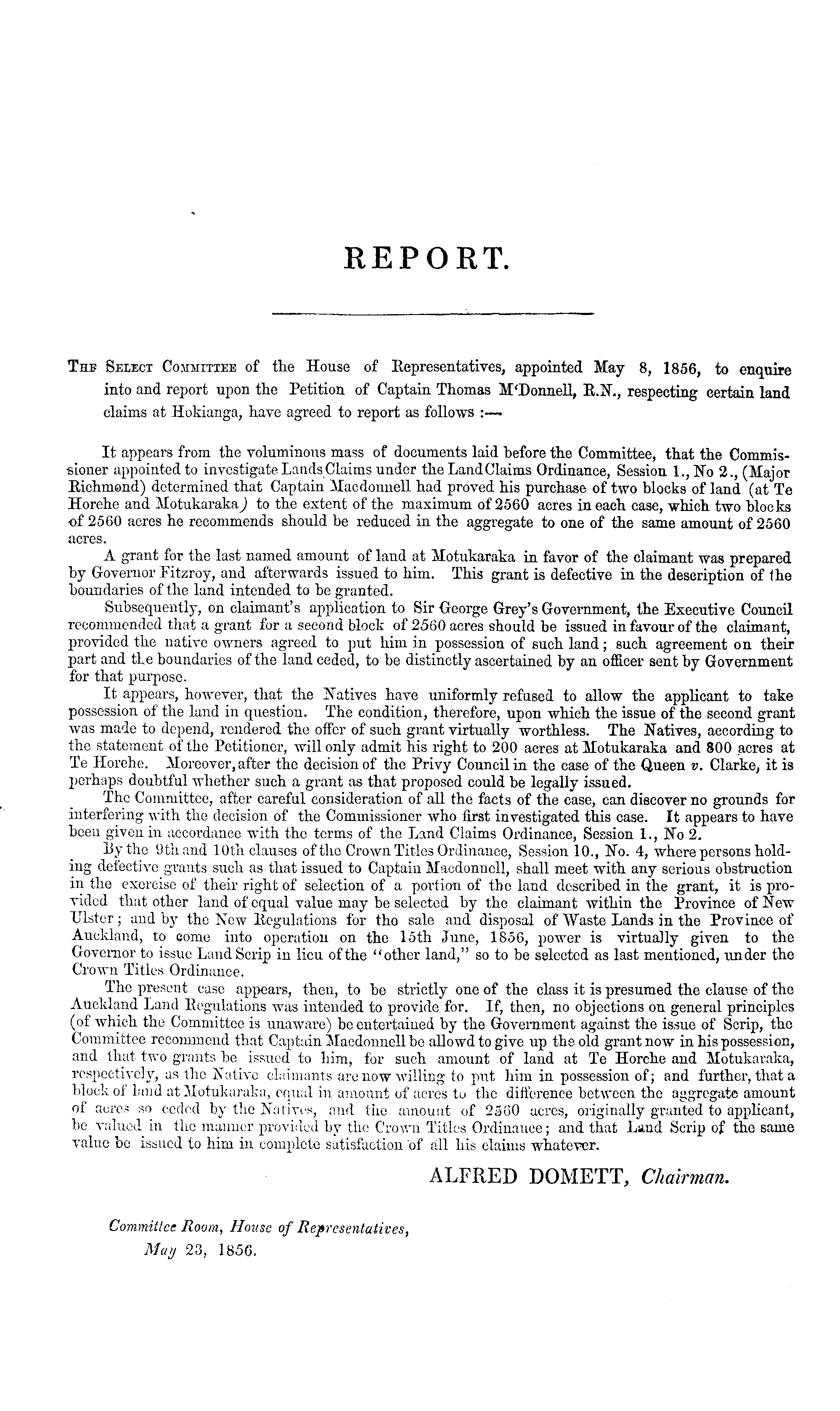 The Select Committee of the House of Representatives, appointed May 8, 1856, to enquire into and report upon the Petition of Captain Thomas M'Donnell, 11.X., respecting certain land claims at Hokianga, have agreed to report as follows :— It appears from the voluminous mass of documents laid before the Committee, that the Commissioner appointed to investigate Lands Claims under the Land Claims Ordinance, Session 1., No 2., (Major Eichmond) determined that Captain Macdonnell had proved his purchase of two blocks of land (at Te Horehe and Motukaraka) to the extent of the maximum of 2560 acres in each case, which two blocks of 2560 acres he recommends should be reduced in the aggregate to one of the same amount of 2560 acres. A grant for the last named amount of land at Motukaraka in favor of the claimant was prepared by Governor Fitzroy, and afterwards issued to him. This grant is defective in the description of ihe boundaries of the land intended to be granted. Subsequently, on claimant's application to Sir George Grey's Government, the Executive Council recommended that a grant for a second block of 2560 acres should be issued in favour of the claimant, provided the native owners agreed to put him in possession of such land; such agreement on their part and tLe boundaries of the land ceded, to be distinctly ascertained by an officer sent by Government for that purpose. It appears, however, that the Natives have uniformly refused to allow the applicant to take possession of the land in question. The condition, therefore, upon which the issue of the second grant was made to depend, rendered the offer of such grant virtually worthless. The Natives, according to the statement of the Petitioner, will only admit his right to 200 acres at Motukaraka and 800 acres at Te Horehe. Moreover, after the decision of the Privy Council in the case of the Queen v. Clarke, it is perhaps doubtful whether such a grant as that proposed could be legally issued. The Committee, after careful consideration of all the facts of the case, can discover no grounds for interfering with the decision of the Commissioner who first investigated this case. It appears to have been given in accordance with the terms of the Land Claims Ordinance, Session 1., No 2. By the 9th and 10th clauses of the Crown Titles Ordinance, Session 10., No. 4, where persons holding defective grants such as that issued to Captain Macdonnell, shall meet with any serious obstruction in the exorcise of their right of selection of a portion of the land described in the grant, it is provided that other land of equal value may be selected by the claimant within the Province of New Ulster; and by the New Eegulations for tho sale and disposal of "Waste Lands in the Province of Auckland, to come into operation on the 15th June, 1856, power is virtually given to the Governor to issue Laud Scrip in lieu of the "other land," so to be selected as last mentioned, under tho Crown Titles Ordinance. The present case appears, then, to be strictly one of the class it is presumed the clause of the Auckland Land Eegulations was intended to provide for. If, then, no objections on general principles (of which the Committee is unaware) be entertained by the Government against the issue of Scrip, the Committee recommend that Captain Macdonnell be allowd to give up the old grant now in his possession, and that two grants be issued to him, for such amount of land at Te Horehe and Motukaraka, respectively, as tho Native claimants are now willing to put him in possession of; and further, that a block of land at Motukaraka, equal in amount of acres to the difference between the aggregate amount of acres so ceded by the Natives, and the amount of 2560 acres, originally granted to applicant, be valued in the manner provided by the Crown Titles Ordinance; and that Land Scrip of the same value be issued to him iu complete satisfaction of all his claims whatever. ALFRED DOMETT, Chairman. Committee Room, House of Representatives, May 23, 1856.