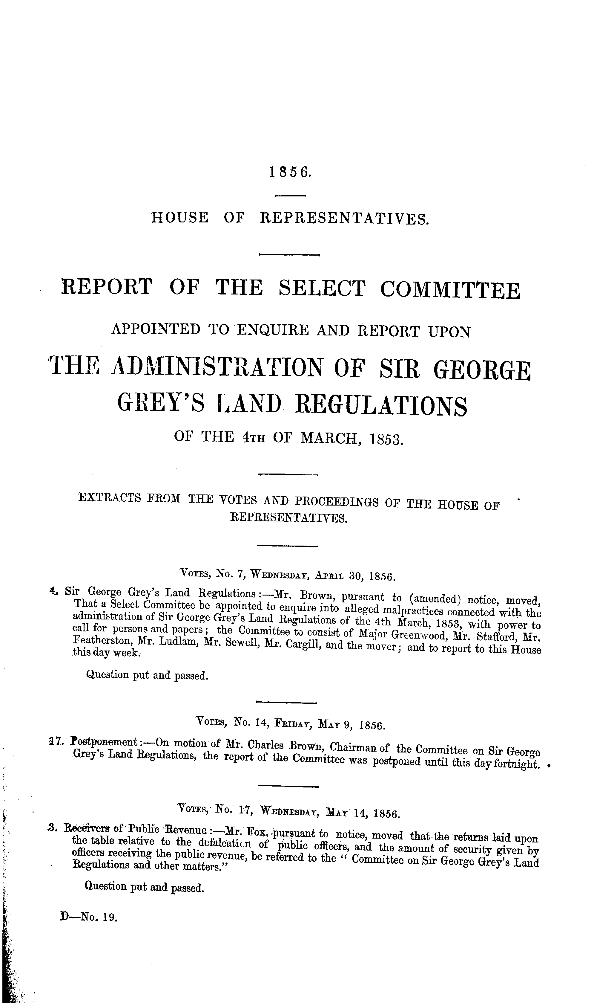 REPORT OF THE SELECT COMMITTEE APPOINTED TO ENQUIRE AND REPORT UPON THE ADMINISTRATION OF SIR GEORGE GREY'S LAND REGULATIONS OF THE 4th OF MARCH, 1853.