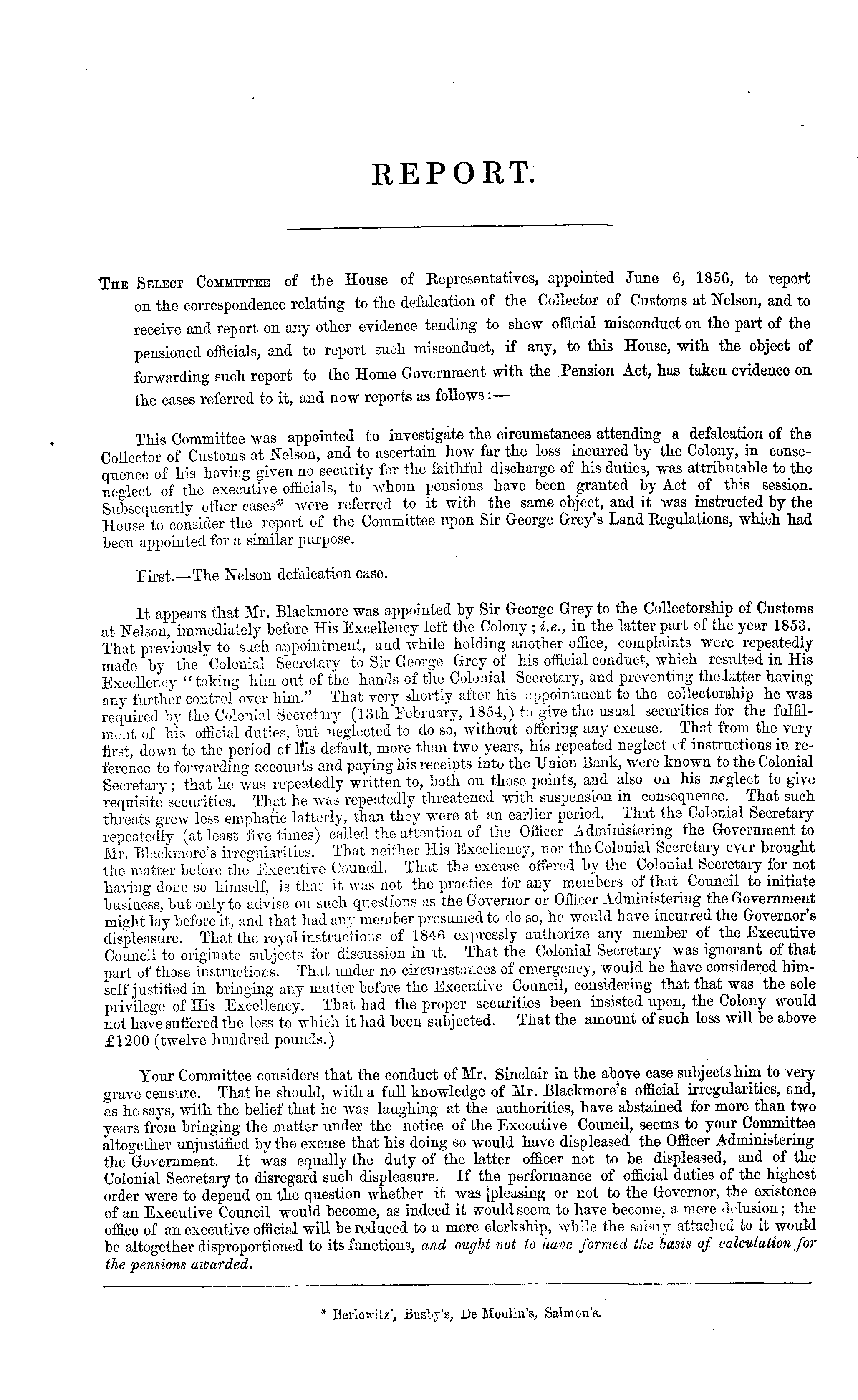 The Select Committee of the House of Representatives, appointed June 6, 1856, to report on the correspondence relating to the defalcation of the Collector of Customs at Nelson, and to receive and report on any other evidence tending to shew official misconduct on the pait of the pensioned officials, and to report such misconduct, if any, to this House, with the object of forwarding such report to the Home Government, with the Pension Act, has taken evidence on the cases referred to it, and now reports as follows: — This Committee was appointed to investigate the circumstances attending a defalcation of the Collector of Customs at Nelson, and to ascertain how far the loss incurred by the Colony, in consequence of his having given no security for the faithful discharge of his duties, was attributable to the neglect of the executive officials, to" whom pensions have been granted by Act of this session. Subsequently other eases* were referred to it with the same object, and it was instructed by the House to consider the report of the Committee upon Sir George Grey's Land Regulations, which had been appointed for a similar purpose. First. —The Nelson defalcation case. It appears that Mr. Blackmore was appointed by Sir George Grey to the Collectorship of Customs at Nelson, immediately before His Excellency left the Colony ; i.e., in the latter part of the year 1853. That previously to such appointment, and while holding another office, complaints were repeatedly made by the Colonial Secretary to Sir George Grey of his official conduct, which resulted in His Excellency " taking him out of the hands of the Colonial Secretary, and preventing thelatter having any further control over him." That very shortly after his [>pointment to the collectorship he was required by the Colonial Secretary (13th February, 1854,) i ■ give the usual securities for the fulfilment of his official duties, but neglected to do so, without offering any excuse. That from the very first, down to the period of ifis default, more than two years, his repeated neglect of instructions m reference to forwarding accounts and paying his receipts into the Union Bank, were known to the Colonial Secretary; that ho was repeatedly written to, both on those points, and also on his nf gleet to give requisite securities. That he was repeatedly threatened with suspension in consequence. That such threats grew less emphatic latterly, than they were at an earlier period. Ihat the colonial Secretary repeatedly (at least five times) called the attention of the Officer Administering the Government to Mr. Blackmore's irregularities. That neither iiis Excellency, nor the Colonial Secretaiy c\t t biought the matter before the Executive Council. That the excuse offered by the Colonial Secretaiy for not having done so himself, is that it was not the practice for any members of that _ Council to initiate business, but only to advise on such questions as the Governor or Officer Administering the Government might lay before it, and that had any member presumed to do so, he would bave incuiied the Governor s displeasure. That the royal instructions of 1846 expressly authorise any member of the Executive Council to originate subjects for discussion in it. That the Colonial Secretary was ignorant oi that part of those instructions. That under no circumstances of emergency, would he have considered himself justified in bringing any matter before the Executive Oouncil, considering that that was the sole privilege of His Excellency. That had the proper securities been insisted upon, the Colony would not have suffered the loss to which it had been subjected. That the amount ot such loss will be above £1200 (twelve hundred pounds.) Your Committee considers that the conduct of Mr. Sinclair in the above case subjects him to very grave censure. That he should, with a full knowledge of Mr. Blackmore's official irregularities, and, as ho says, with the belief that he was laughing at the authorities, have abstained for more than two years from bringing the matter under the notice of the Executive Council, seems to your Committee altogether unjustified by the excuse that his doing so would have displeased the Officer Administering the Government. It was equally the duty of the latter officer not to be displeased, and of the Colonial Secretary to disregard such displeasure. If the performance of official duties of the highest order were to depend on the question whether it was [pleasing or not to the Governor, the existence of an Executive Council would become, as indeed it would seem to have become, a mere : lusion; the office of an executive official will be reduced to a mere clerkship, while the saiai y 1 *'- io it would be altogether disproportioned to its functions, and ought nut to haw formed the basis of calculation for the pensions awarded.