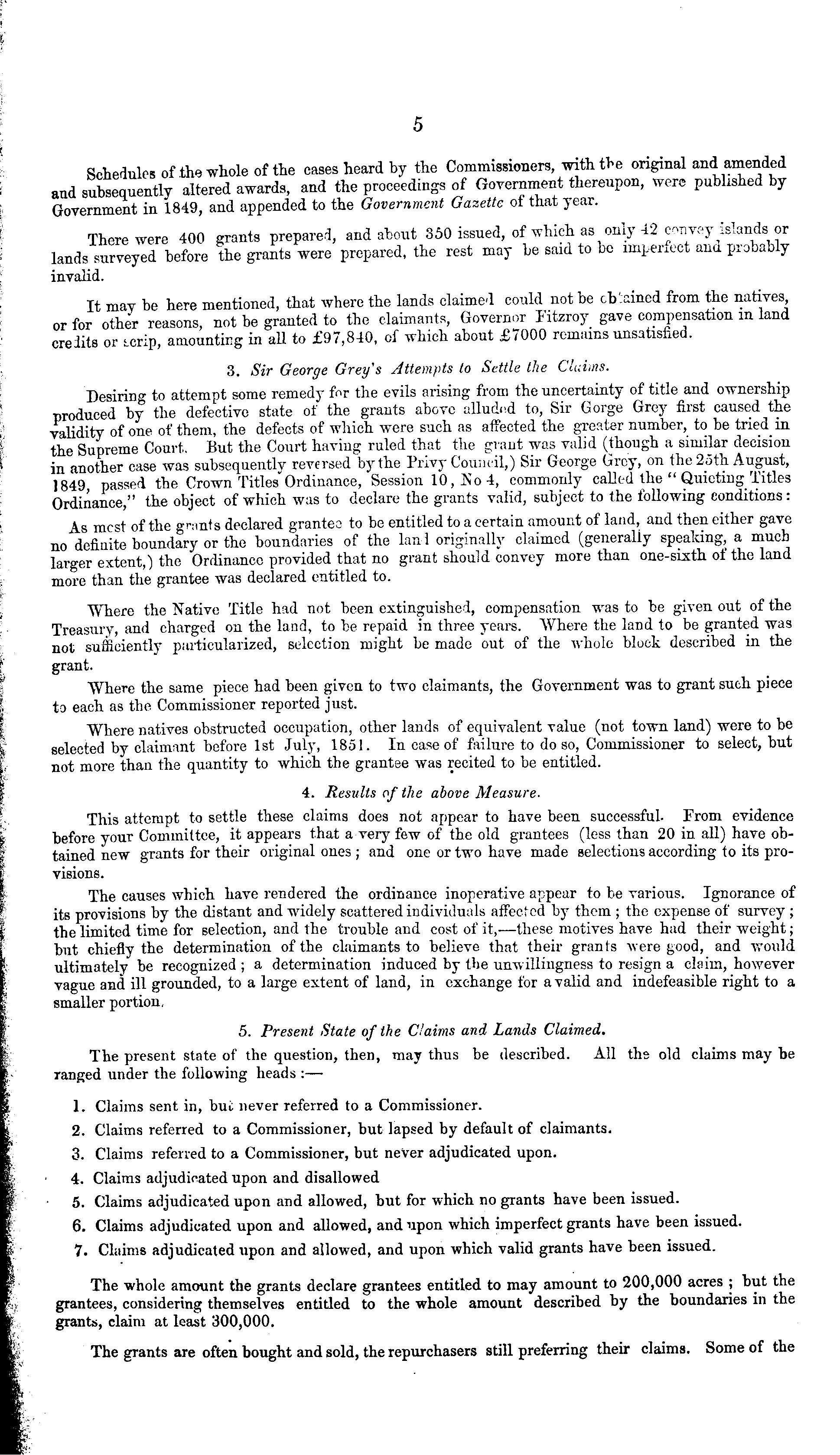 Schedules of the whole of the cases hoard by the Commissioners, with the original and amended and subsequently altered awards, and the proceedings of Government thereupon, were published by Government in 1849, and appended to the Government Gazette of that year. There were 400 grants prepare'!, and about 350 issued, of which as only 42 corv. y islands or lands surveyed before the grants were prepared, the rest may be said to bo impenect and probably invalid. It may be here mentioned, that where the lands claimed could not be obtained from the natives or for other reasons, not be granted to the claimants, Governor Fitzroy gave compensation m land credits or tcrip, amounting in all to £97,840, of which about £7000 remains unsatisfied. 3. Sir George Grey's Attempts to Settle the Claims. Desiring to attempt some remedy for the evils arising from the uncertainty of title and ownership produced by the defective state of the grants above alluded to, Sir Gorge Grey fiist caused the validity of one of them, the defects of which were such as affected the greater number, to be tried in the Supreme Court, But the Court having ruled that the grant was valid (though a similar decision in another ease was subsequently reversed by the Privy Council,) Sir George Grey, on the 25th August, 1849 passed the Crown Titles" Ordinance, Session 10, No 4, commonly called the " Quieting Titles Ordinance," the object of which was to declare the grants valid, subject to the following conditions : As mcst of the grants declared grantee to be entitled to a certain amount of land, and then either gave no definite boundary or the boundaries of the land originally claimed (generally speaking, a much larger extent,) the Ordinance provided that no grant should convey more than one-sixth of the land more than the grantee was declared entitled to. Where the Native Title had not been extinguished, compensation was to be given out of the Treasury, and charged on the land, to be repaid in three years. Where the land to be granted was not sufficiently particularized, selection might be made out of the whole block described in the grant. Where the same piece had been given to two claimants, the Government was to grant such piece to each as the Commissioner reported just. Where natives obstructed occupation, other lands of equivalent value (not town land) were to be selected by claimant before Ist July, 1851. In case of failure to do so, Commissioner to select, but not more than the quantity to which the grantee was recited to be entitled. 4. Results of the above Measure. This attempt to settle these claims does not appear to have been successful. From evidence before your Committee, it appears that a very few of the old grantees (less than 20 in all) have obtained new grants for their original ones ; and one or two have made selections according to its provisions. The causes which have rendered the ordinance inoperative appear to be various. Ignorance of its provisions by the distant and widely scattered individuals affected by them ; the expense of survey ; the limited time for selection, and the trouble and cost of it, —these motives have had their weight; but chiefly the determination of the claimants to believe that their grants were good, and would ultimately be recognized ; a determination induced by the unwillingness to resign a claim, however vague and ill grounded, to a large extent of land, in exchange for a valid and indefeasible right to a smaller portion. 5. Present State of the Claims and Lands Claimed. The present state of the question, then, may thus be described. All tlis old claims may be ranged under the following heads : — 1. Claims sent in, but never referred to a Commissioner. 2. Claims referred to a Commissioner, but lapsed by default of claimants. 3. Claims referred to a Commissioner, but never adjudicated upon. 4. Claims adjudicated upon and disallowed 5. Claims adjudicated upon and allowed, but for which no grants have been issued. 6. Claims adjudicated upon and allowed, and upon which imperfect grants have been issued. 7. Claims adjudicated upon and allowed, and upon which valid grants have been issued. The whole amount the grants declare grantees entitled to may amount to 200,000 acres ; but the grantees, considering themselves entitled to the whole amount described by the boundaries in the grants, claim at least 300,000. The grants are often bought and sold, the repurchasers still preferring their claims. Some of the