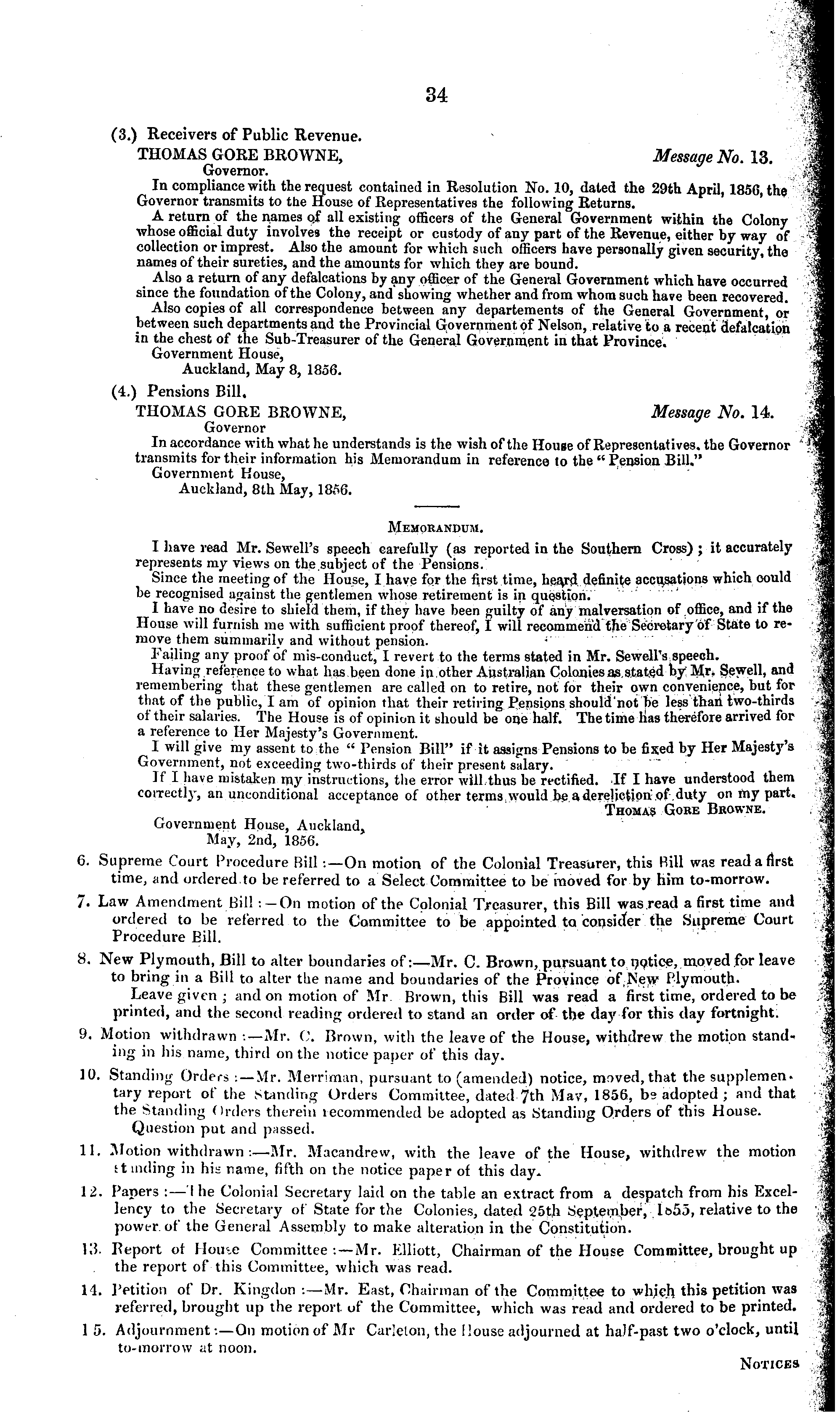 (3.) Receivers of Public Revenue. THOMAS GORE BROWNE, Message No. 13. Governor. In compliance with the request contained in Resolution No. 10, dated the 29th April, 1850, the Governor transmits to the House of Representatives the following Returns. A return of the names of all existing officers of the General Government within the Colony whose official duty involves the receipt or custody of any part of the Revenue, either by way of collection or imprest. Also the amount for which such officers have personally given security, the names of their sureties, and the amounts for which they are bound. Also a return of any defalcations by any officer of the General Government which have occurred since the foundation of the Colony, and showing whether and from whom such have been recovered. Also copies of all correspondence between any departements of the General Government or between such departments and the Provincial Government of Nelson, relative to a recent defalcation in the chest of the Sub-Treasurer of the General Government in that Province. Government House, Auckland, May 8, 1856. (4.) Pensions Bill, THOMAS GORE BROWNE, Message No. 14. Governor In accordance with what he understands is the wish of the House of Representatives, the Governor transmits for their information his Memorandum in reference to the " Pension Bill." Government House, Auckland, Bth May, 1856. Memorandum. I have read Mr. Sewell's speech carefully (as reported in the Southern Cross) ; it accurately represents my views on the subject of the Pensions. Since the meeting of the House, I have for the first time, heard definite accusations which oould be recognised against the gentlemen whose retirement is in question. I have no desire to shield them, if they have been guilty of any malversation of office, and if the House will furnish me with sufficient proof thereof, I will recommend the Secretary of State to remove them summarily and without pension. Failing any proof of mis-conduct, I revert to the terms stated in Mr. Sewell's speech. Having reference to what has been done in other Australian Colonies as stated by Mr. Sewell, and remembering that these gentlemen are called on to retire, not for their own convenience, but for tli.it of the public, I am of opinion that their retiring Pensions should not be less than two-thirds ot their salaries. The House is of opinion it should be one half. The time has therefore arrived for a reference to Her Majesty's Government. I will give my assent to the " Pension Bill" if it assigns Pensions to be fixed by Her Majesty's Government, not exceeding two-thirds of their present salary. If I have mistaken my instructions, the error will thus be rectified. If I have understood them correctly, an unconditional acceptance of other terms would be a dereliction of duty on my part, Thomas Gore Browne. Government House, Auckland, May, 2nd, 1856. 6. Supreme Court Procedure Bill On motion of the Colonial Treasurer, this Rill was read a first time, and ordered to be referred to a Select Committee to be moved for by him to-morrow. /. Law Amendment Bill :— On motion of the Colonial Treasurer, this Bill was read a first time and ordered to be referred to the Committee to be appointed to consider the Supreme Court Procedure Bill. 8. New Plymouth, Bill to alter boundaries of: —Mr. C. Brown, pursuant to notice, moved for leave to bring in a Bill to alter the name and boundaries of the Province of New Plymouth. Leave given ; and on motion of Mr. Brown, this Bill was read a first time, ordered to be printed, and the second reading ordered to stand an order of the day for this day fortnight. 9. Motion withdrawn :—Mr. C. Brown, with the leave of the House, withdrew the motion standing in his name, third on the notice paper of this day. 10. Standing Orders :—Mr. Merriman, pursuant to (amended) notice, moved, that the supplementary report of the Standing Orders Committee, dated 7th Mav, 1856, be adopted ; and that the Standing Orders therein recommended be adopted as Standing Orders of this House. Question put and passed. 11. Motion withdrawn .—Mr. Macandrew, with the leave of the House, withdrew the motion it mding in his name, fifth on the notice paper of this day. 12. Papers : —I lie Colonial Secretary laid on the table an extract from a despatch from his Excellency to the Secretary of State for the Colonies, dated 25th September, 1&55, relative to the power of the General Assembly to make alteration in the Constitution. K5. Report ot Home Committee :—Mr. Elliott, Chairman of the House Committee, brought up the report of this Committee, which was read. 14. Petition of Dr. Kingdon :—Mr. East, Chairman of the Committee to which this petition was referred, brought up the report of the Committee, which was read and ordered to be printed. 1 5. Adjournment:—On motion of Mr Carleton, the House adjourned at liaJf-past two o'clock, until to-morrow at noon. Notices