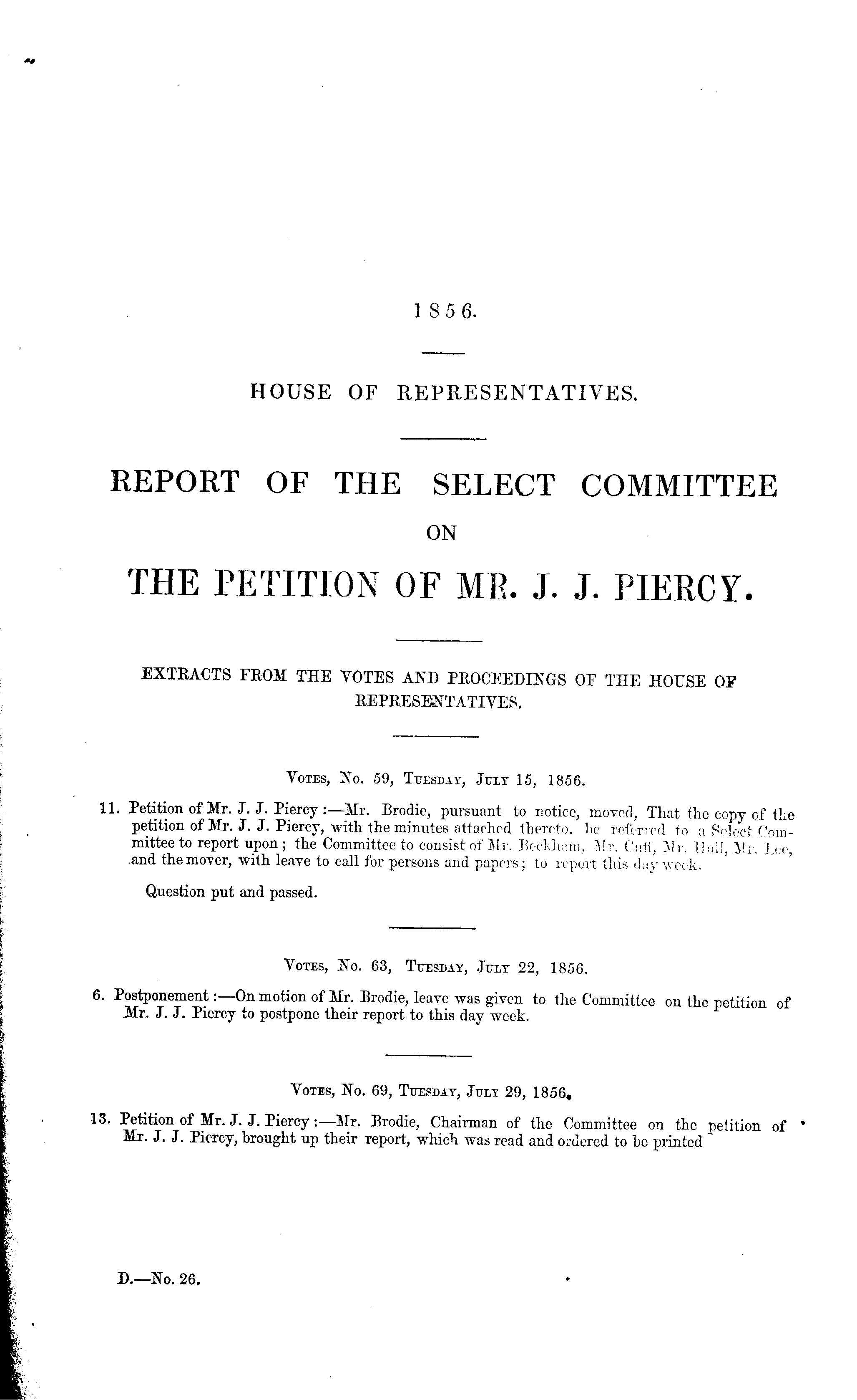 Votes, No. 69, Tuesday, July 29, 1856. 13. Petition of Mr. J. J. Piercy:—Mr. Brodie, Chairman of the Committee on the petition of Mr. J. J. Piercy, brought up their report, which was read and ordered to be printed