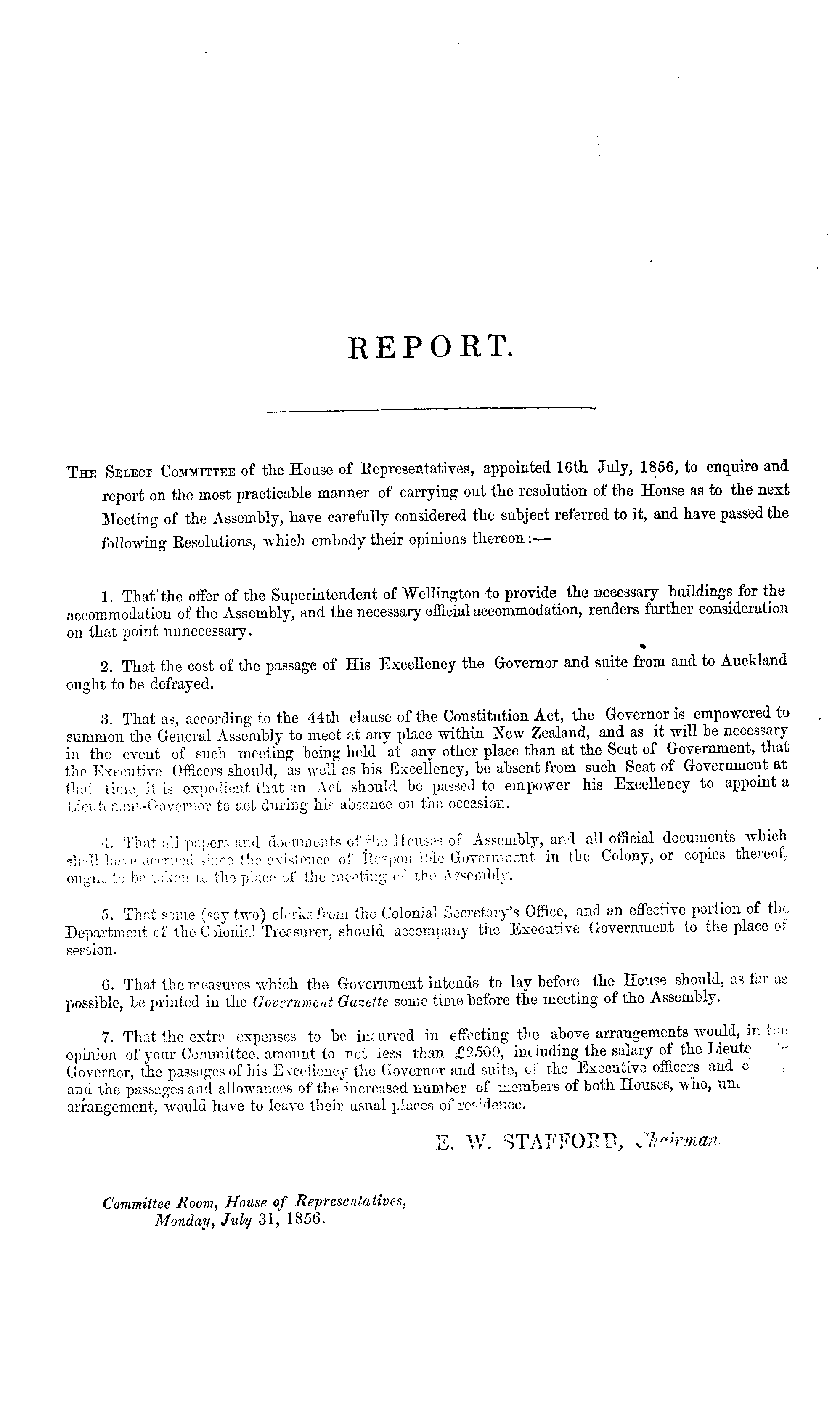 The Select Committee of the House of Representatives, appointed 16th July, 1856, to enquire and report on the most practicable manner of carrying out the resolution of the House as to the next Meeting of the Assembly, have carefully considered the subject referred to it, and have passed the following Resolutions, which embody their opinions thereon : — 1. That'the offer of the Superintendent of Wellington to provide the necessary buildings for the accommodation of the Assembly, and the necessary official accommodation, renders further consideration on that point unnecessary. % 2. That the cost of the passage of His Excellency the Governor and suite from and to Auckland ought to be defrayed. 3. That as, according to the 44th clause of the Constitution Act, the Governor is empowered to summon the General Assembly to meet at any place within New Zealand, and as it will be necessary in the event of such meeting being held at any other place than at the Seat of Government, that the Executive Officers should, as well as his Excellency, be absent from such of Government at that time, it is expedient that an Act should be passed to empower his Excellency to appoint a Lieutenant-Governor to act duxing his absence on the occasion. 4. That all papers and documents of the Houses of Assembly, and all official documents which shall have accrued since the existence of Respon ible Government in the Colony, or copies theieo ought to be taken to the place of the meeting of the Assembly. 5. That some (say two) clerks from the Colonial Secretary's Office, and an effective portion of the Department of the Colonial Treasurer, should accompany the Executive Government to the place ol session. 6. That the measures which the Government intends to lay before the House should,, as fai as possible, be printed in the Government Gazette some time before the meeting of the Assembly. 7. That the extra expenses to be incurred in effecting the above arrangements would, in u.i opinion of your Committee, amount to net less than £2500, ini l uding the salary ot the Lieute Governor, the passages of his Excellency the Governor and suite, o; the Executive officers and c and the passages and allowances of the increased number of members of both Houses, who, unt. arrangement, would have to leave their usual places of residence. E. W. STAFFORD, Chairman Committee Room, House of Representatives, Monday, July 31, 1856.