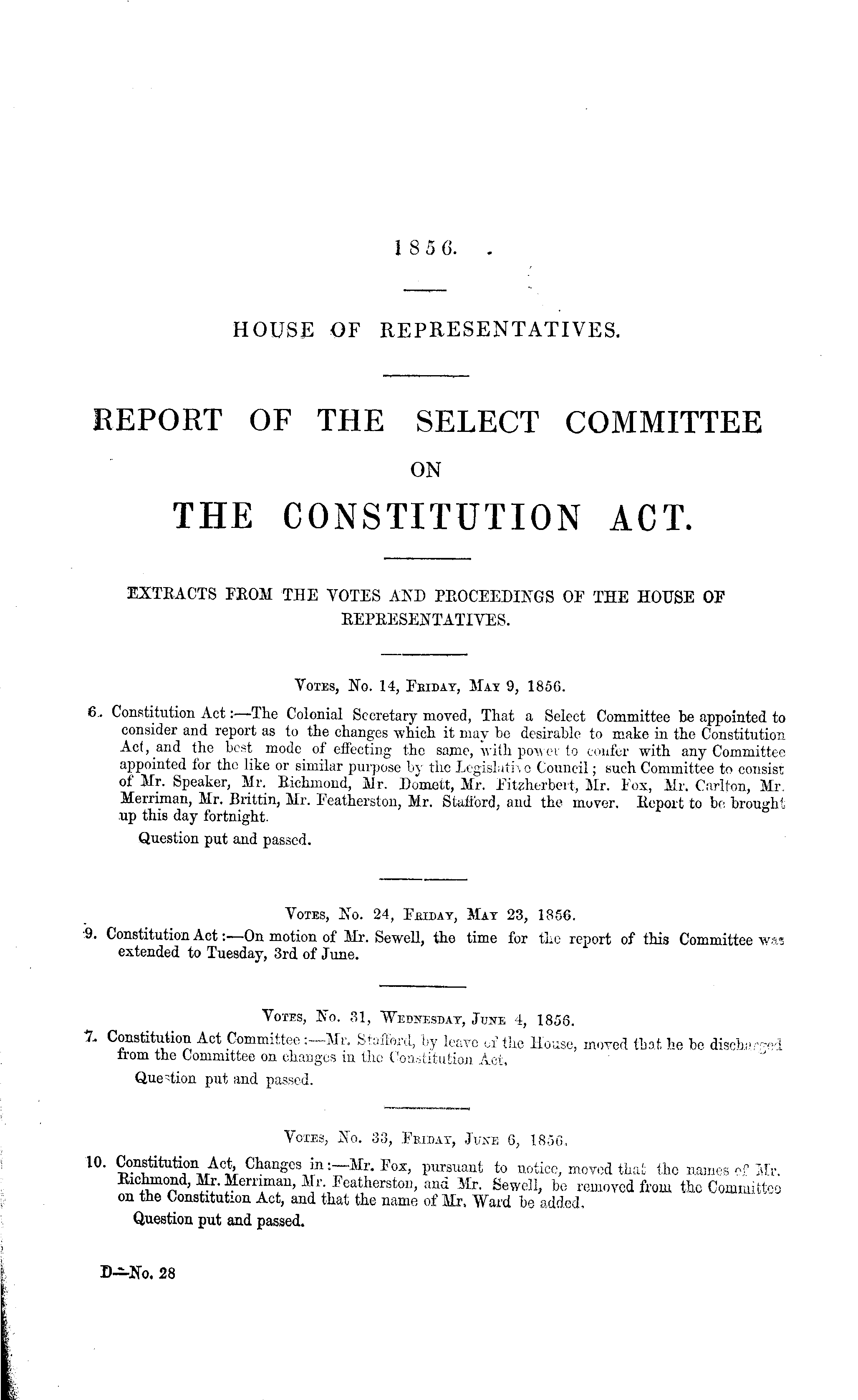 Votes, No. 33, Friday, June 6, 1856. 10. Constitution Act, Changes inMr. Fox, pursuant to notice, moved that the names of Mr. ; Merrl i mau > Ml - Featherston, ana Mr. Sewell, be removed from the Committee on the Constitution Act, and that the name of Mr. "Ward be added. Question put and passed. D—No. 28