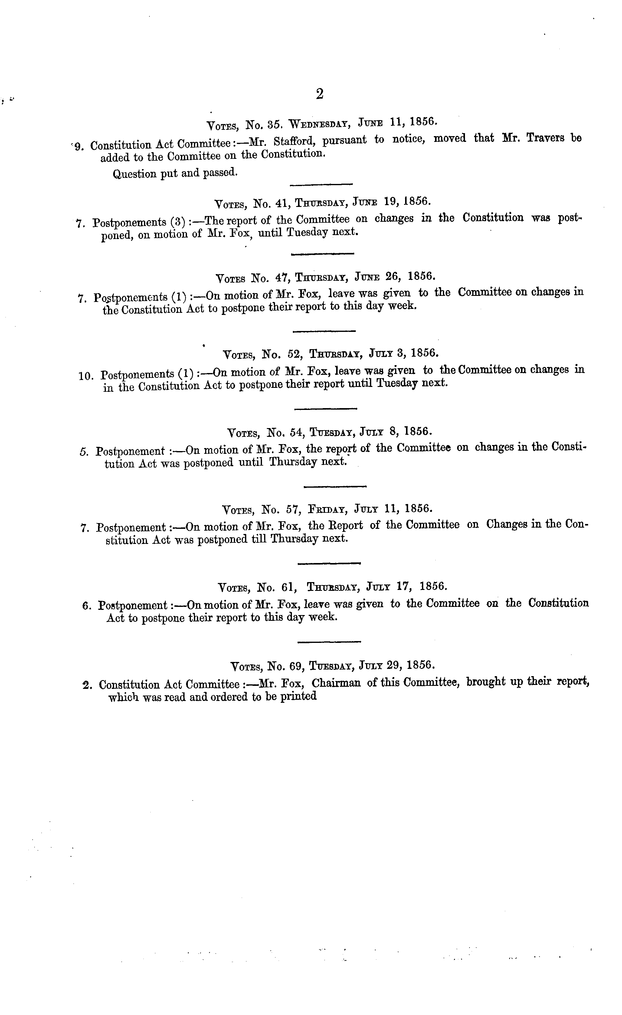Votes, No. 35. "Wednesday, Jtjne 11, 1856. 9. Constitution Act Committee :-Mr. Stafford, pursuant to notice, moved that Mr. Travers be added to the Committee on the Constitution. Question put and passed. Votes, No. 41, Thursday, June 19, 1856. 7. Postponements (3) The report of the Committee on changes in the Constitution was postponed, on motion of Mr. Fox j until Tuesday next. Votes No. 47, Thursday, June 26, 1856. 7 Postponements (1) On motion of Mr. Fox, leave was given to the Committee on changes in the Constitution Act to postpone their report to this day week. Votes, No. 52, Thursday, July 3, 1856. 10 Postponements (1)On motion of Mr. Fox, leave was given to the Committee on changes in in the Constitution Act to postpone their report until Tuesday next. Votes, No. 54, Tuesday, July 8, 1856. 5. Postponement On motion of Mr. Fox, the report of the Committee on changes in the Constitution Act was postponed until Thursday next. Votes, No. 57, Friday, July 11, 1856. 7. PostponementOn motion of Mr. Fox, the Report of the Committee on Changes in the Constitution Act was postponed till Thursday next. Votes, No. 61, Thursday, July 17, 1856. 6. Postponement: —On motion of Mr. Fox, leave was given to the Committee on the Constitution Act to postpone their report to this day week. Votes, No. 69, Tuesday, July 29, 1856. 2. Constitution Act Committee : —Mr. Fox, Chairman of this Committee, brought up their report, which was read and ordered to be printed