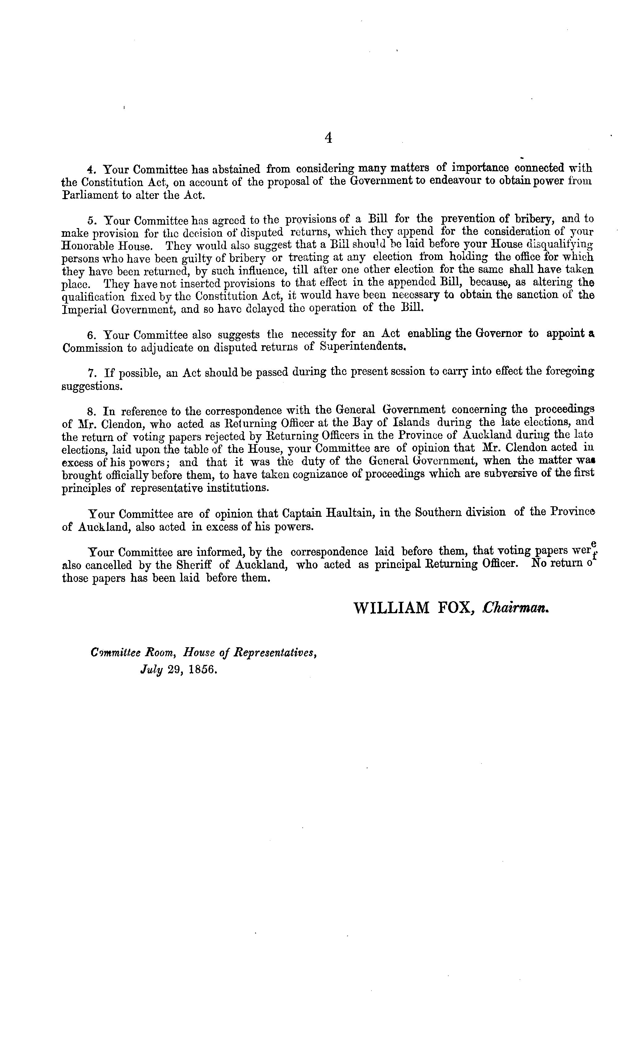4. Tour Committee has abstained from considering many matters of importance connected w;th the Constitution Act, on account of the proposal of the Government to endeavour to obtain power from Parliament to alter the Act. 5. Tour Committee has agreed to the provisions of a Bill for the prevention of bribery, and to make provision for the decision of disputed returns, which they append for the consideration of your Honorable House. They would also suggest that a Bill should bo laid before your House disqualifying persons who have been guilty of bribery or treating at any election from holding the office for which they have been returned, by such influence, till after one other election for the same shall have taken place. They have not inserted provisions to that effect in tbe appended Bill, because, as altering the qualification fixed by the Constitution Act, it would have been necessary to obtain the sanction of the Imperial Government, and so have delayed the operation of the Bill. 6. Tour Committee also suggests the necessity for an Act enabling the Governor to appoint a Commission to adjudicate on disputed returns of Superintendents. 7. If possible, an Act should be passed during the present session to carry into effect the foregoing suggestions. 8. In reference to the correspondence with the General Government concerning the proceedings of Mr. Clendon, who acted as Returning Officer at the Bay of Islands during the late elections, and the return of voting papers rejected by Returning Officers in the Province of Auckland during the late elections, laid upon the table of the House, your Committee are of opinion that Mr. Clendon acted in excess of his powers; and that it was the duty of the General Government, when the matter wat brought officially before them, to have taken cognizance of proceedings which are subversive of the first principles of representative institutions. Tour Committee are of opinion that Captain Haultain, in the Southern division of the Province of Auckland, also acted in excess of his powers. Q Tour Committee are informed, by the correspondence laid before them, that voting papers also cancelled by the Sheriff of Auckland, who acted as principal Returning Officer. No return o those papers has been laid before them. WILLIAM FOX, Chairman. Committee Room, House o/ Representatives, July 29, 1856.